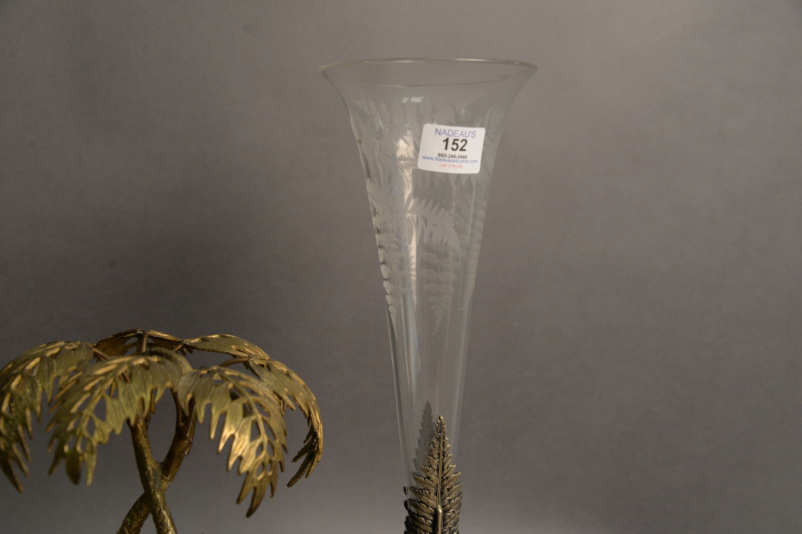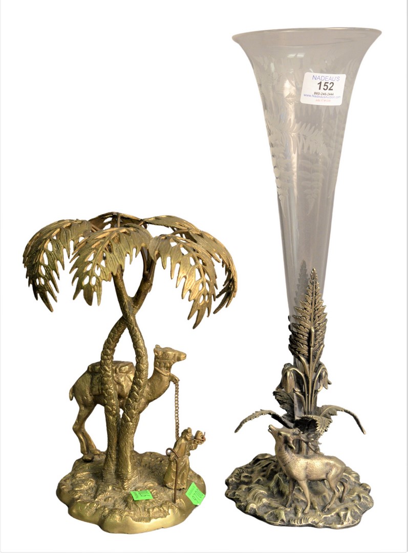 Lot 152: Two Piece Lot, to include an etched glass trumpet vase with a brass stag base, along with a brass sculpture having a camel under a palm tree tied to a figure of a man, vase height 16 1/2 inches, stag 10 inches high. Provenance: Estate of James Wadhams.