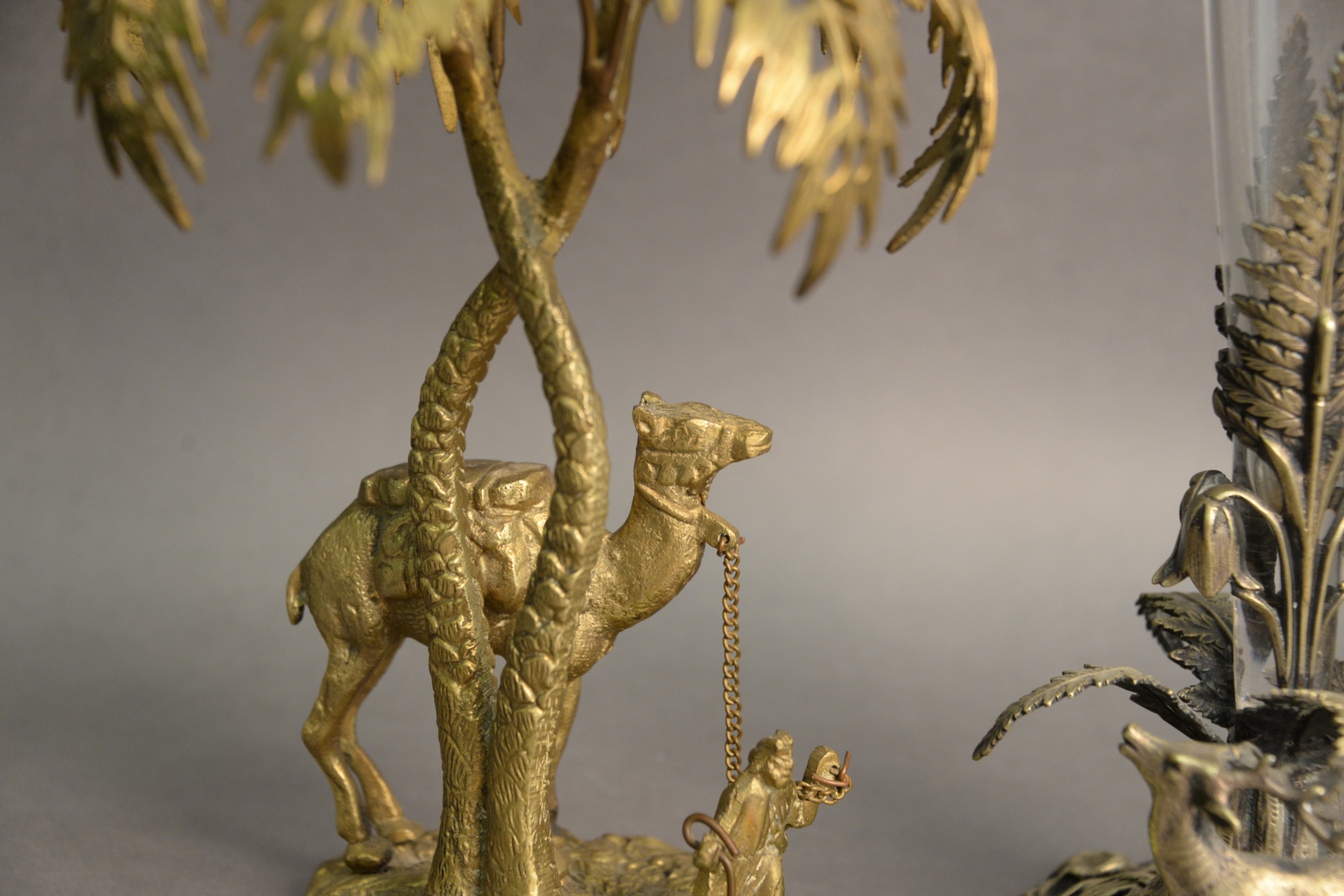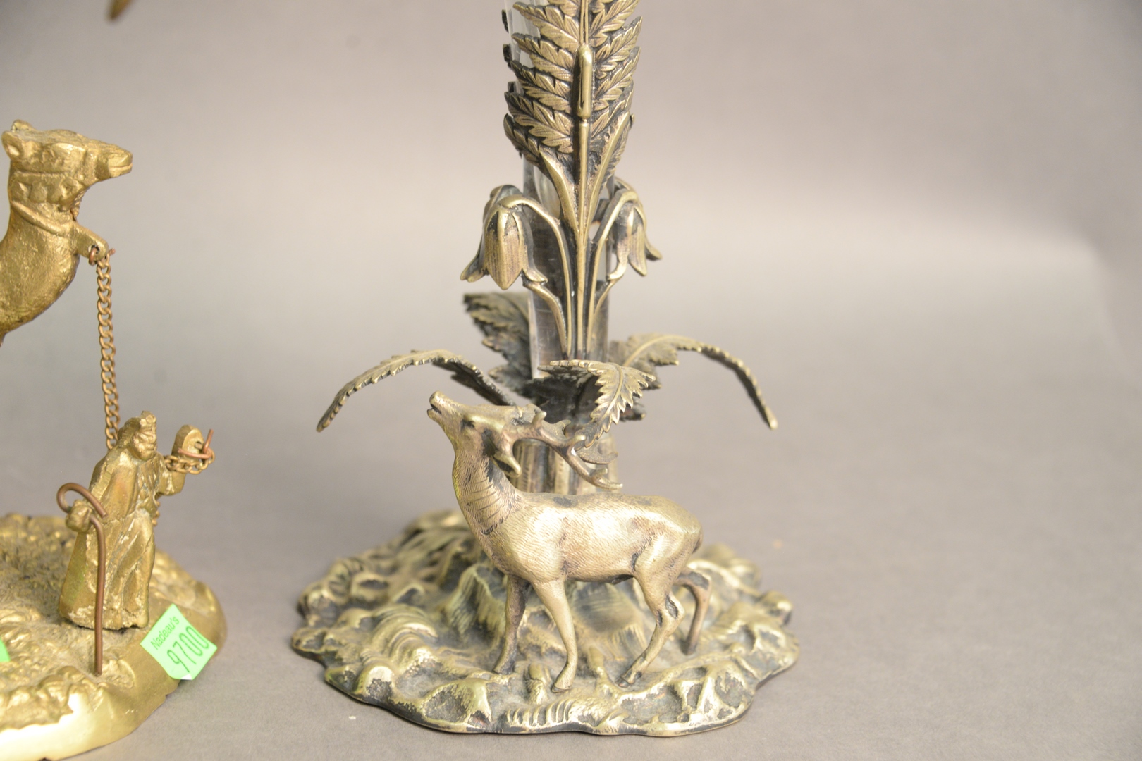 Two Piece Lot, to include an etched glass trumpet vase with a brass stag base, along with a brass sculpture having a camel under a palm tree tied to a figure of a man, vase height 16 1/2 inches, stag 10 inches high. Provenance: Estate of James Wadhams.