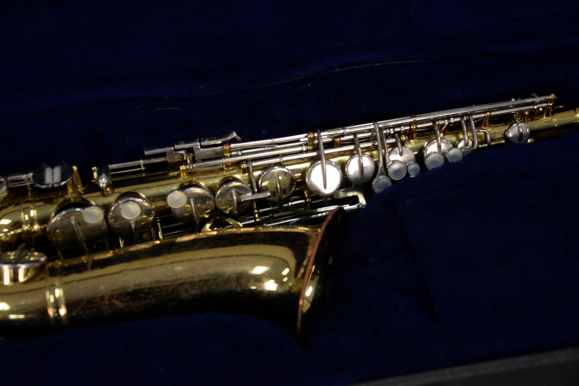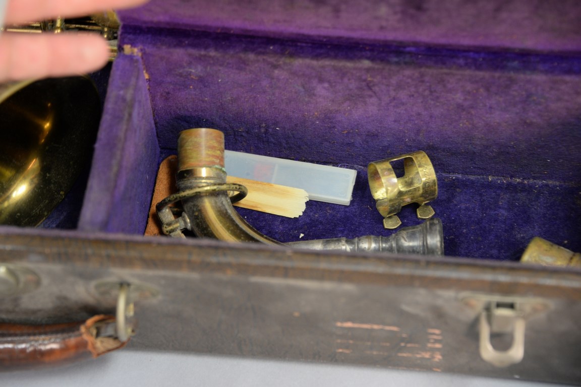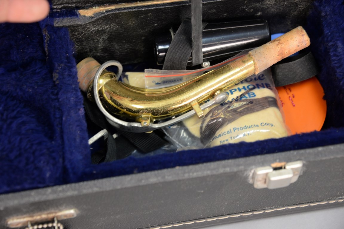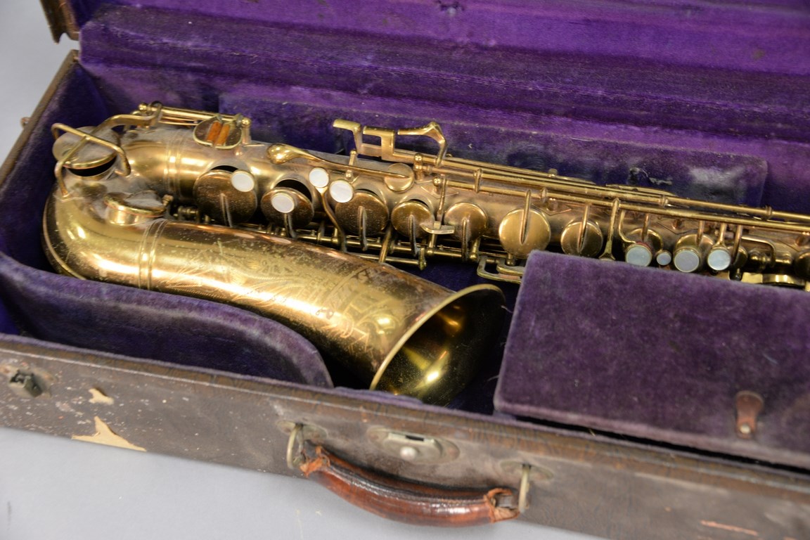Two saxophones including King 613 and Buescher Aristocrat Elkhart. lg. 22 in.