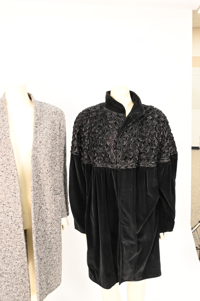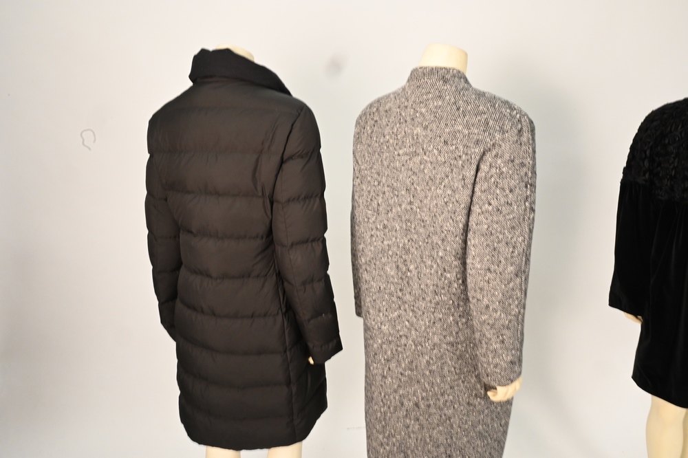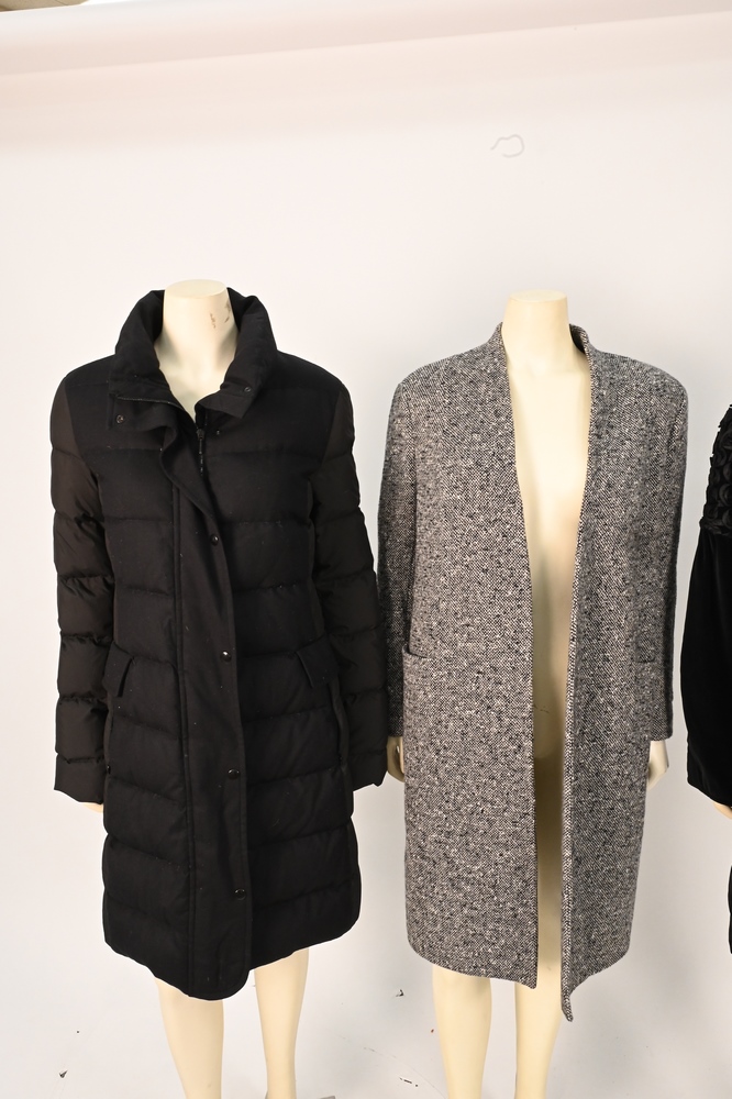 Lot 152A: Three Designer Coats, to include black quilted wool coat by AKRIS, black and white tweed overcoat, and vintage black velvet coat wit…