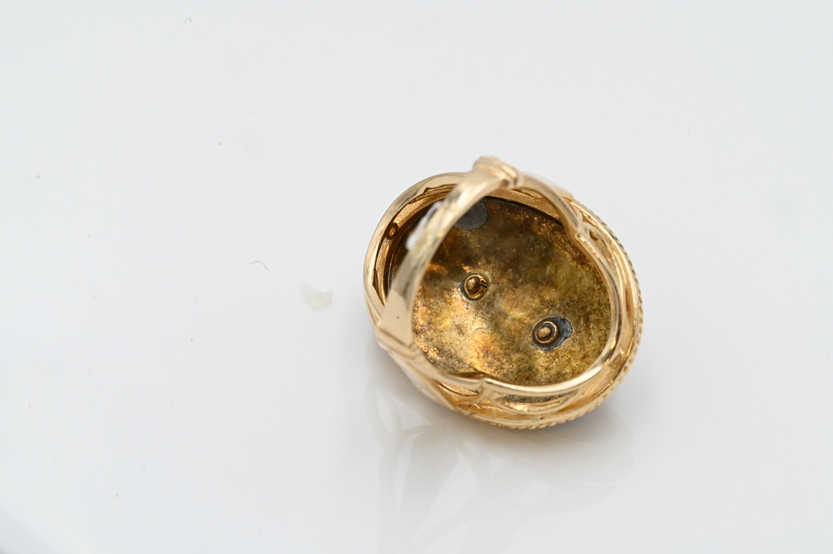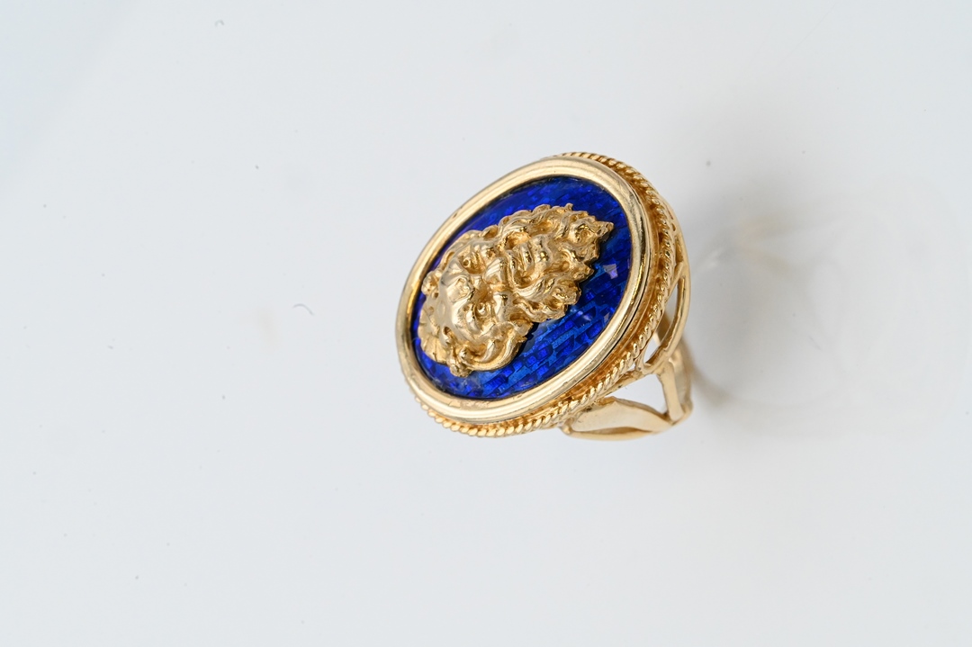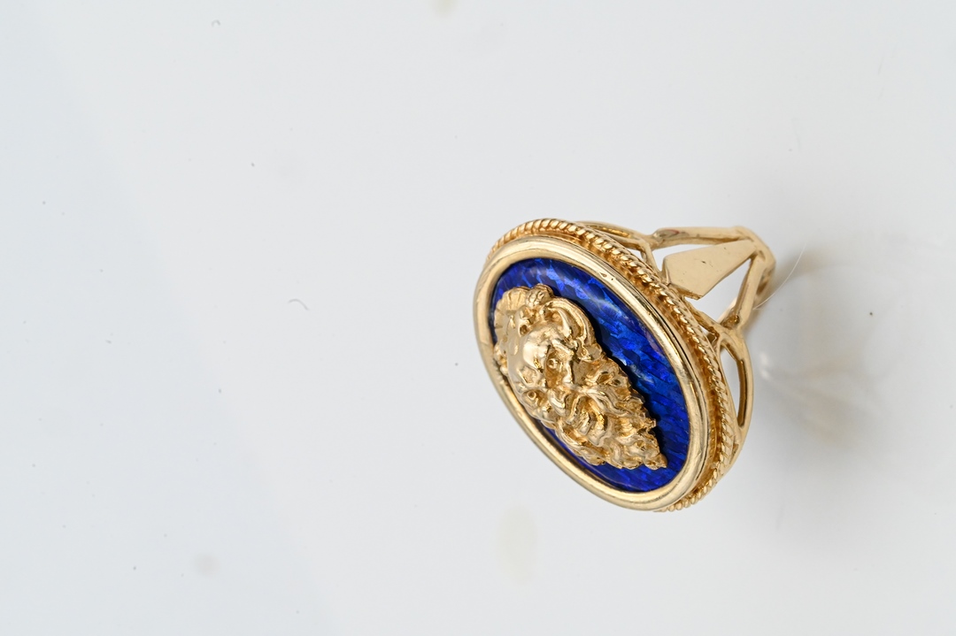 18 Karat Yellow Gold Ring having beaded mans face surrounded by blue enameling, size 5, 8.9 grams Condition: good condition