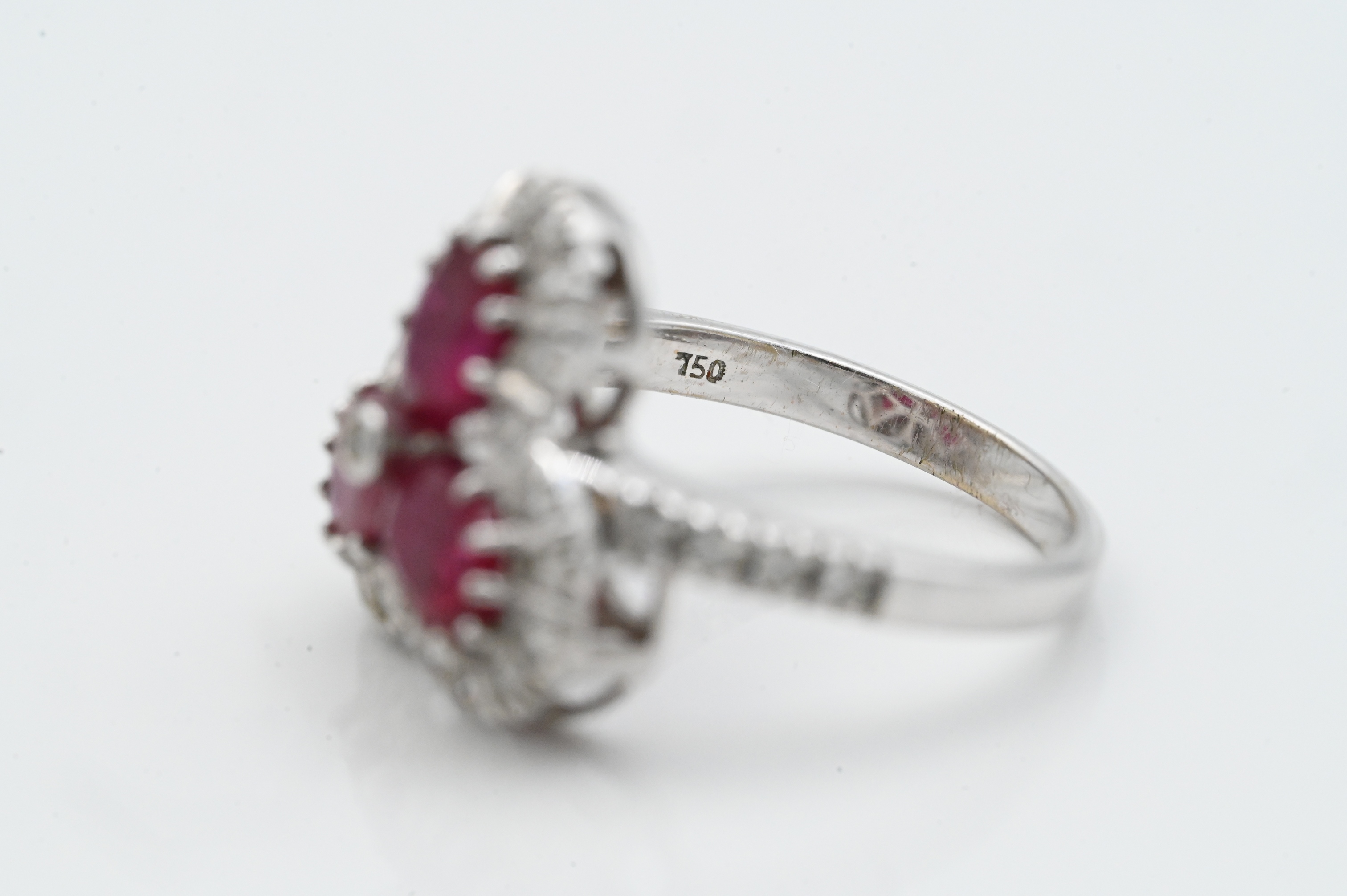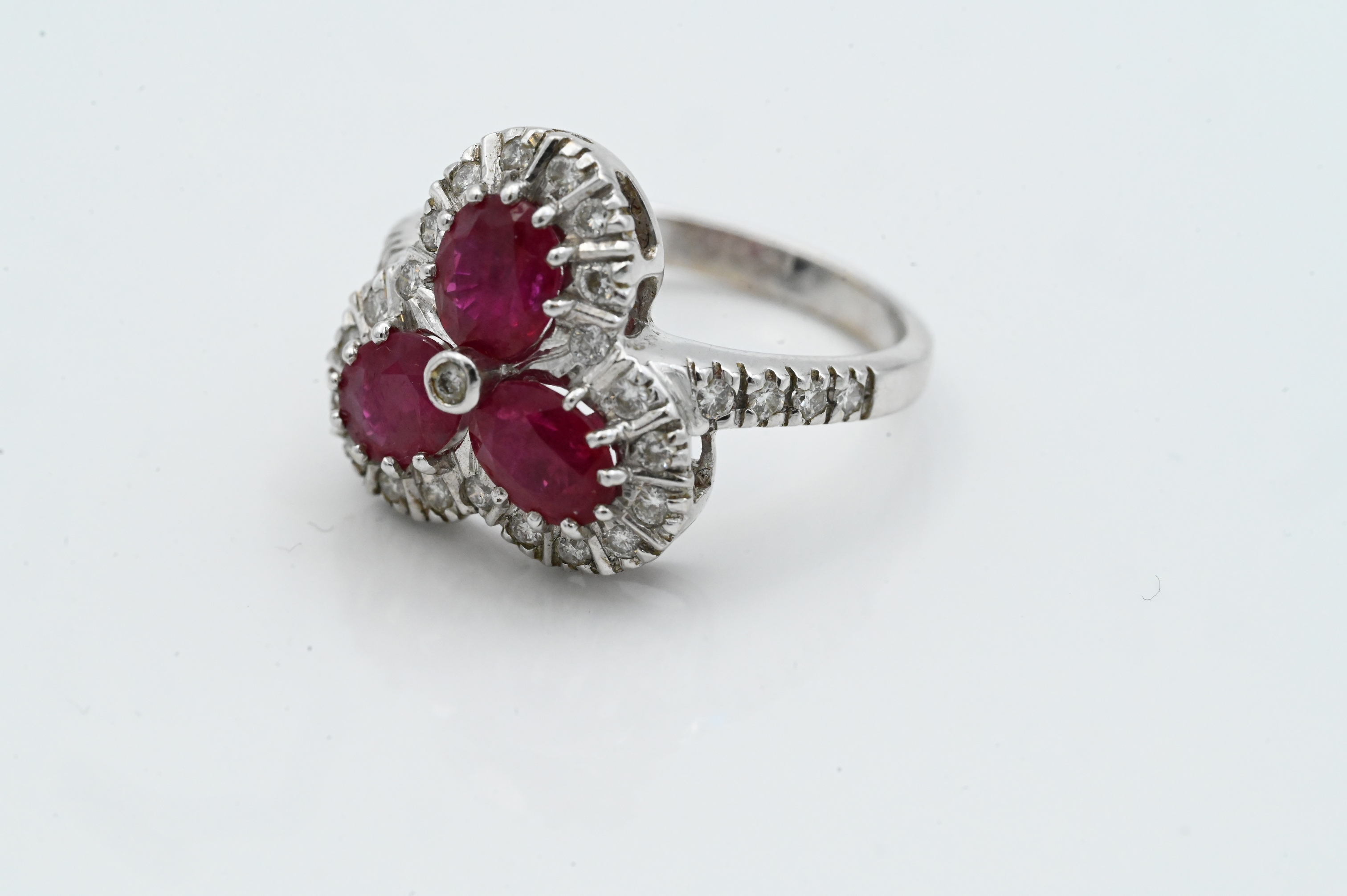 set with three oval red stones (possibly rubies) all surrounded by diamonds,