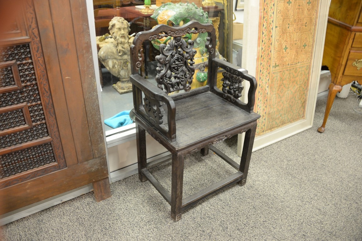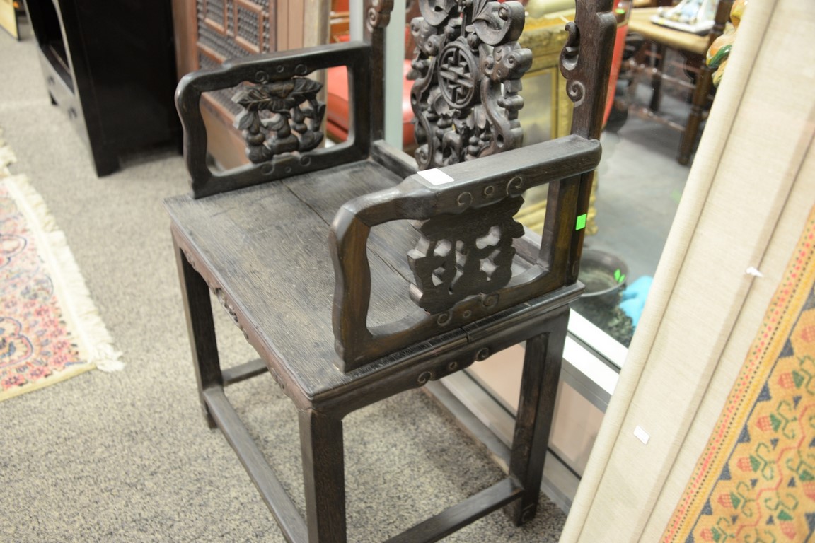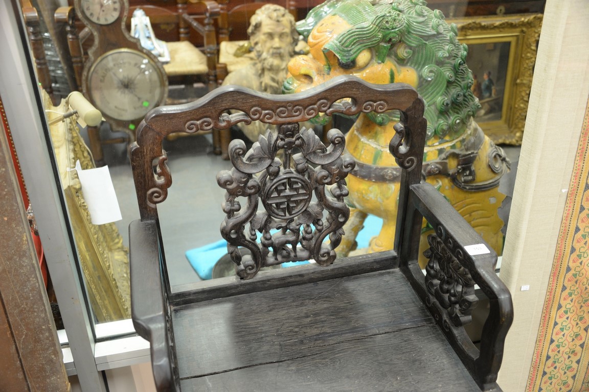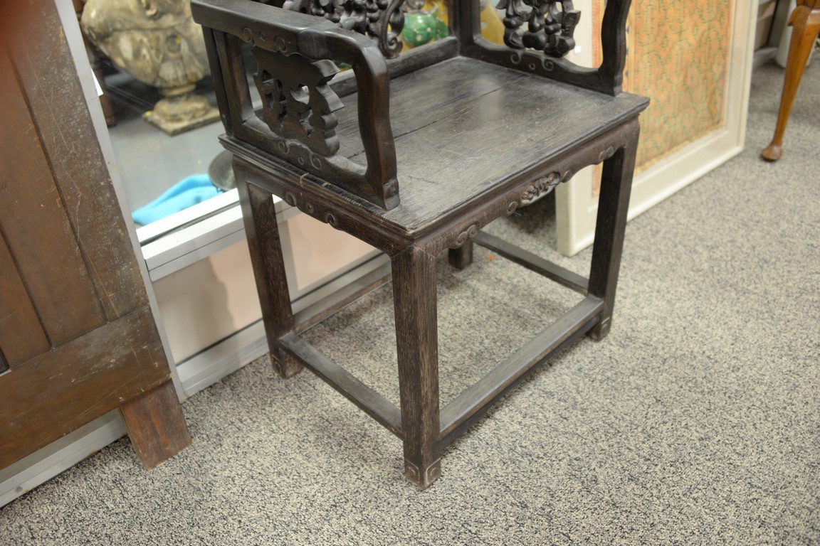 Lot 153: Chinese hardwood armchair with carved back and sides. ht. 38 1/2in., wd. 23 1/4in.