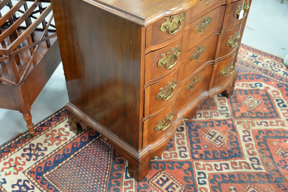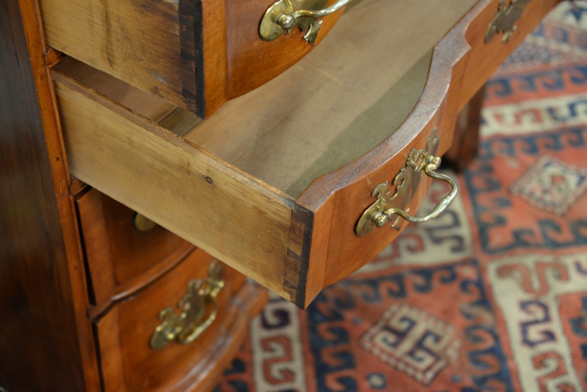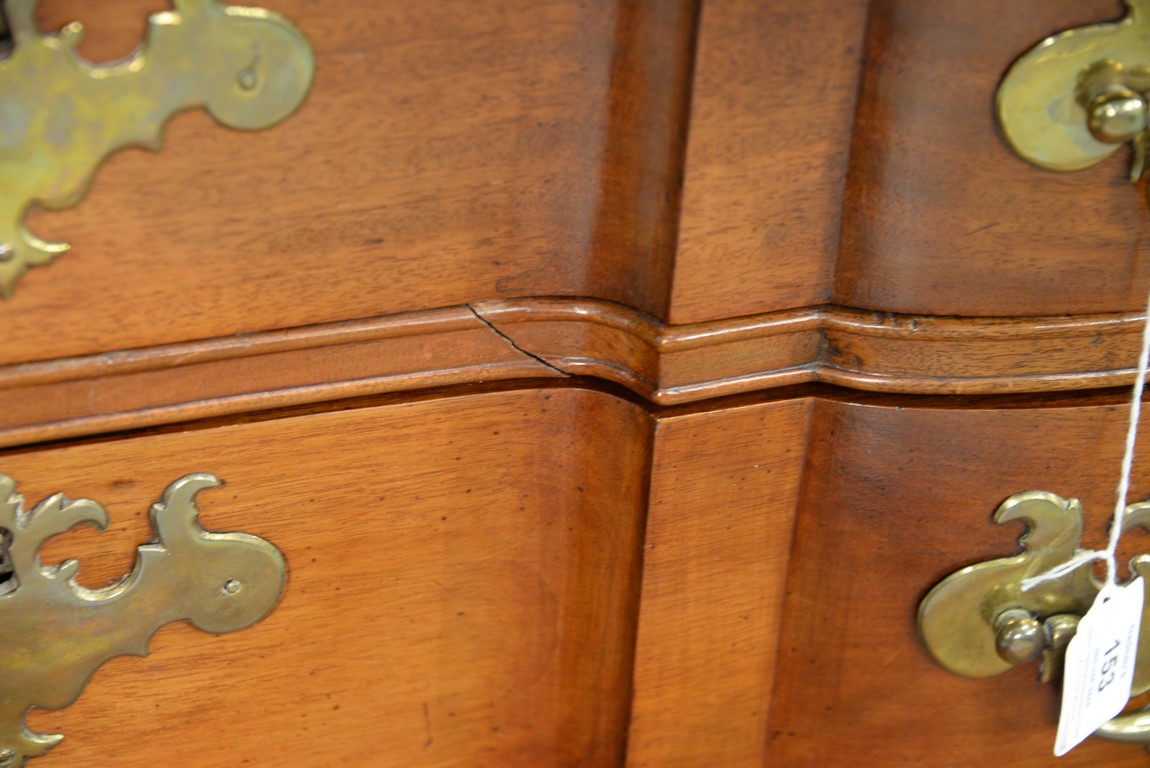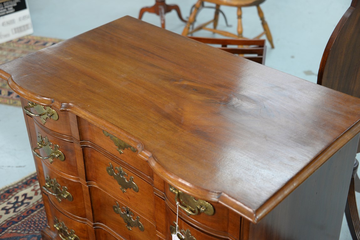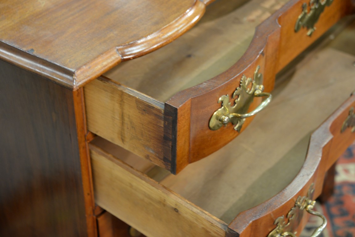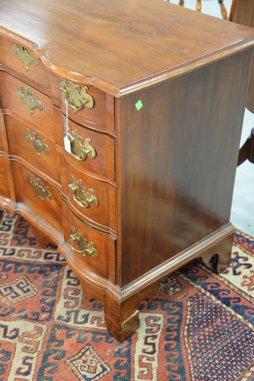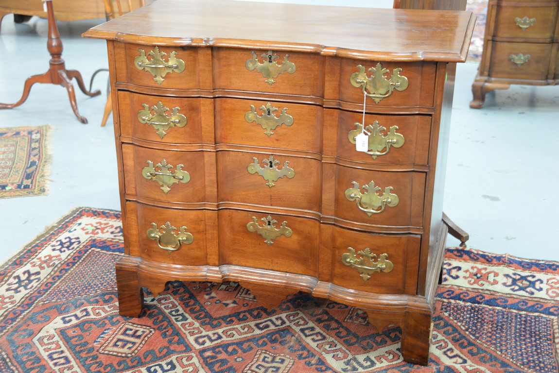 Lot 153: Chippendale mahogany block front chest with rectangular top with blocked front over conforming case of four graduated drawers having scalloped apron with drop center set on bracket feet, Massachusetts circa 1770. ht. 32 in. case wd. 32 3/4 i