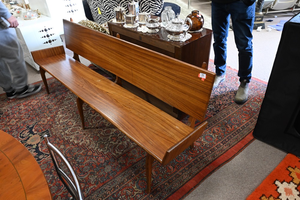 Lot 153: Clara Circassian Walnut Mid Century Bench, Ico Parisi Style, width 80 inches, height 30 inches.