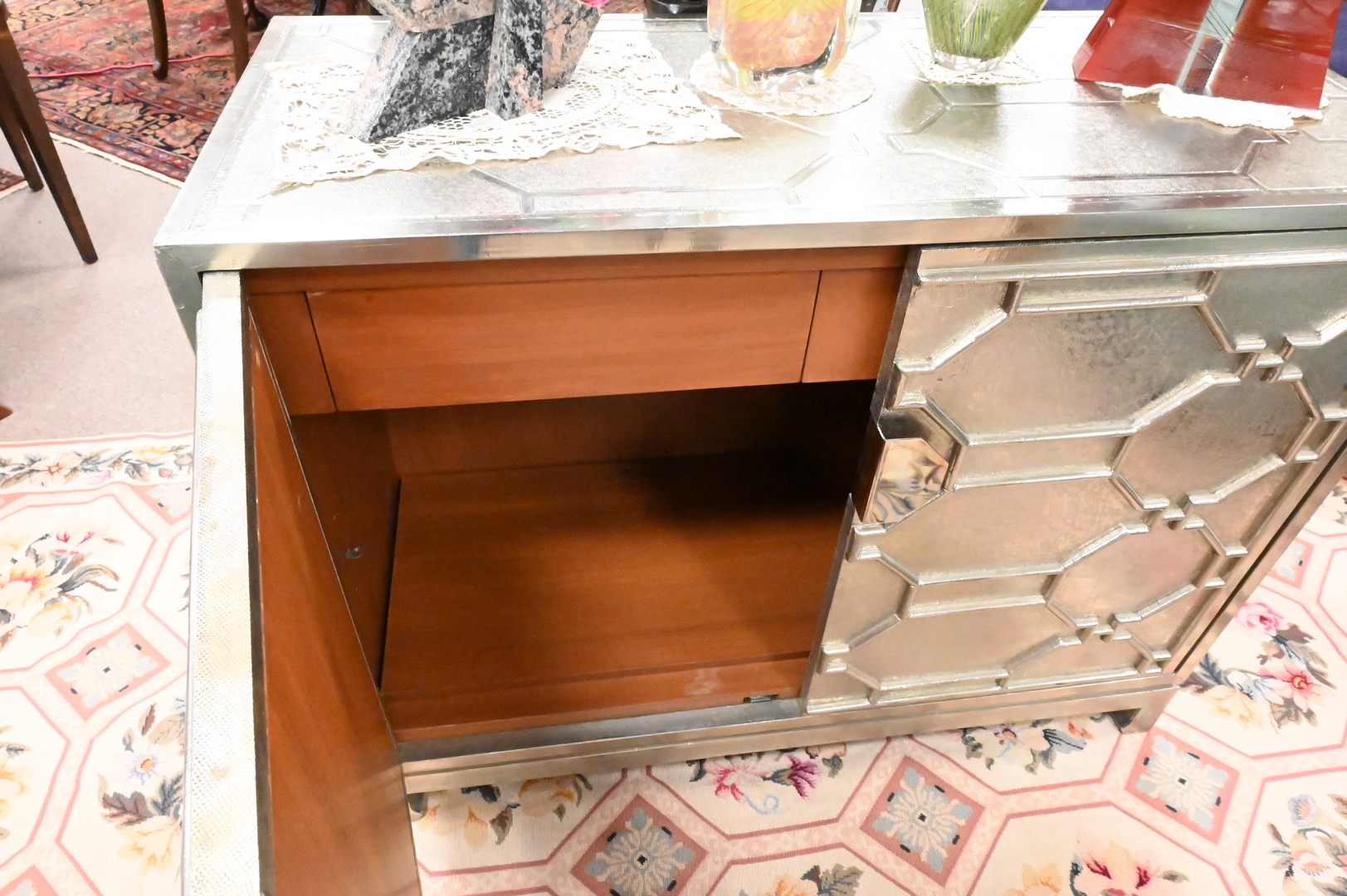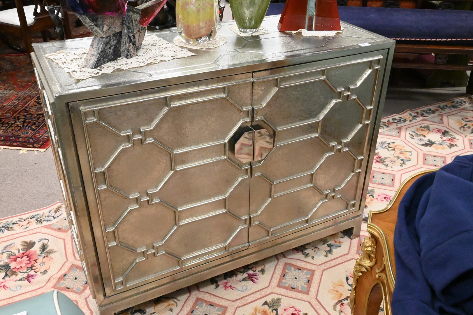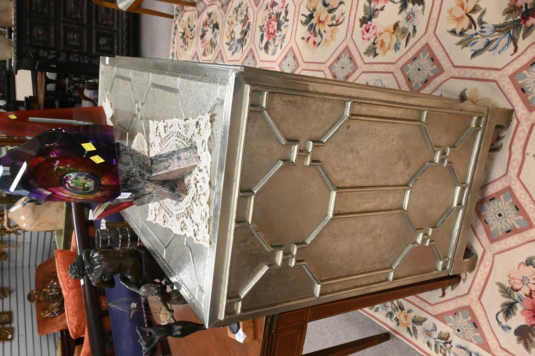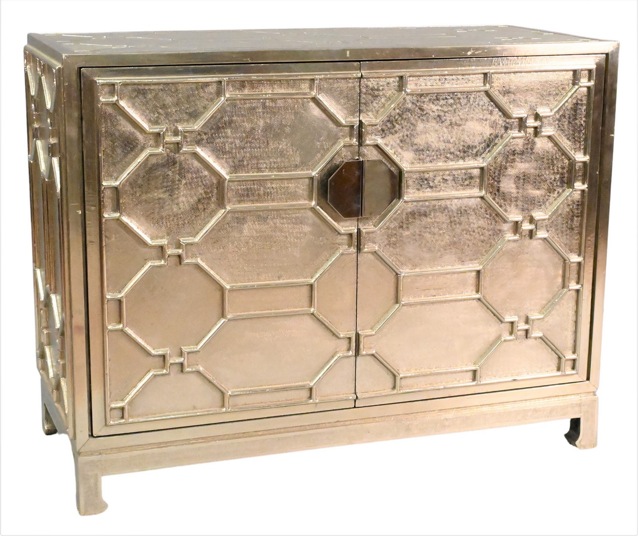 Contemporary Silvered Cabinet, having two drawers opening to interior shelving, with geometric motif throughout exterior, height 35 1/2 inches, top 19 1/2″ x 45″.