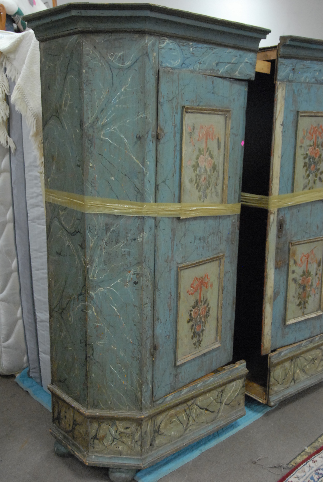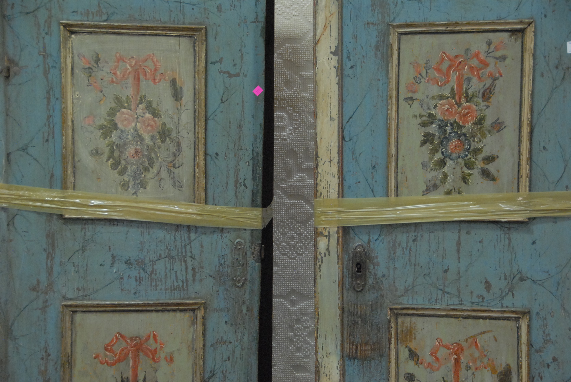 Lot 153: Early pine wardrobe in two parts with original paint decorated and suppressed ball fleet, wd. 68in. ht. 77in.
