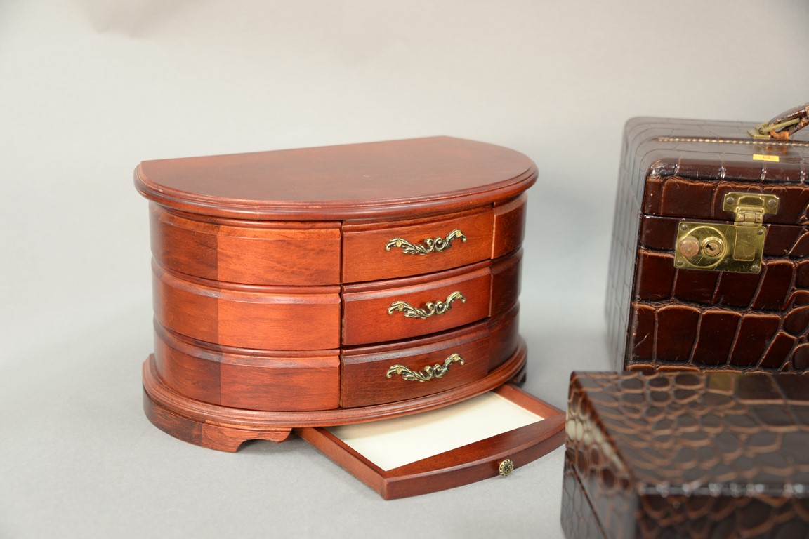 Lot 153: Five jewelry boxes including two alligatored leather by Shortrip, two small wood boxes and custom large box with fitted interior. …