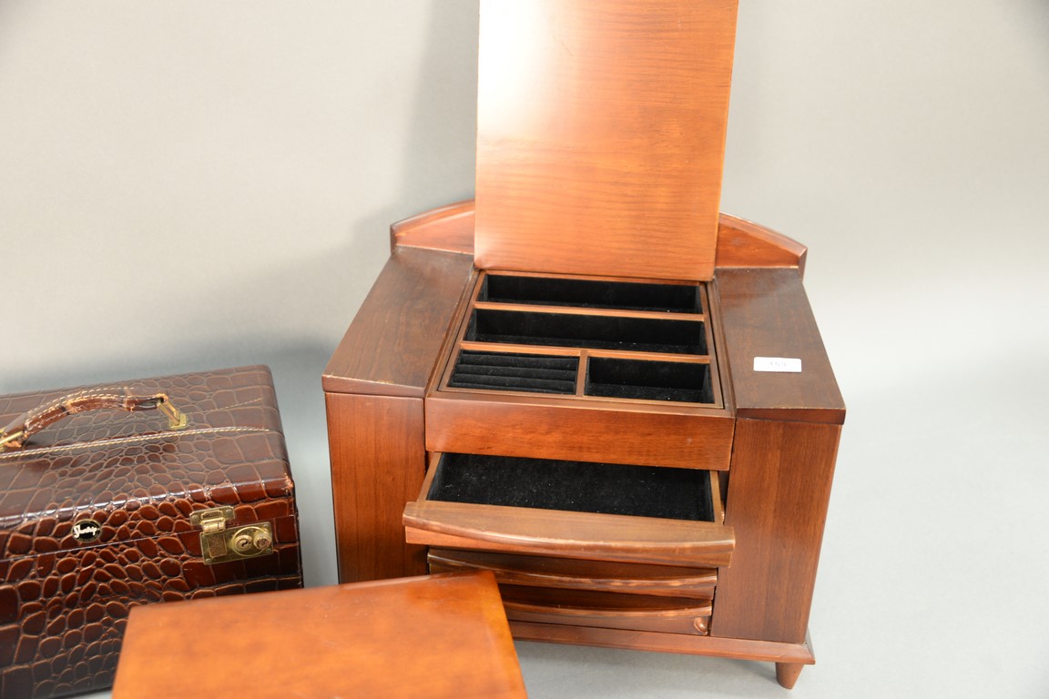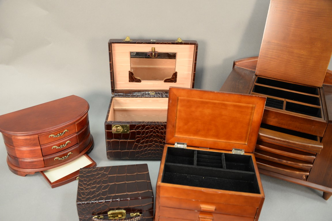 Five jewelry boxes including two alligatored leather by Shortrip, two small wood boxes and custom large box with fitted interior. ht. 7in. to 14in.