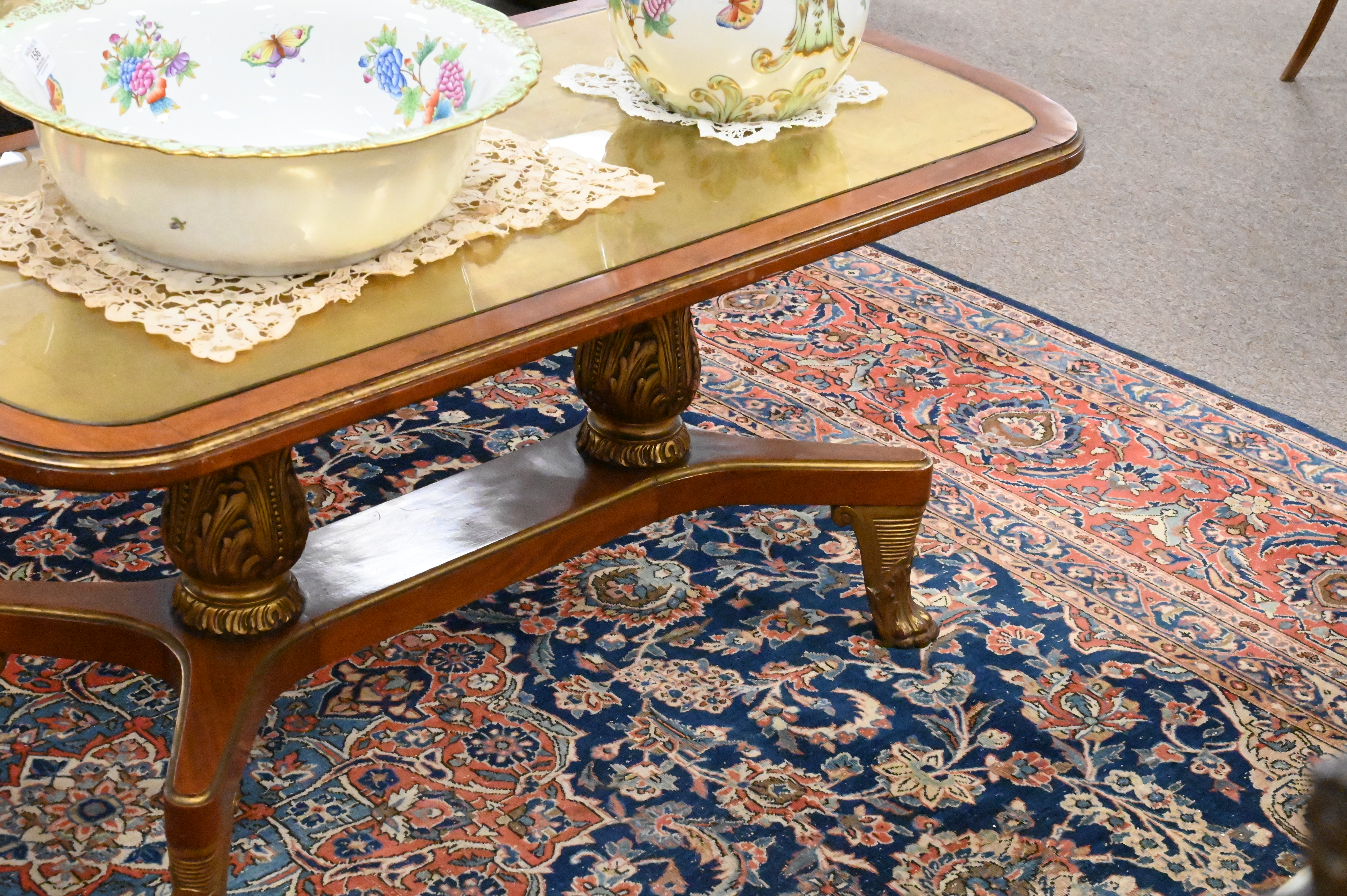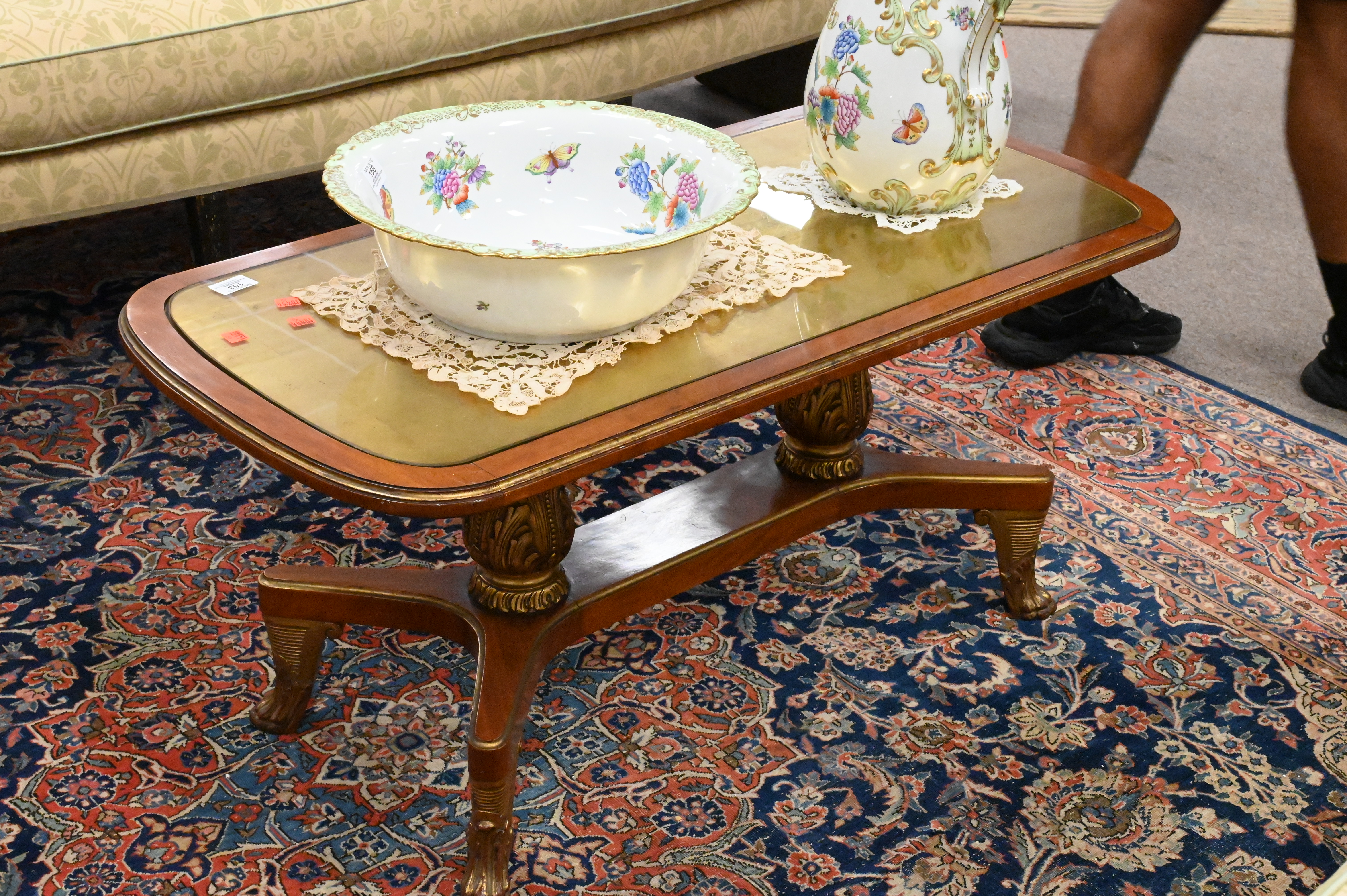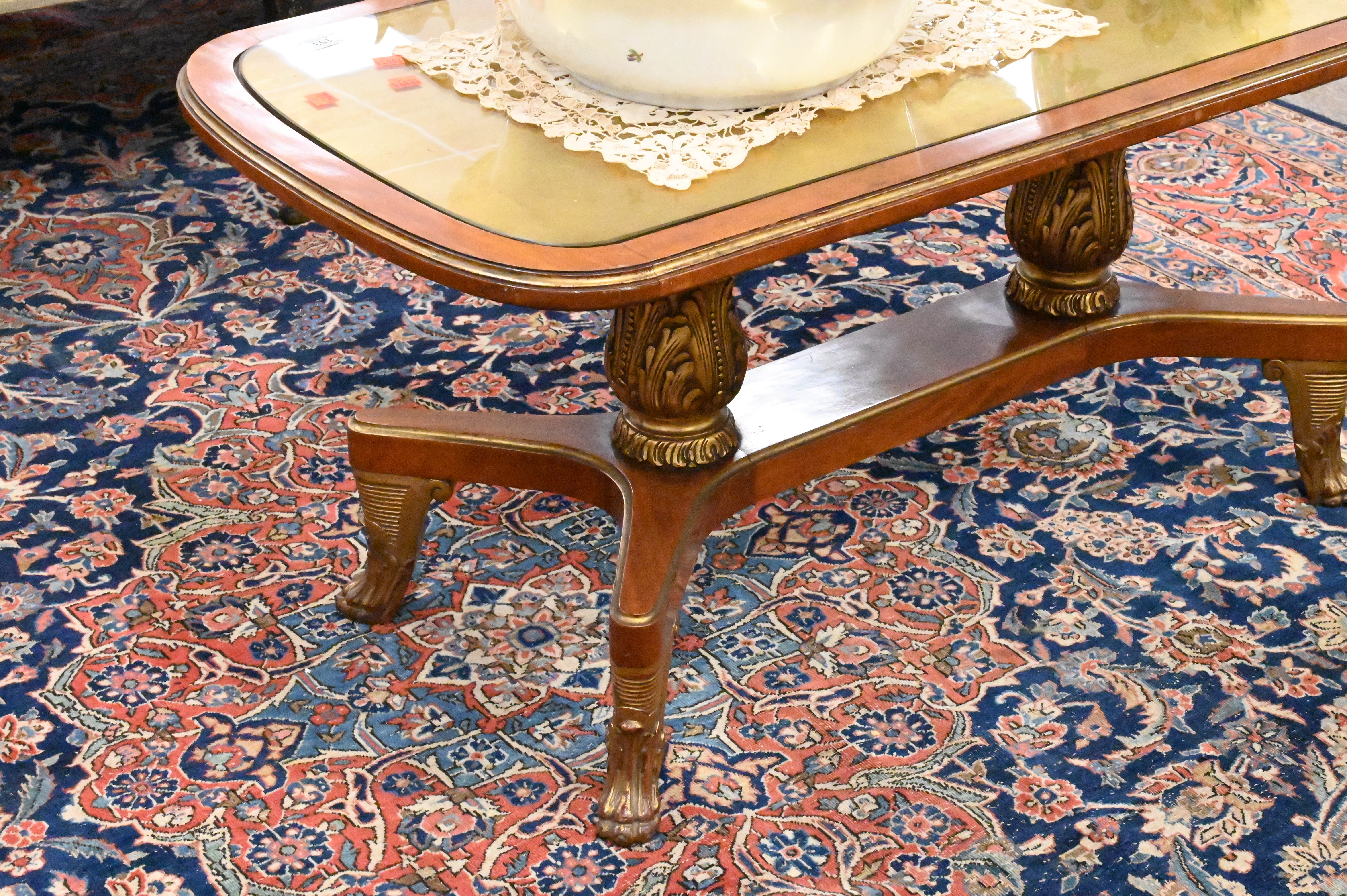 having inset glass top on pedestal base with gilt claw feet