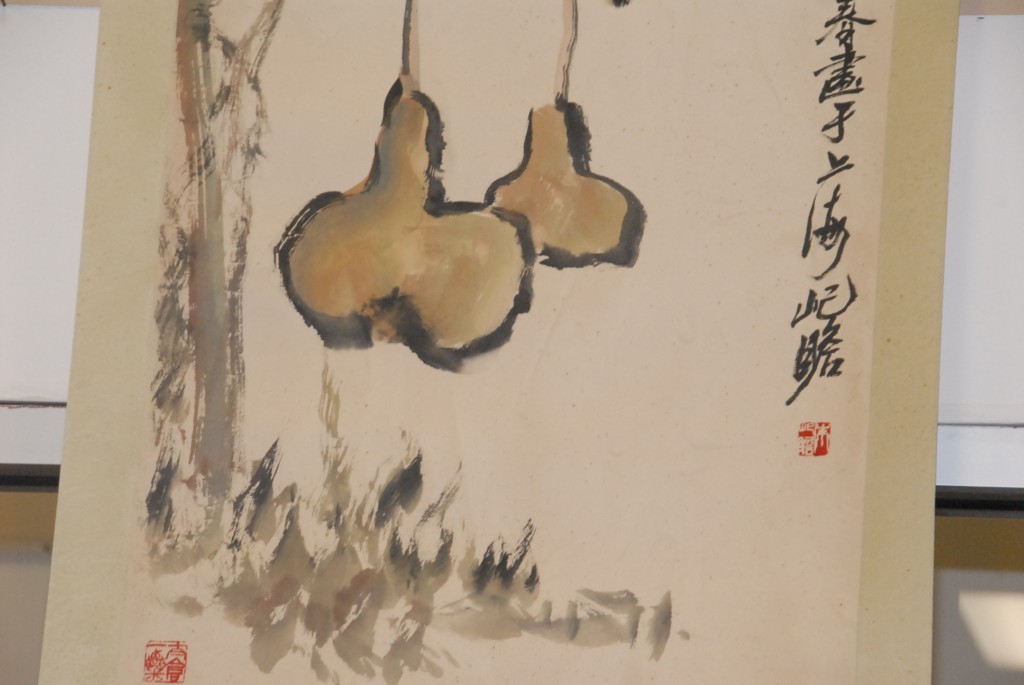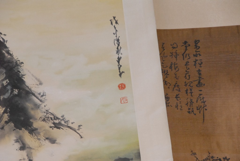 Lot 153: Group of three Oriental scrolls watercolor on paper of fruit hanging from branch 37 x 21, watercolor on paper landscape with larg…