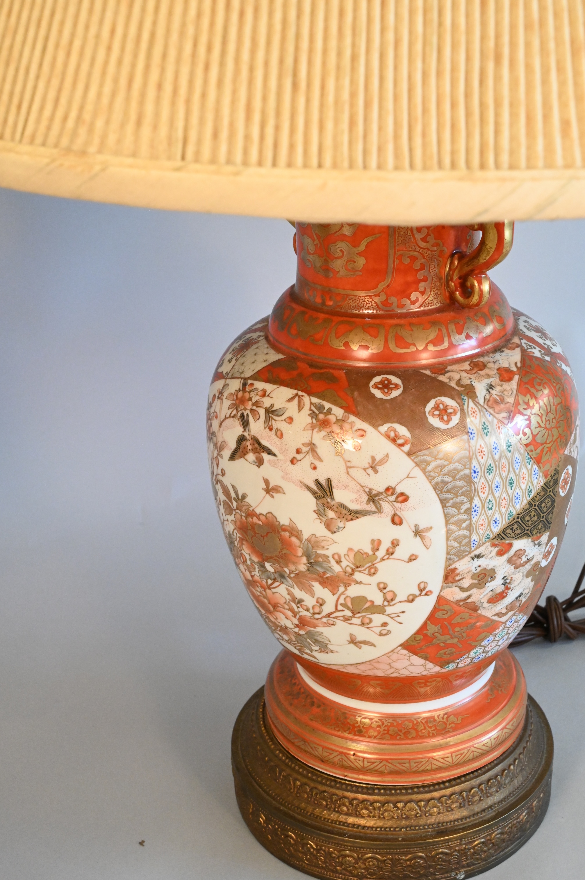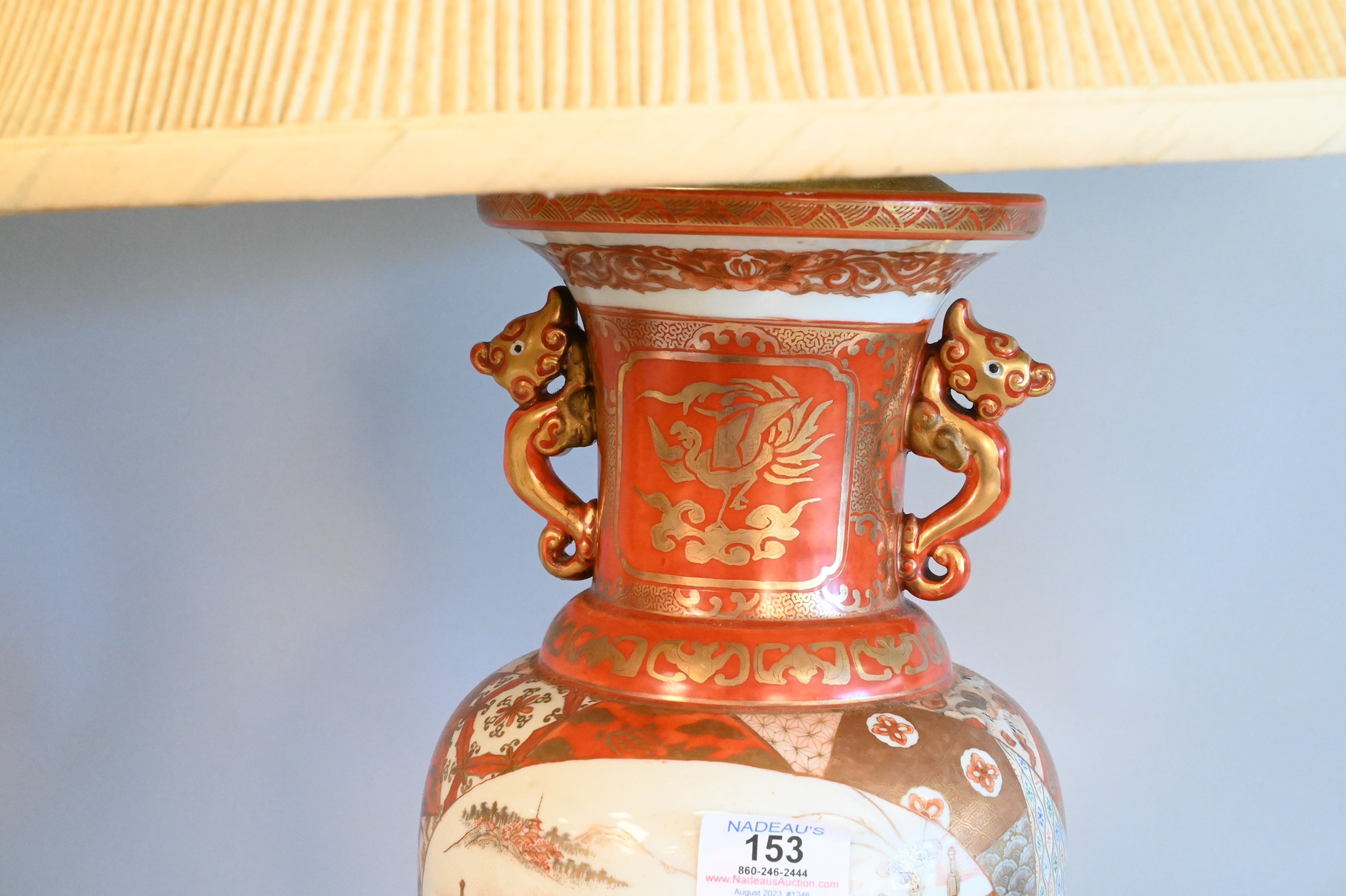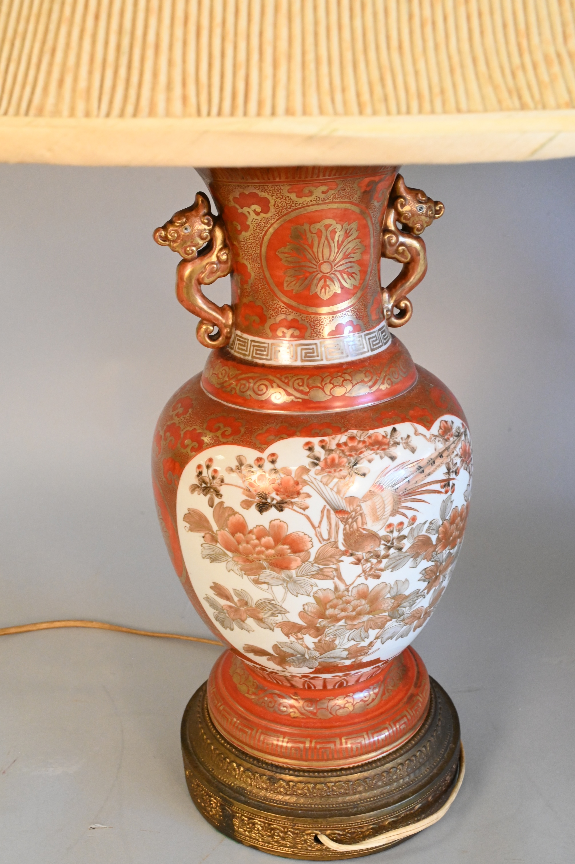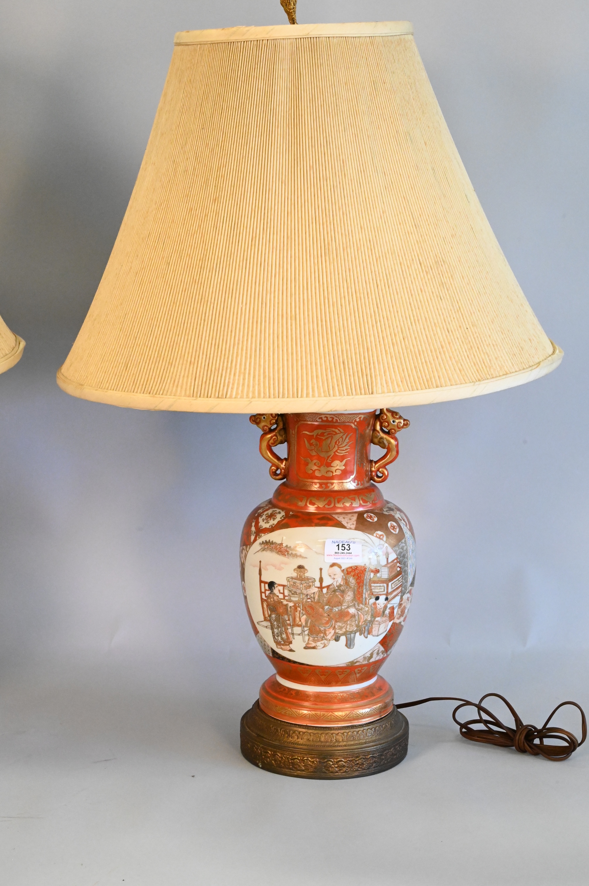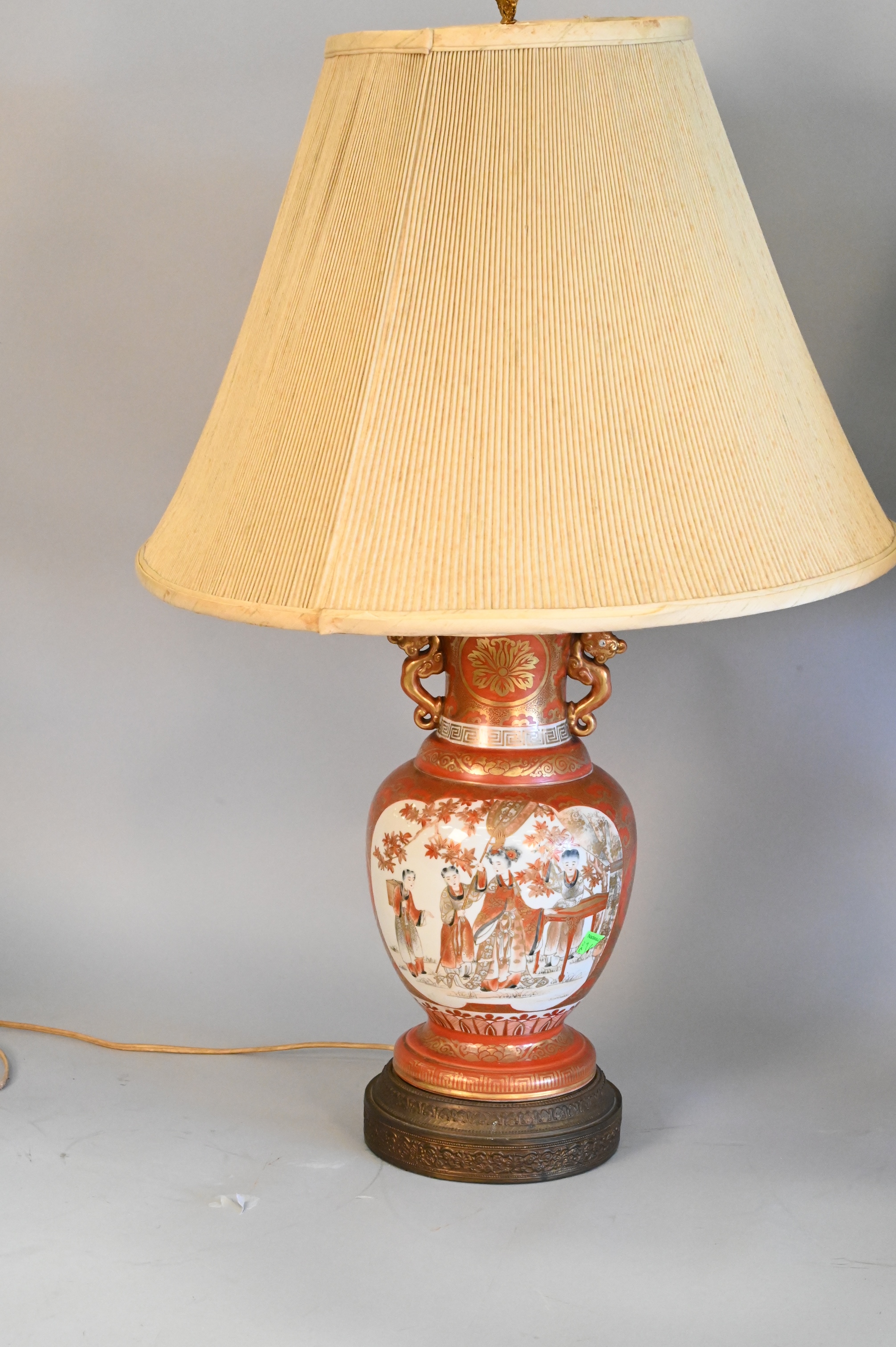 Pair of Japanese Porcelain Kutani Vases, mounted into table lamps, emaleed with iron red and gold, featuring garden scenes with figures and dragon handles, mounted vase height 17 inches, total height with finials 33 inches.
