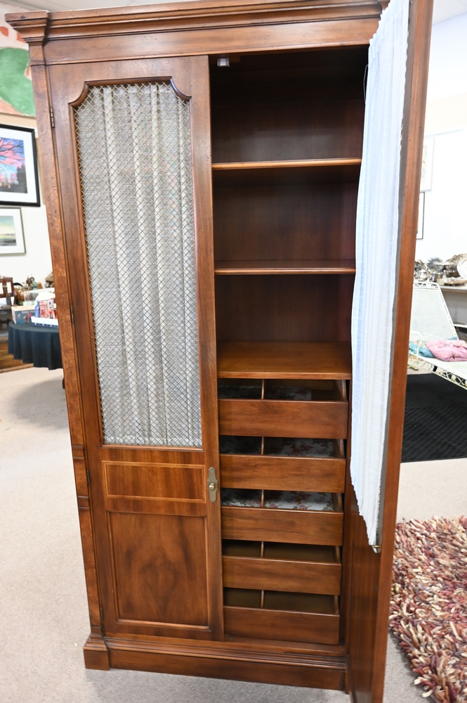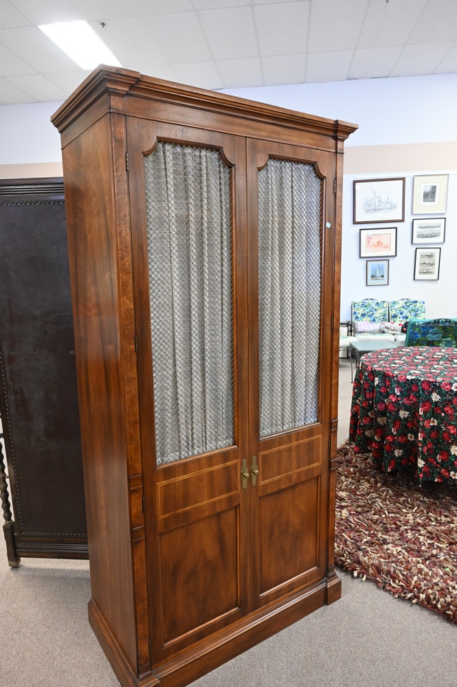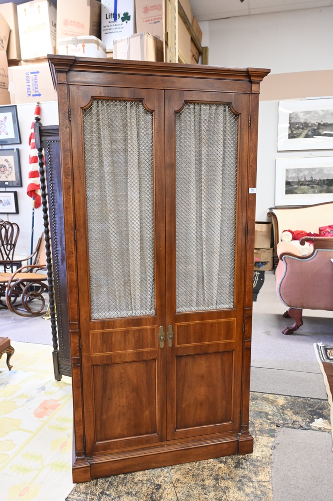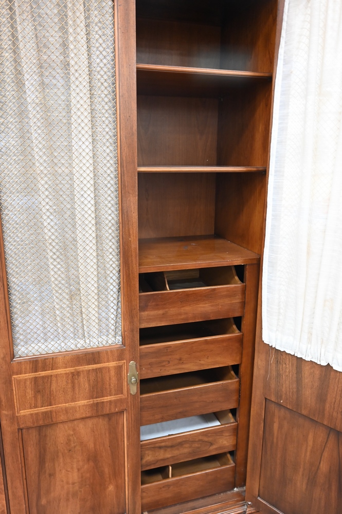 Lot 153: Pair of Mahogany Chifferobe, having shelves along with five fitted drawers and grillwork doors, height 76 inches, width 38 inches.