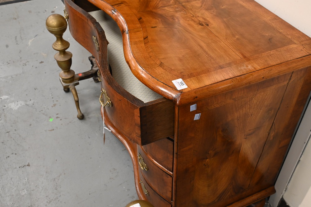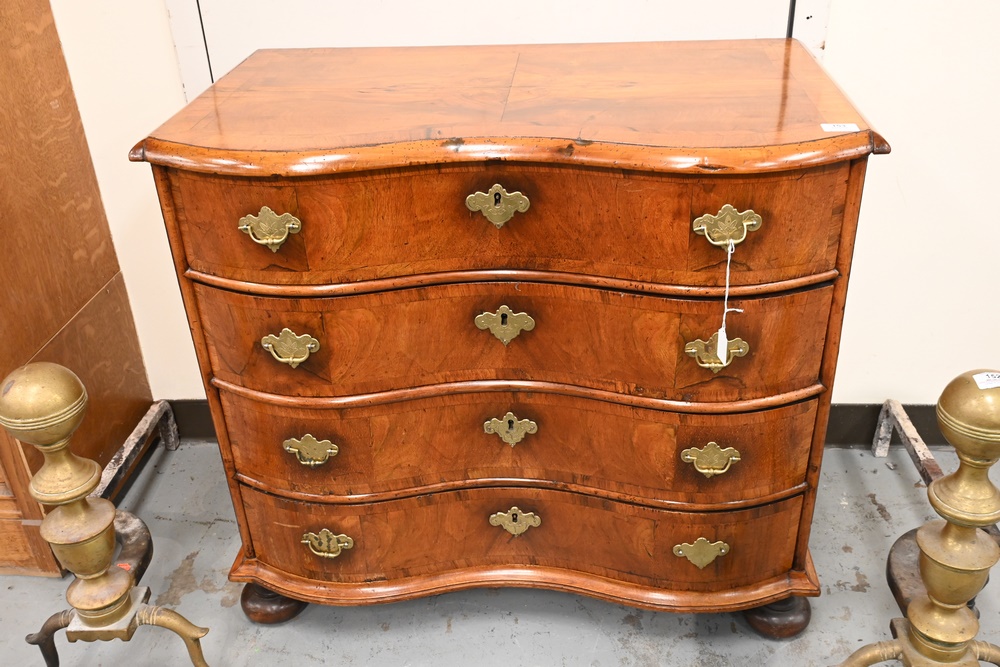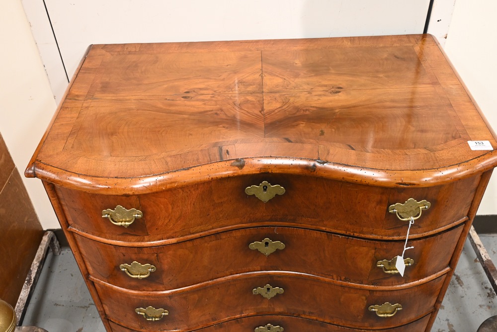 Lot 153: Queen Anne Walnut Serpentine Front Chest having four drawers set on suppressed ball feet probably Germany 18th century height 30 1/2 inches, case width 32 1/2 inches, top 20 x 34 1/2 inches
