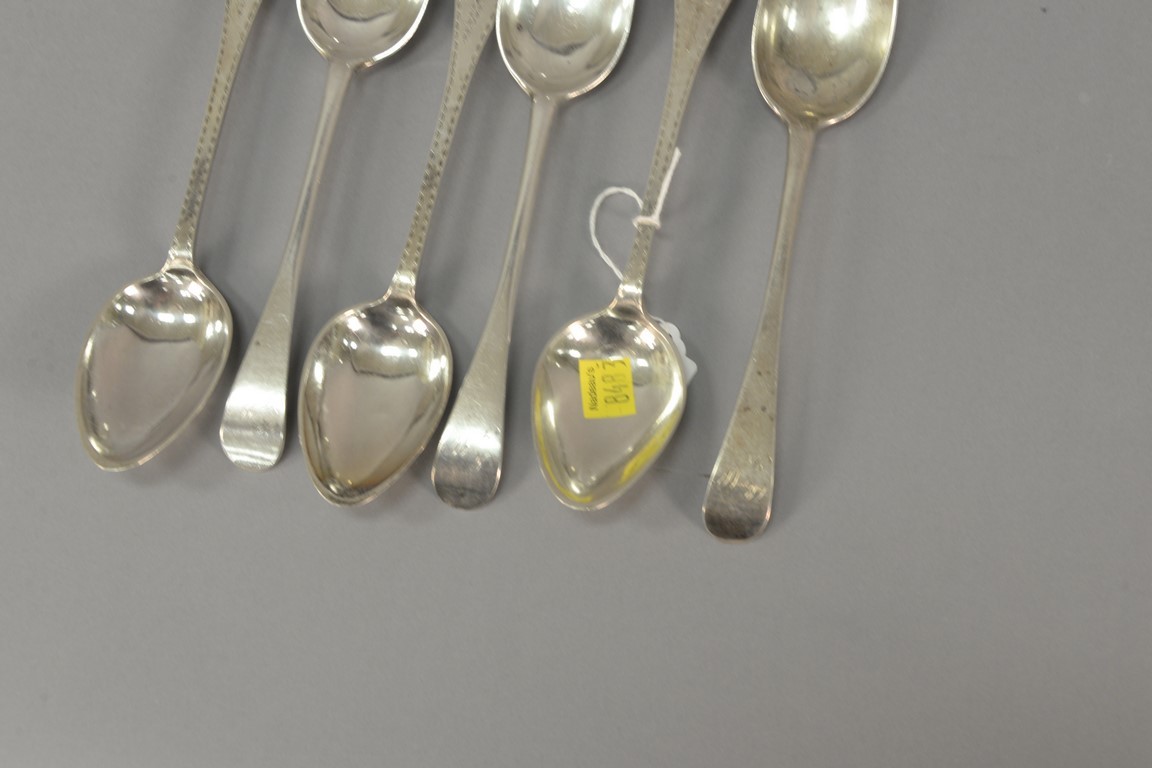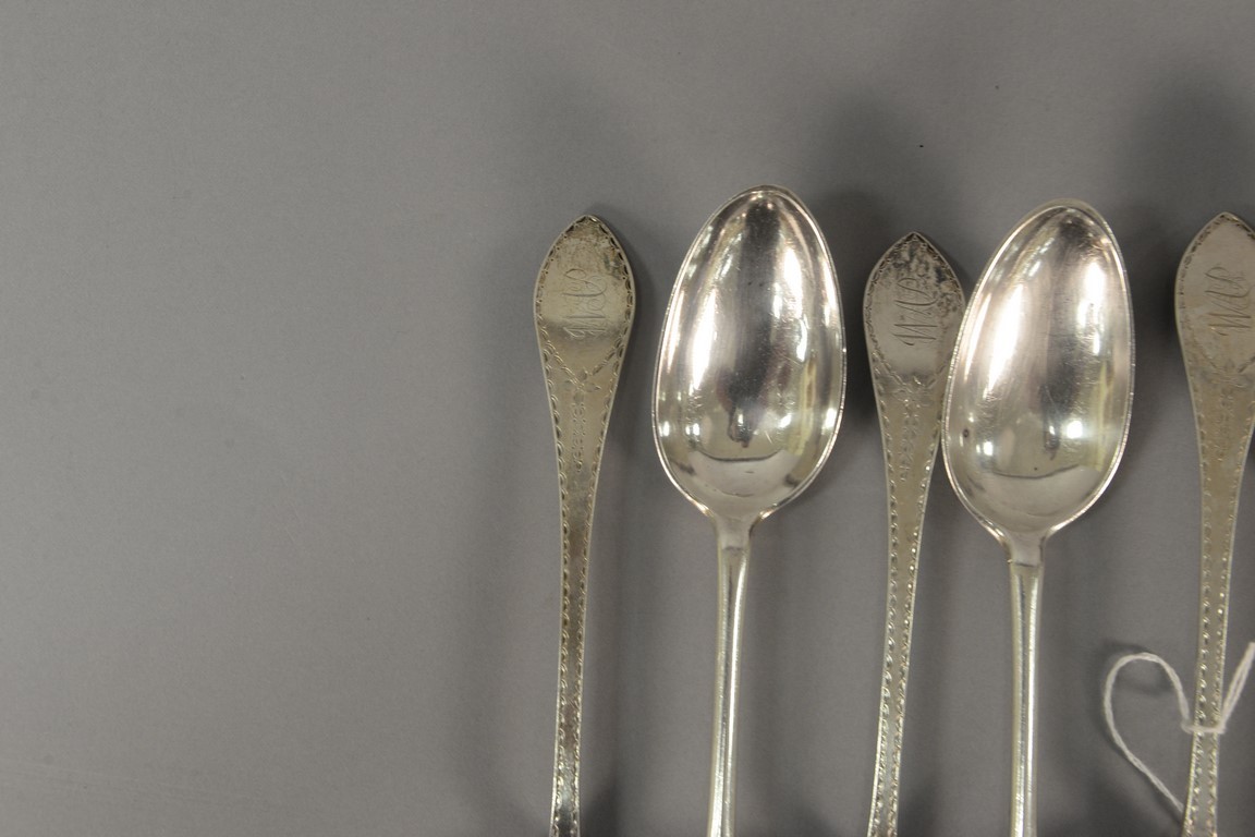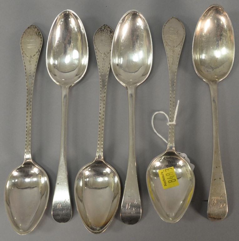 Six large silver tablespoons, three marked AG with anchor. lg. 8 3/4in., 12.8 troy ounces