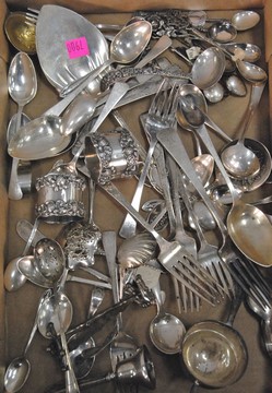 Lot 153: Sterling silver lot including spoons, forks, two napkin rings, and souvenir spoons. 43 t oz.