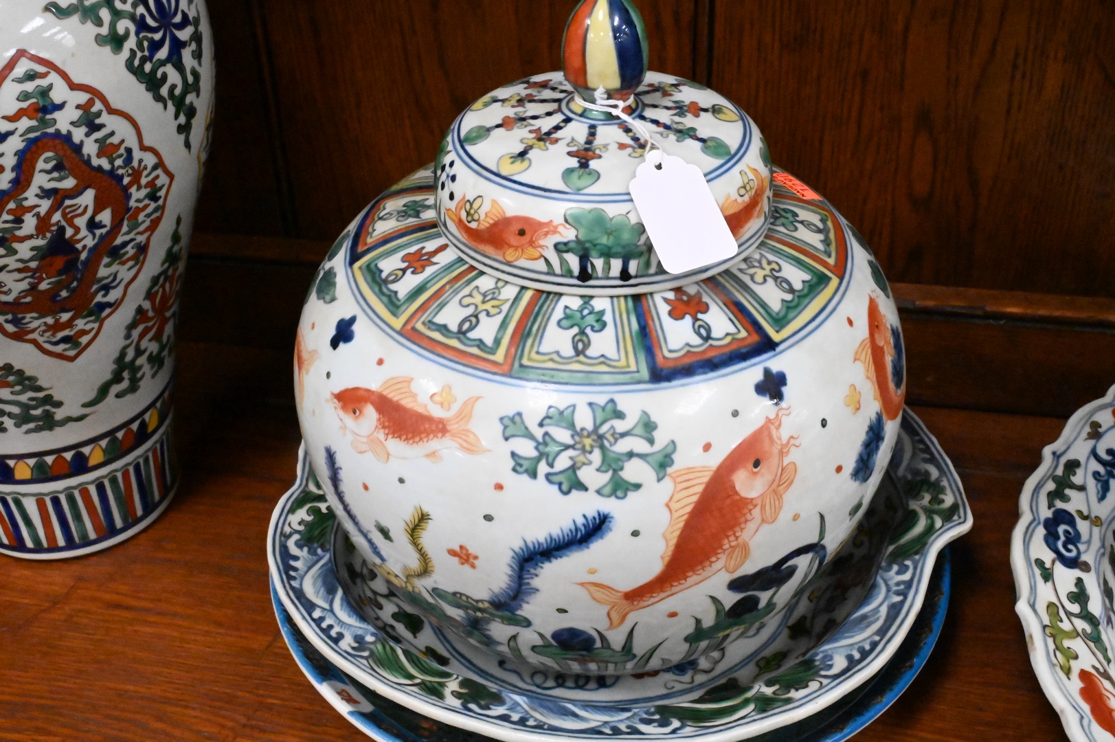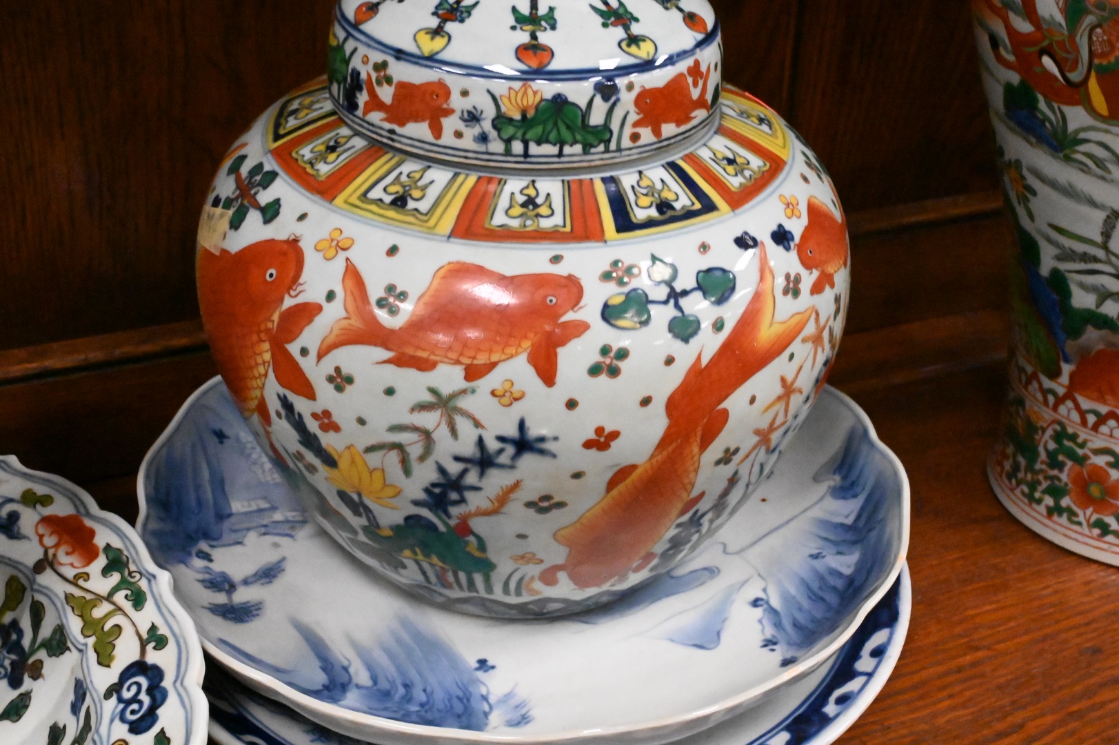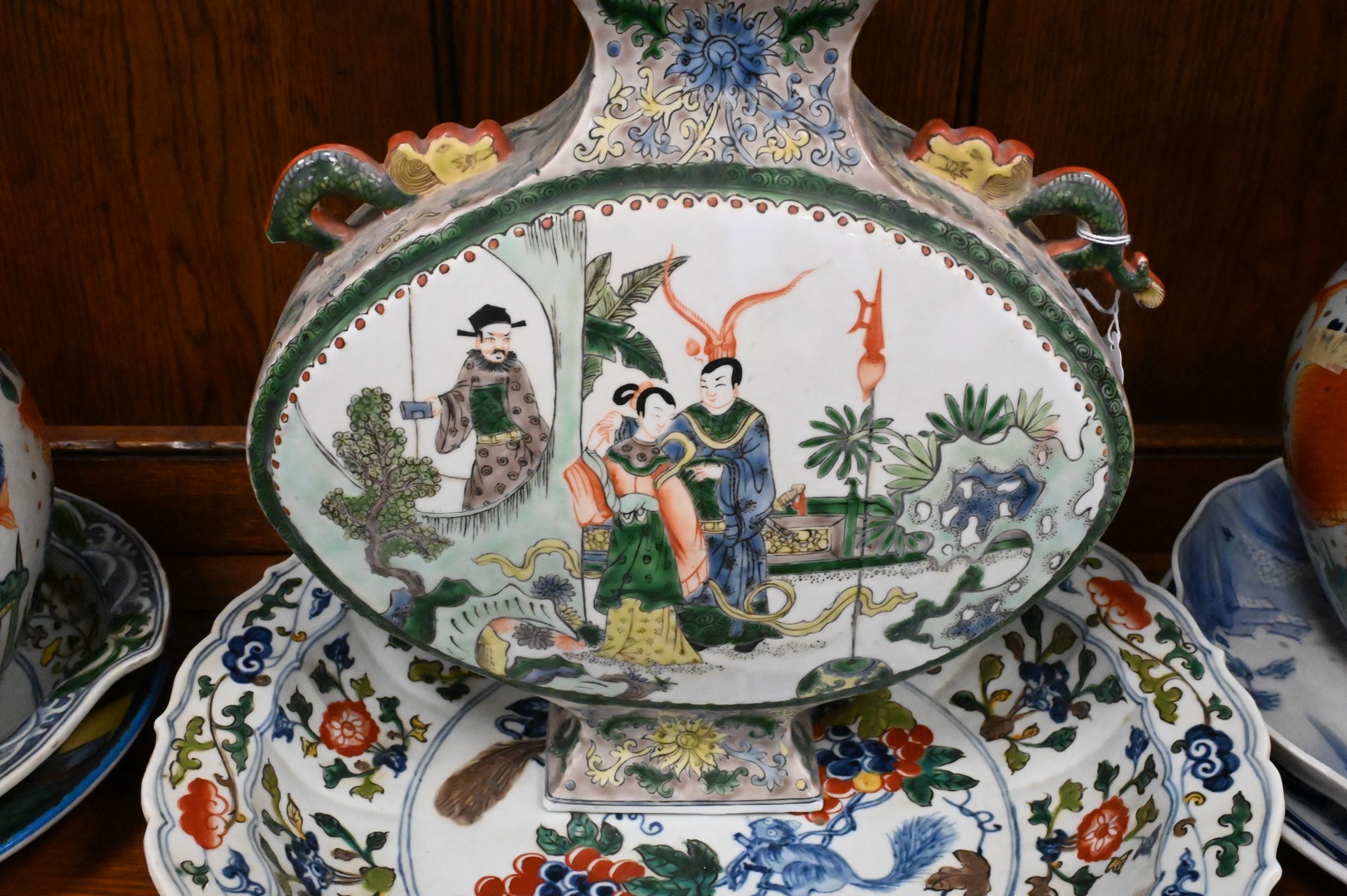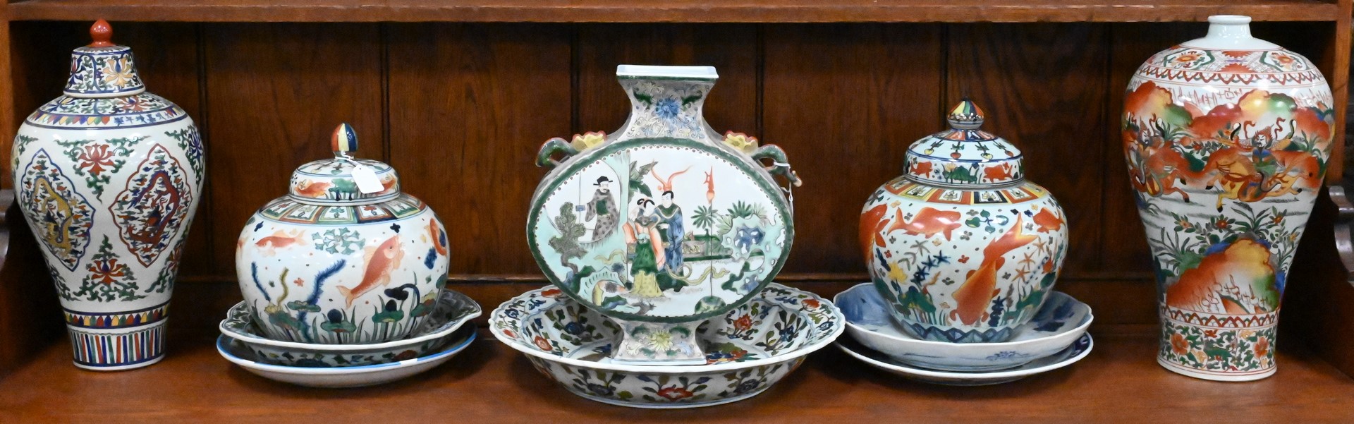 Ten Piece Chinese Porcelain Group, to include moon flask, pair of fish jars,meiping vase, tall jar with cover, chargers, etc., tallest height 16 inches.