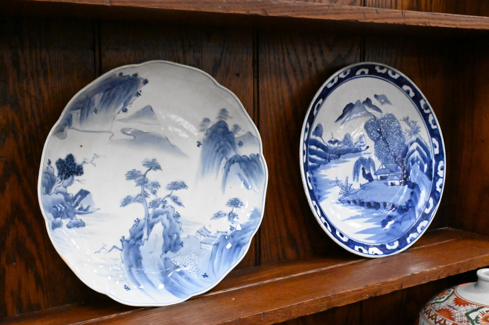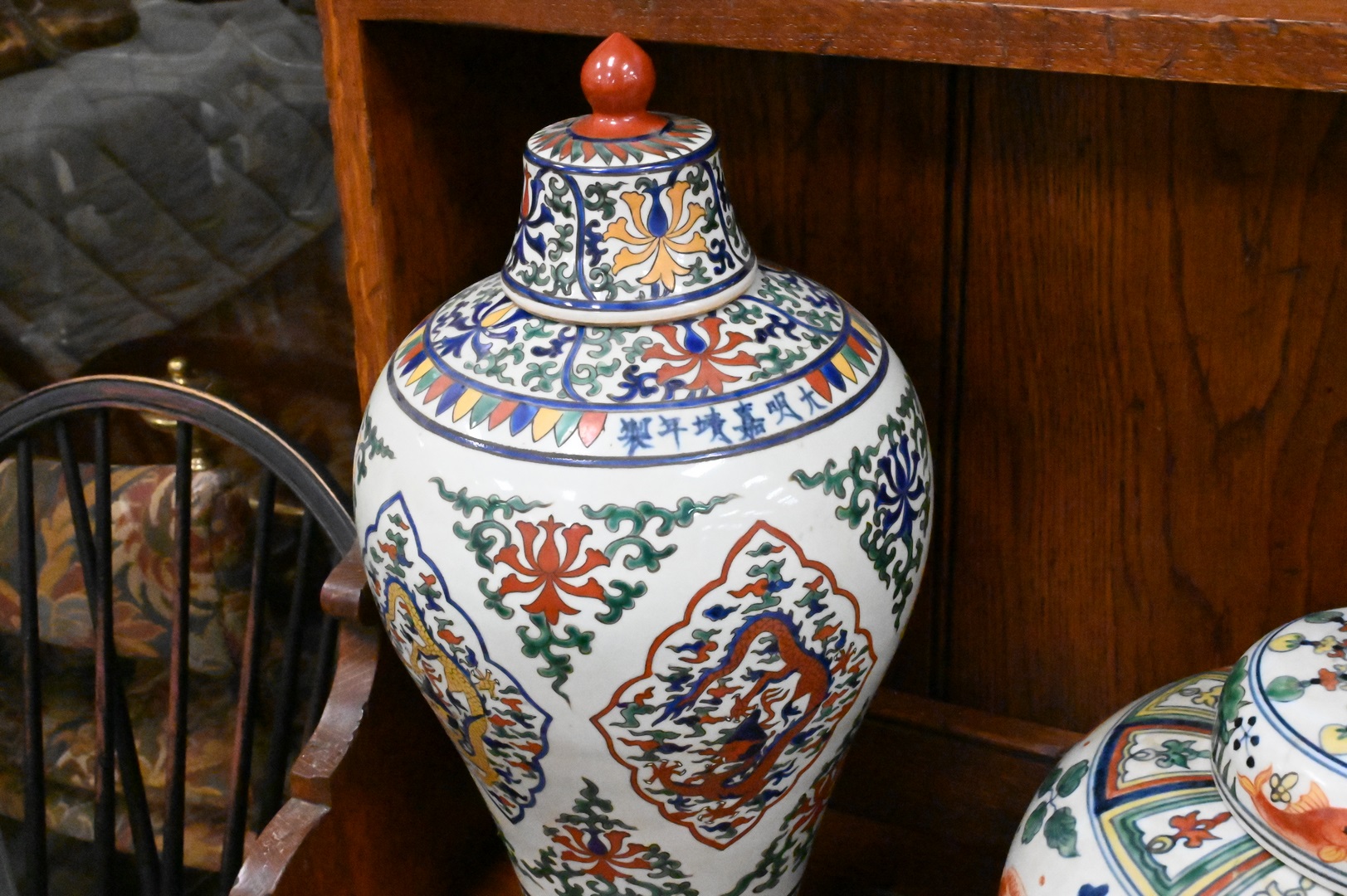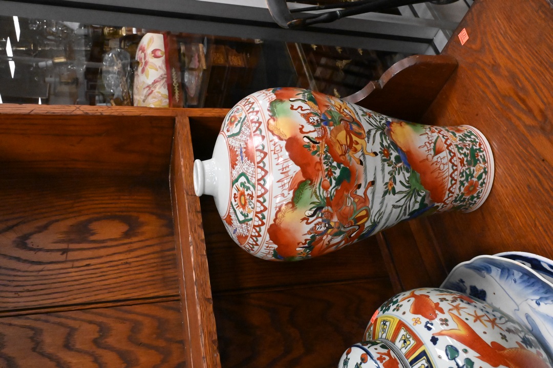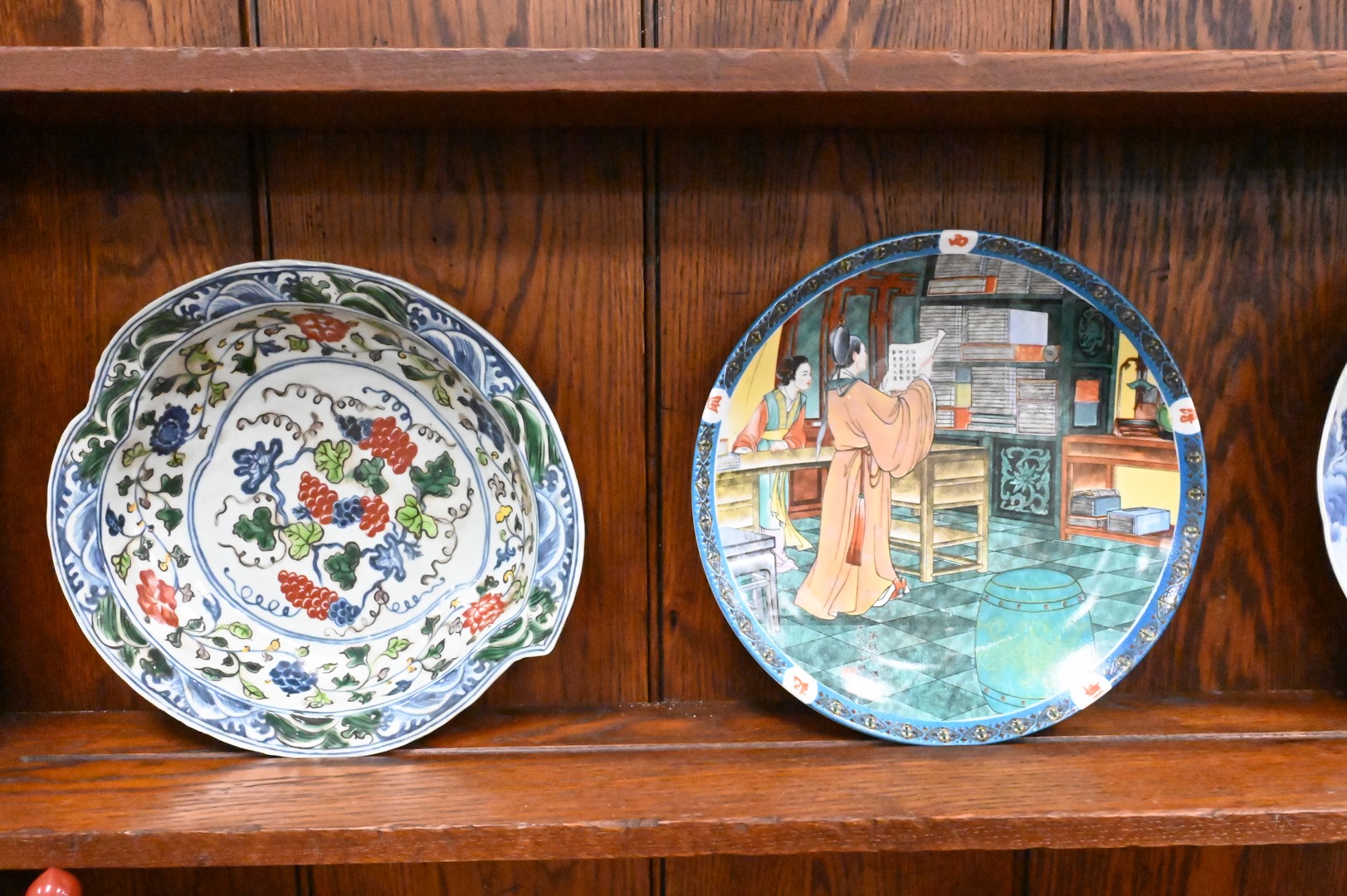 Ten Piece Chinese Porcelain Group, to include moon flask, pair of fish jars,meiping vase, tall jar with cover, chargers, etc., tallest height 16 inches.