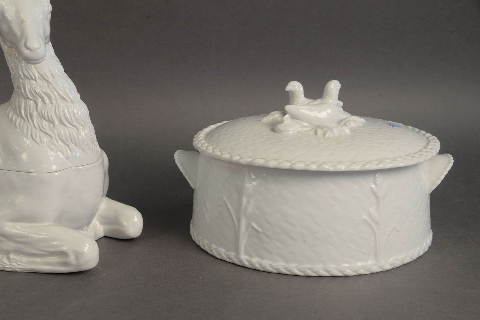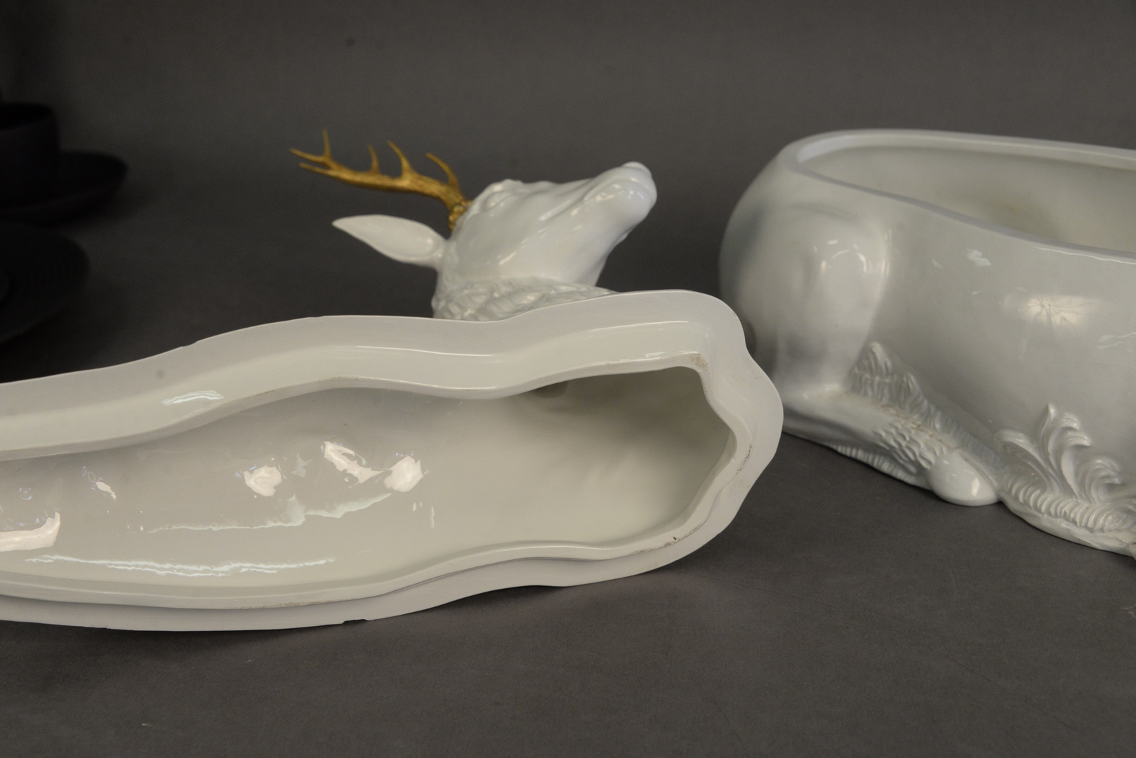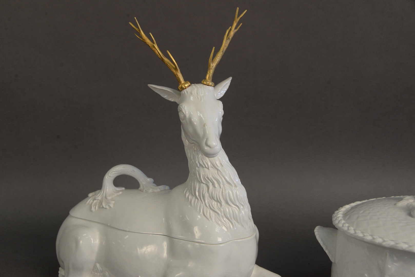 Lot 153: Two Piece Lot to include Mottahedeh deer tureen, height 15 inches, length 13 1/2 inches; along with Royal Worcester covered tureen, length 12 inches, (one flea bite). Provenance: The Estate of Diana Atwood Johnson.