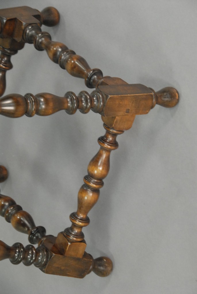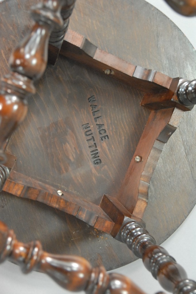 Wallace Nutting center table with round top on turned legs, branded Wallace Nutting in block letters.