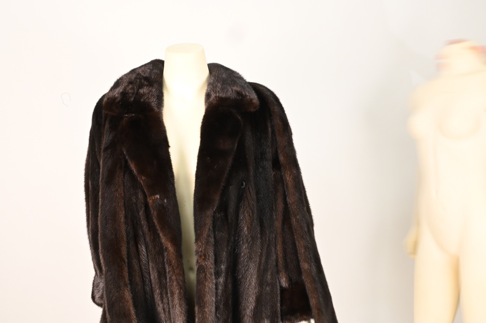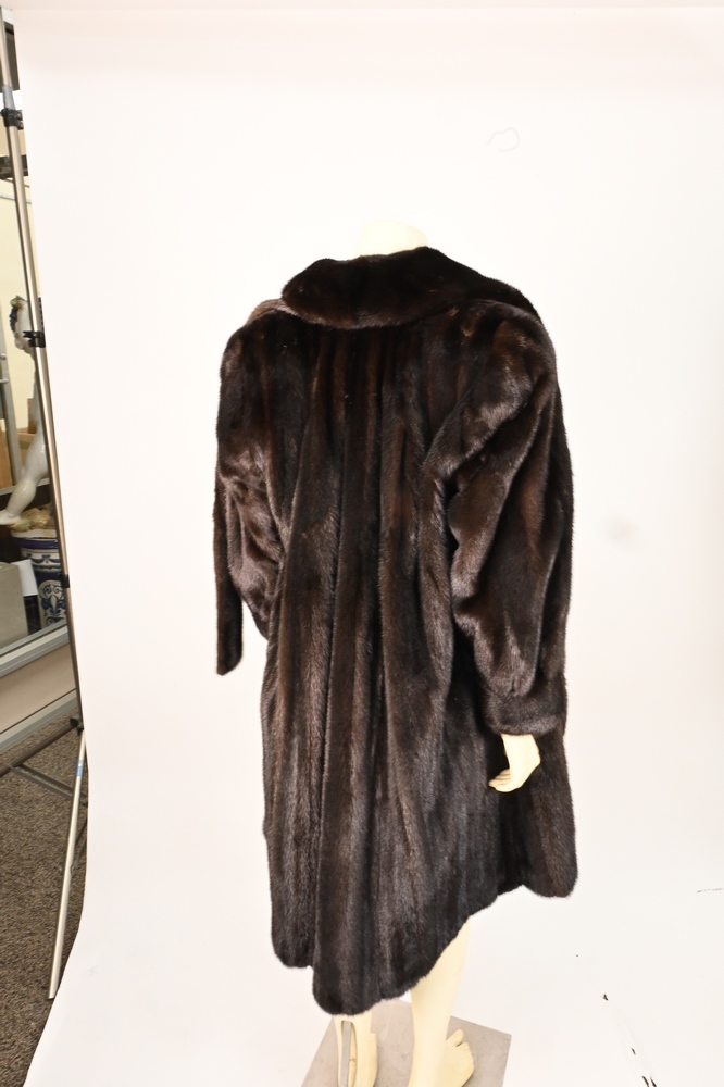 Lot 154: 3/4 Length Brown Mink Coat, having notched collar, banded cuffs, side slip pockets and removable sash, fur is supple, size medium.