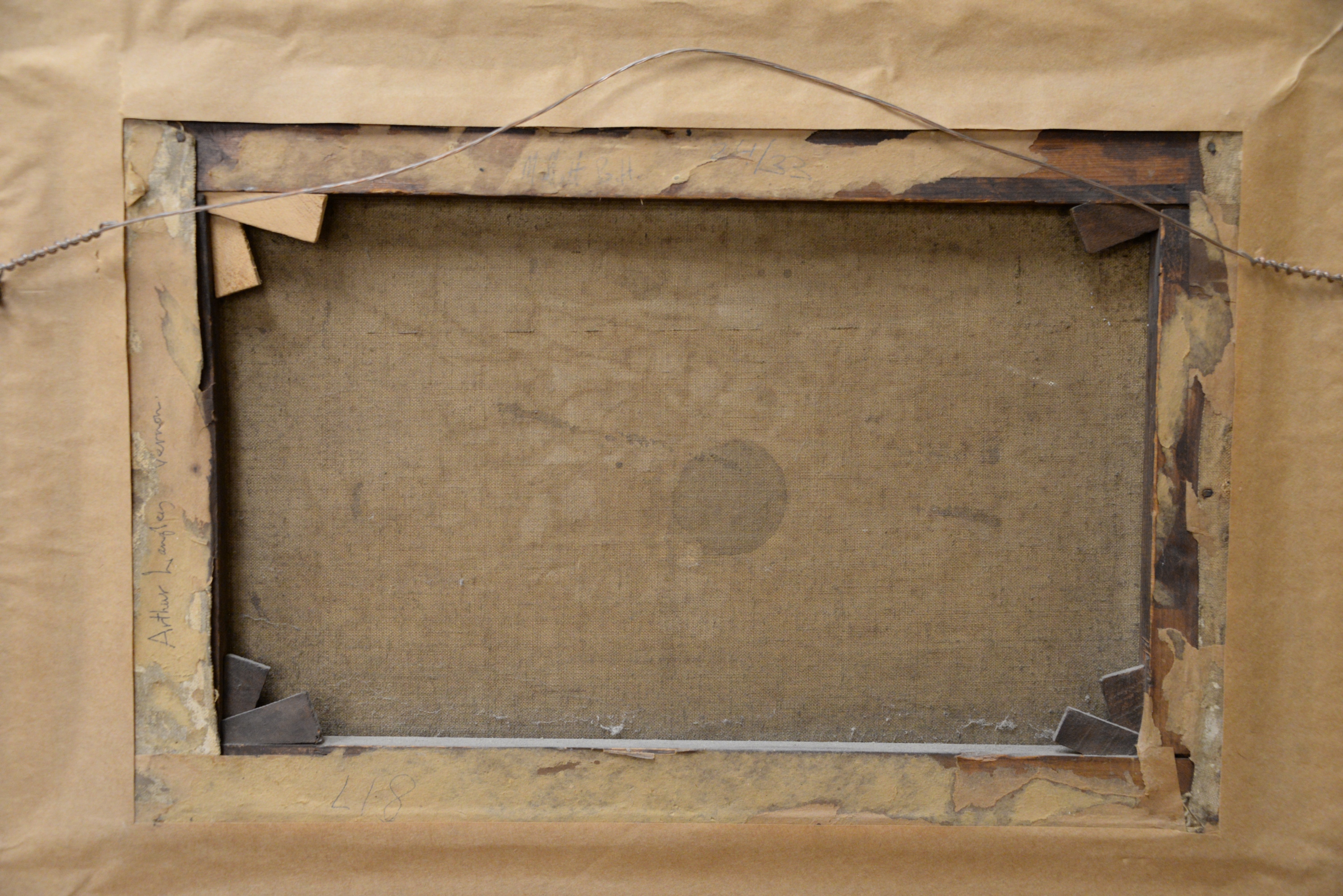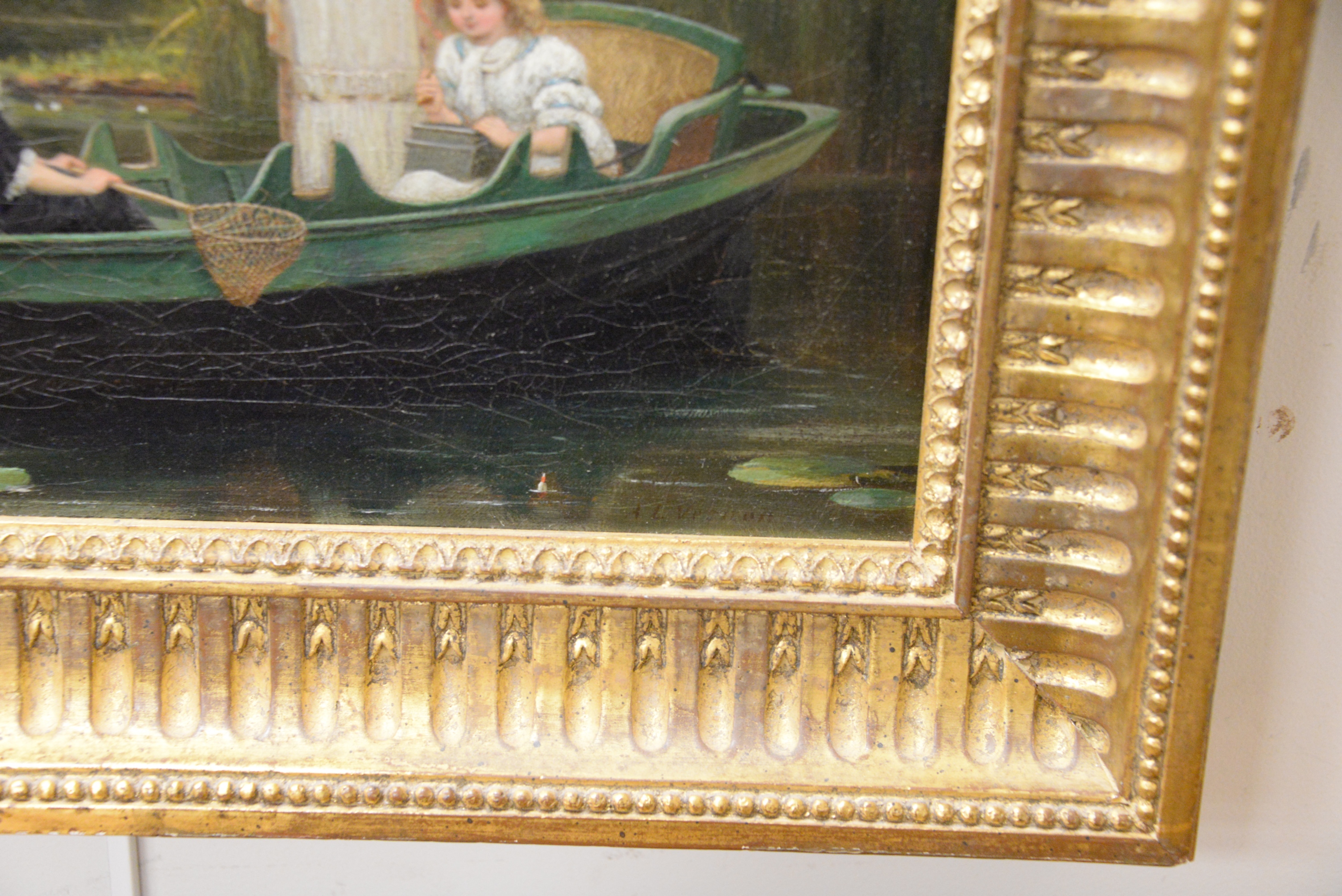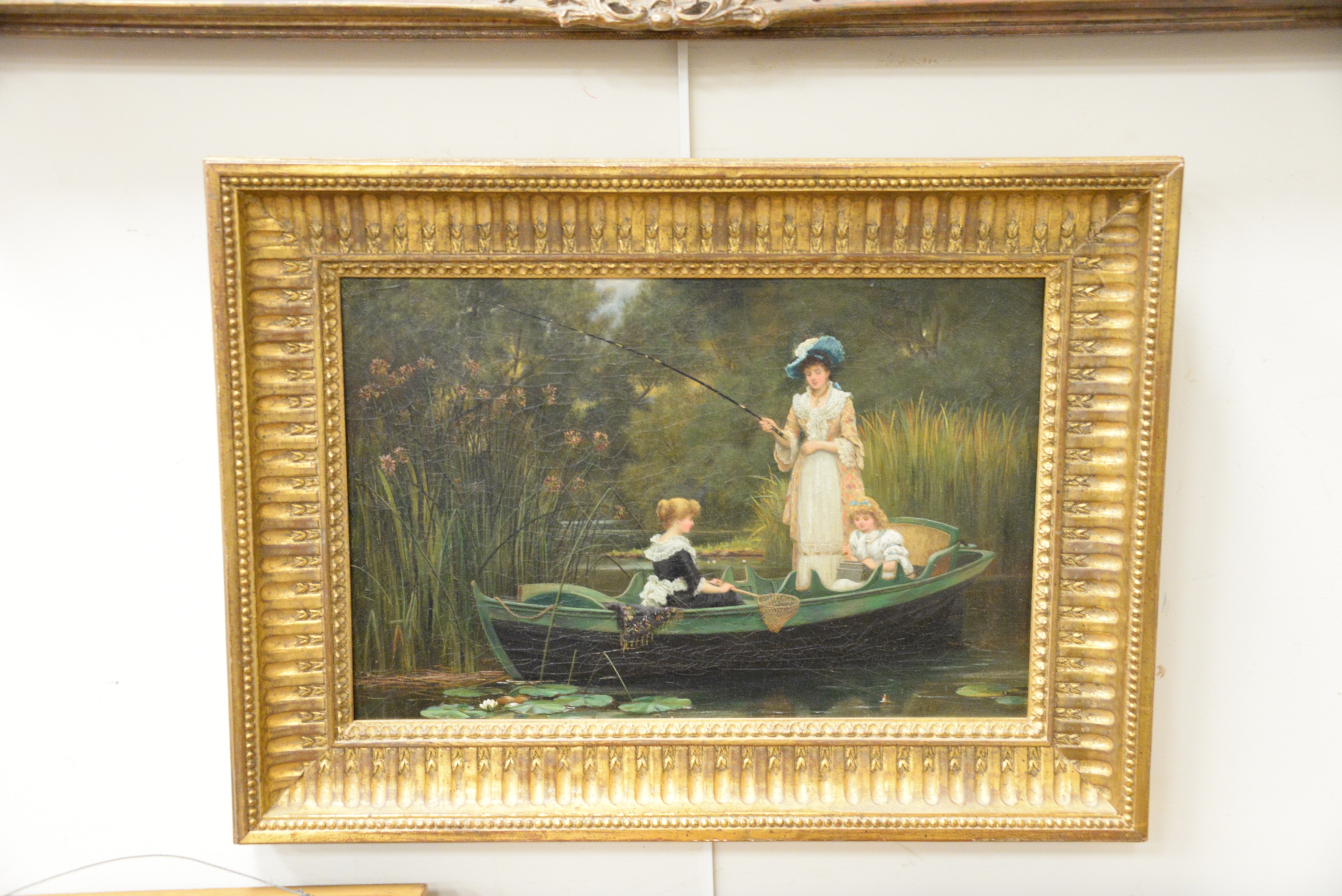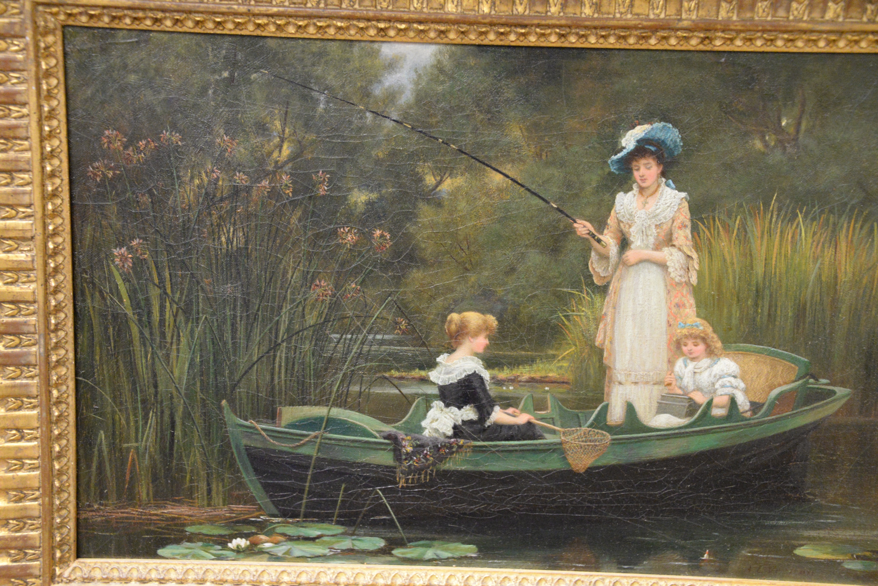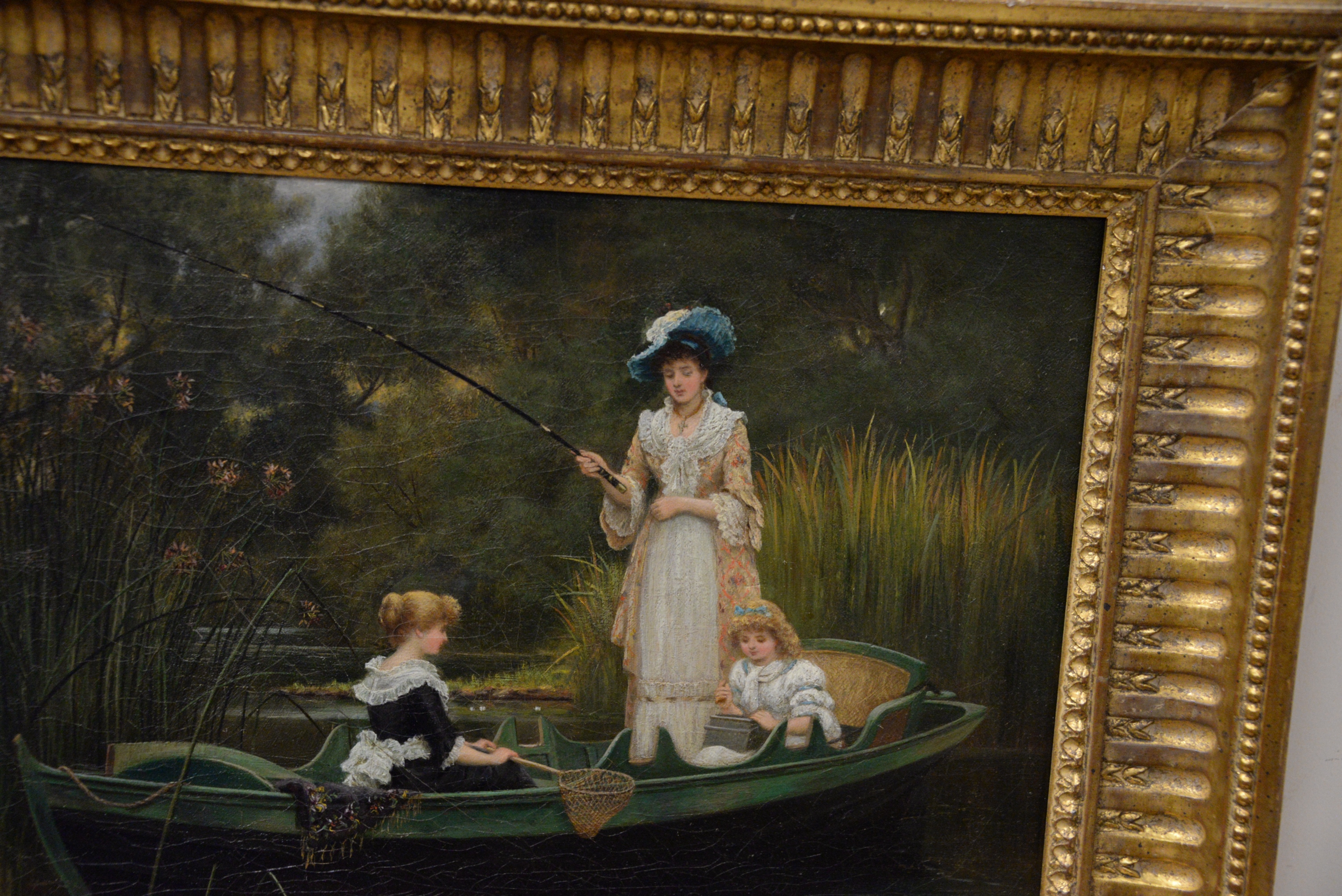 Arthur Longley Vernon (British 1871 – 1922), “Ladies Fishing” oil on canvas signed “Al Vernon” lower right 12″ x 17 1/2″