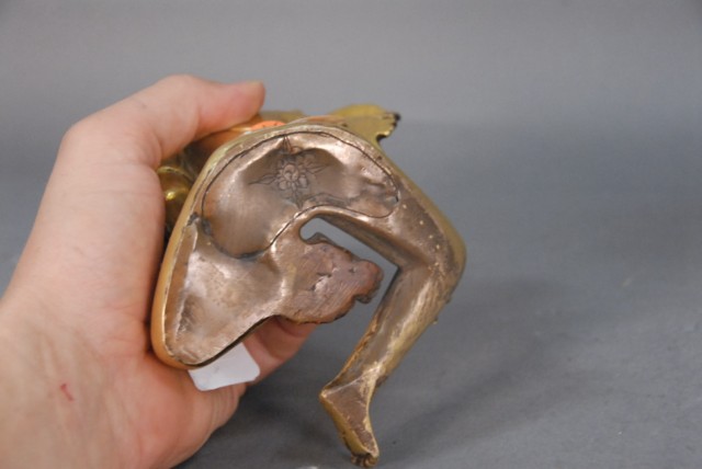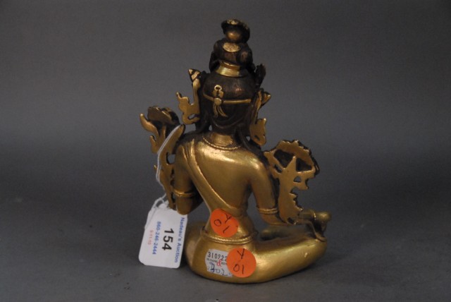 Bronze seated GuanYin figure in gold wash having blossoming flower over each shoulder