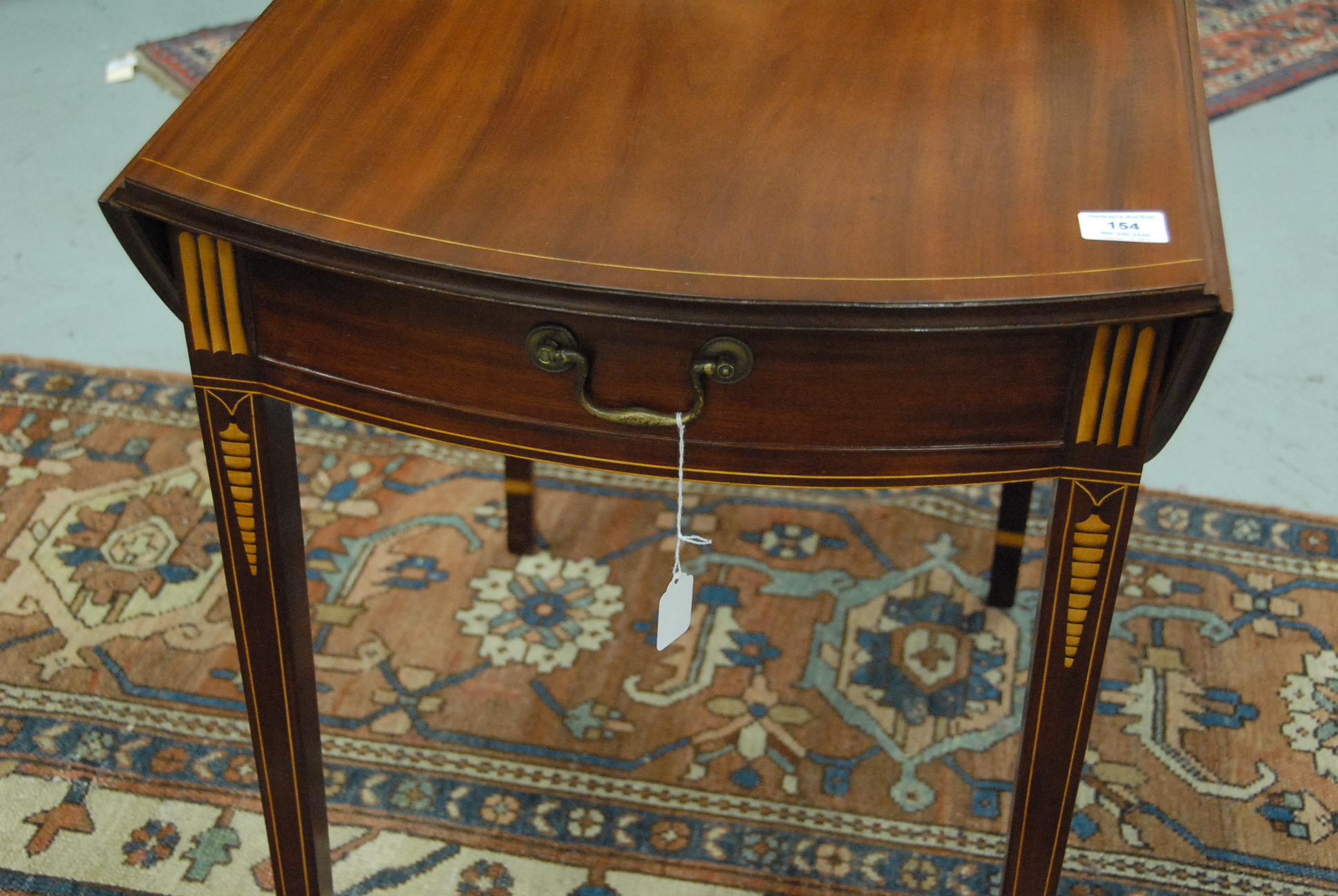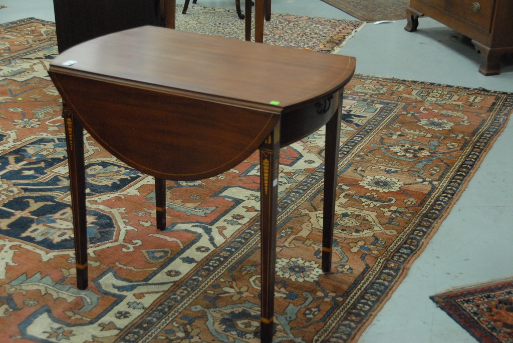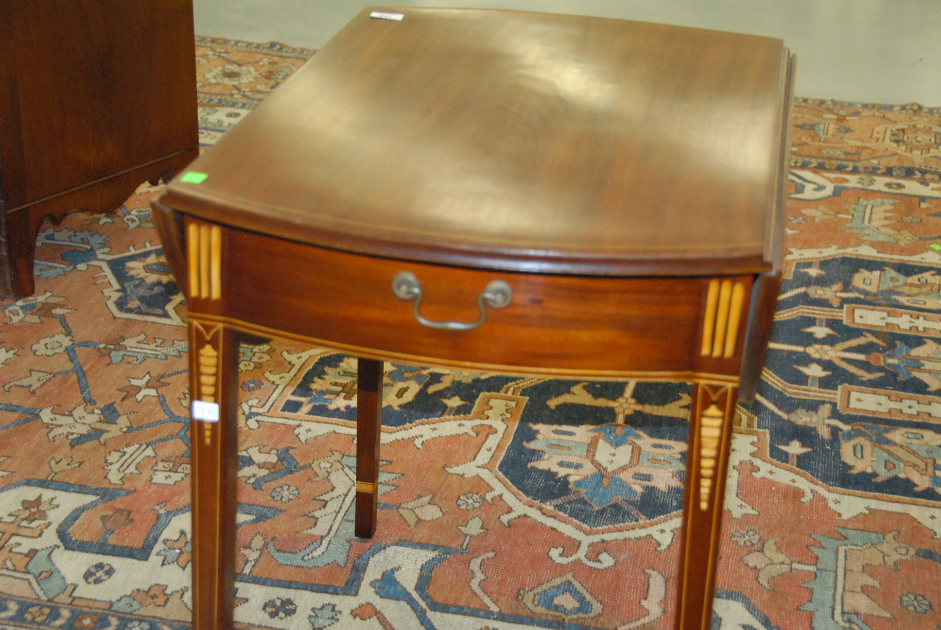 Lot 154: Federal mahogany Pembroke drop leaf table, top with oval drop leaves and rounded ends over bowed drawer, all with line inlay set on square tapered legs with icicle and bookend inlay. ht. 28 1/4in. dp. 32in.