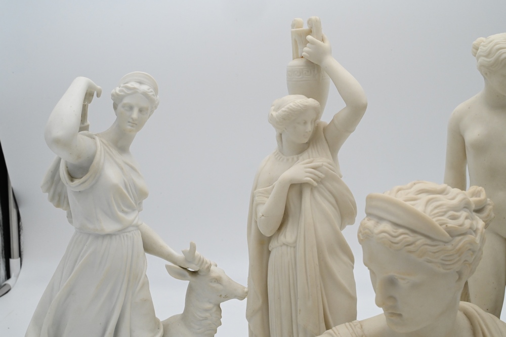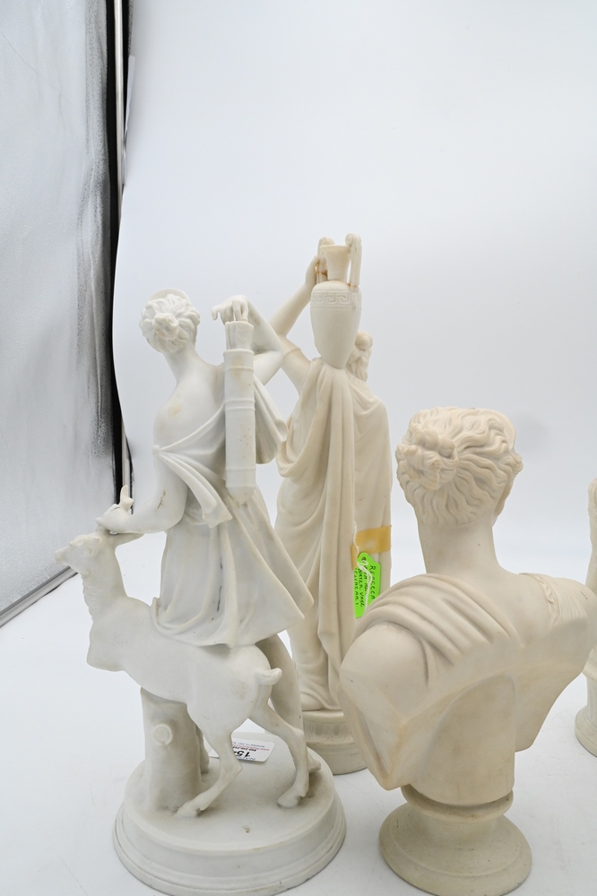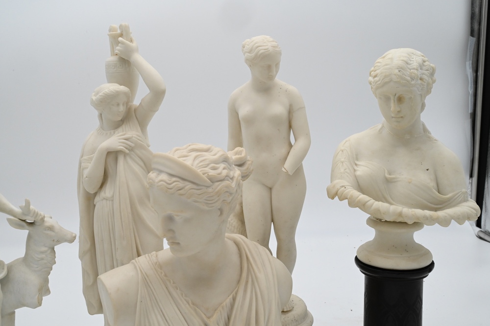 Five Parian Porcelain Figures, to include bust of Clytie (as is); bust of a woman with headdress; woman reaching for an arrow holding a deer; Rebecca with her water vase; along with a nude; all as is, tallest 14 inches.