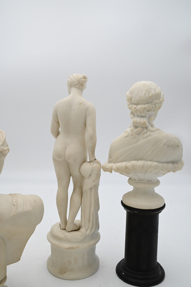 Lot 154: Five Parian Porcelain Figures, to include bust of Clytie (as is); bust of a woman with headdress; woman reaching for an arrow holding a deer; Rebecca with her water vase; along with a nude; all as is, tallest 14 inches.