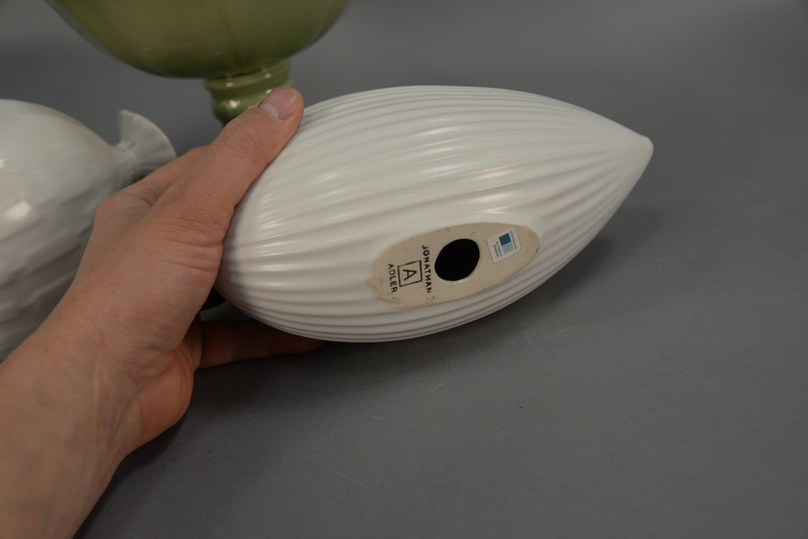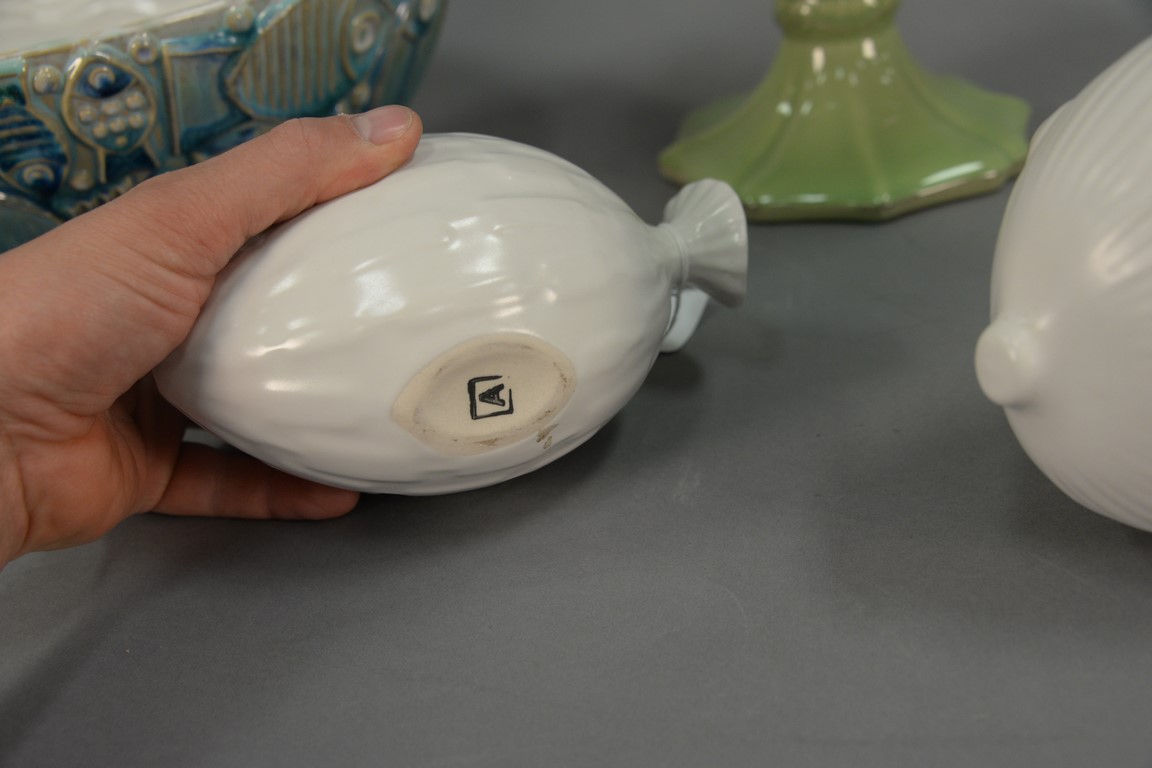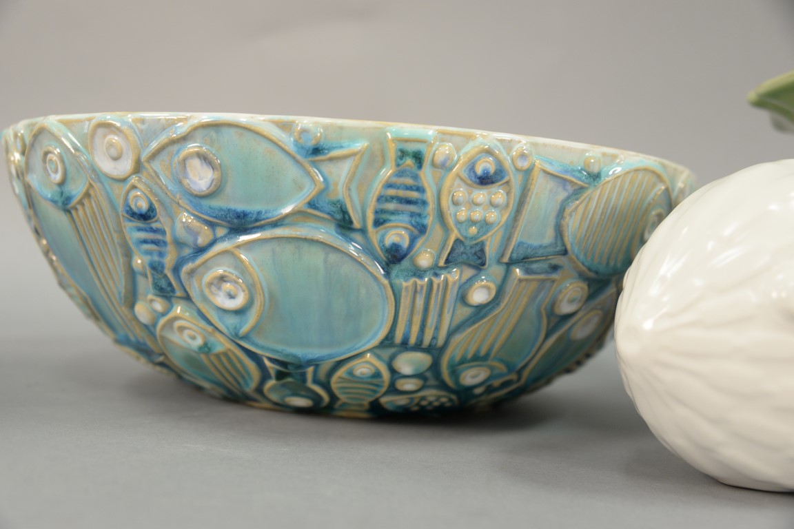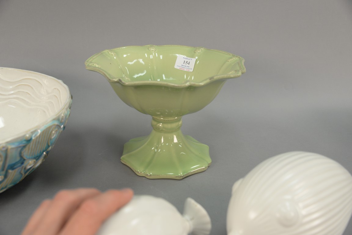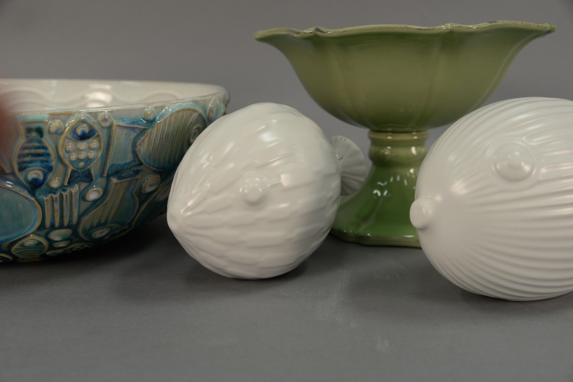 Five piece group to include global views ceramic glazed bowl dia. 14 1/2in., Juliska berry and thread footed compote ht. 7in., lg. 10in., art glass bowl 13in., and two Jonathan Adler handmade Peru white pottery fish.