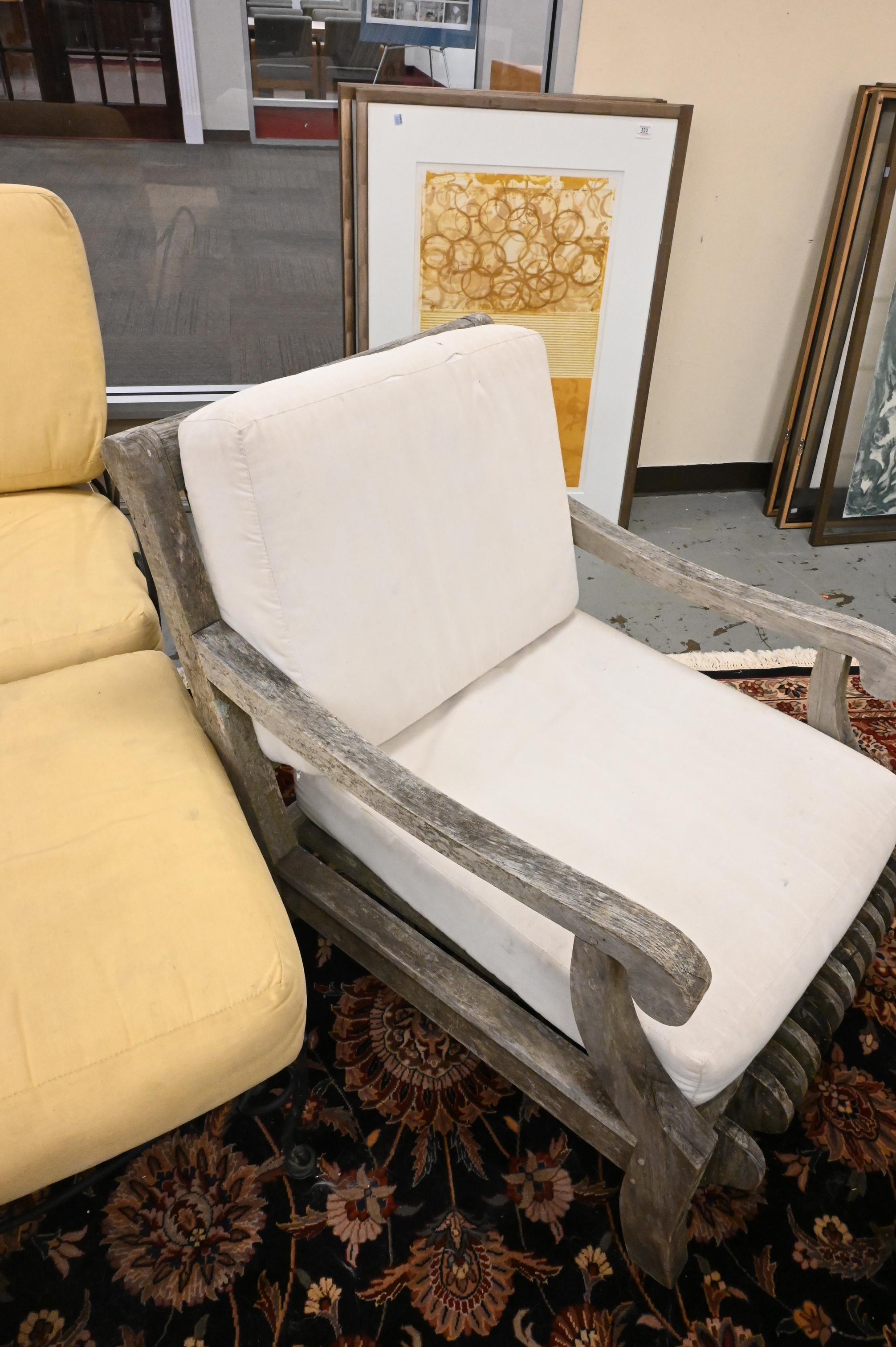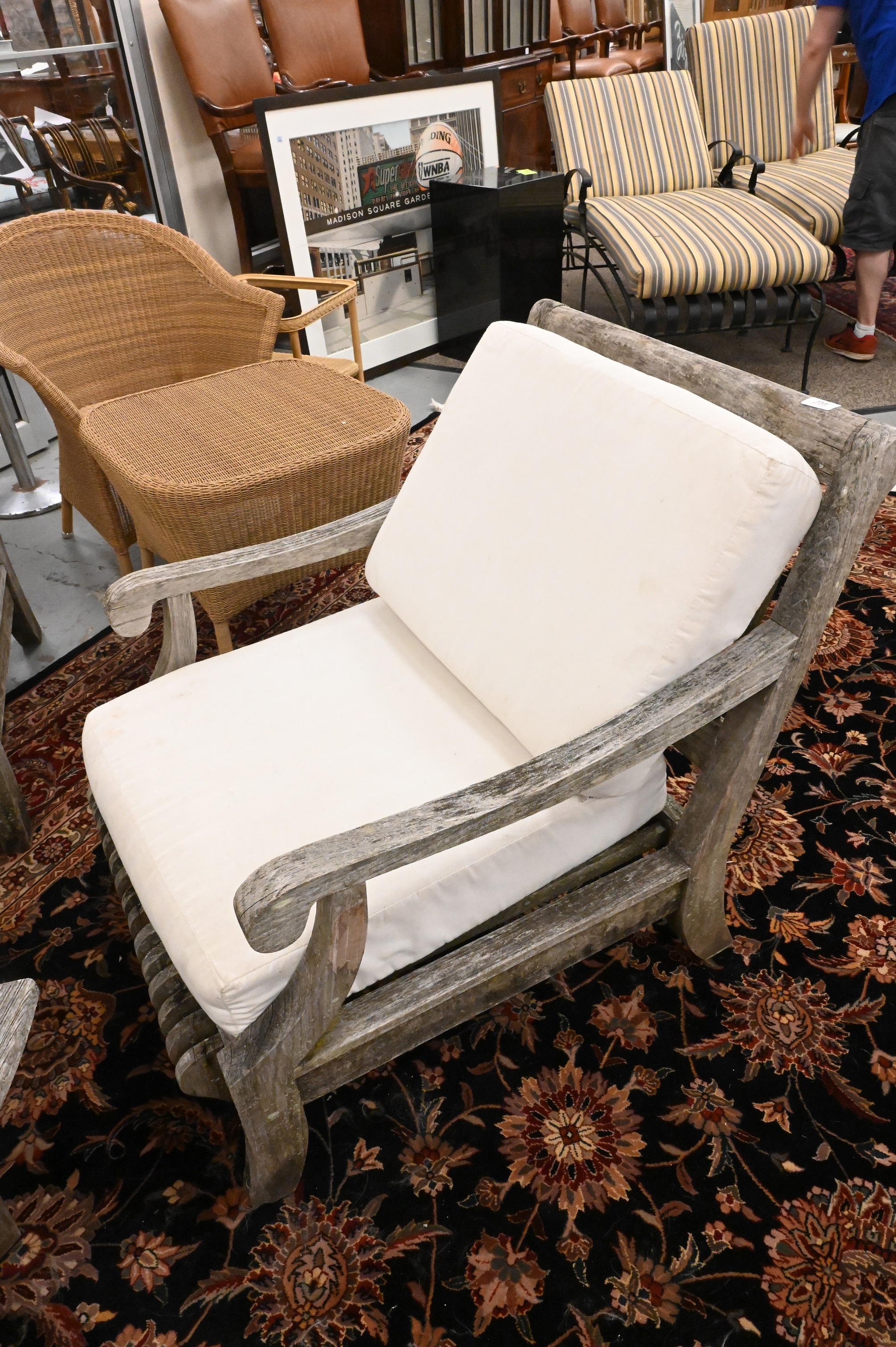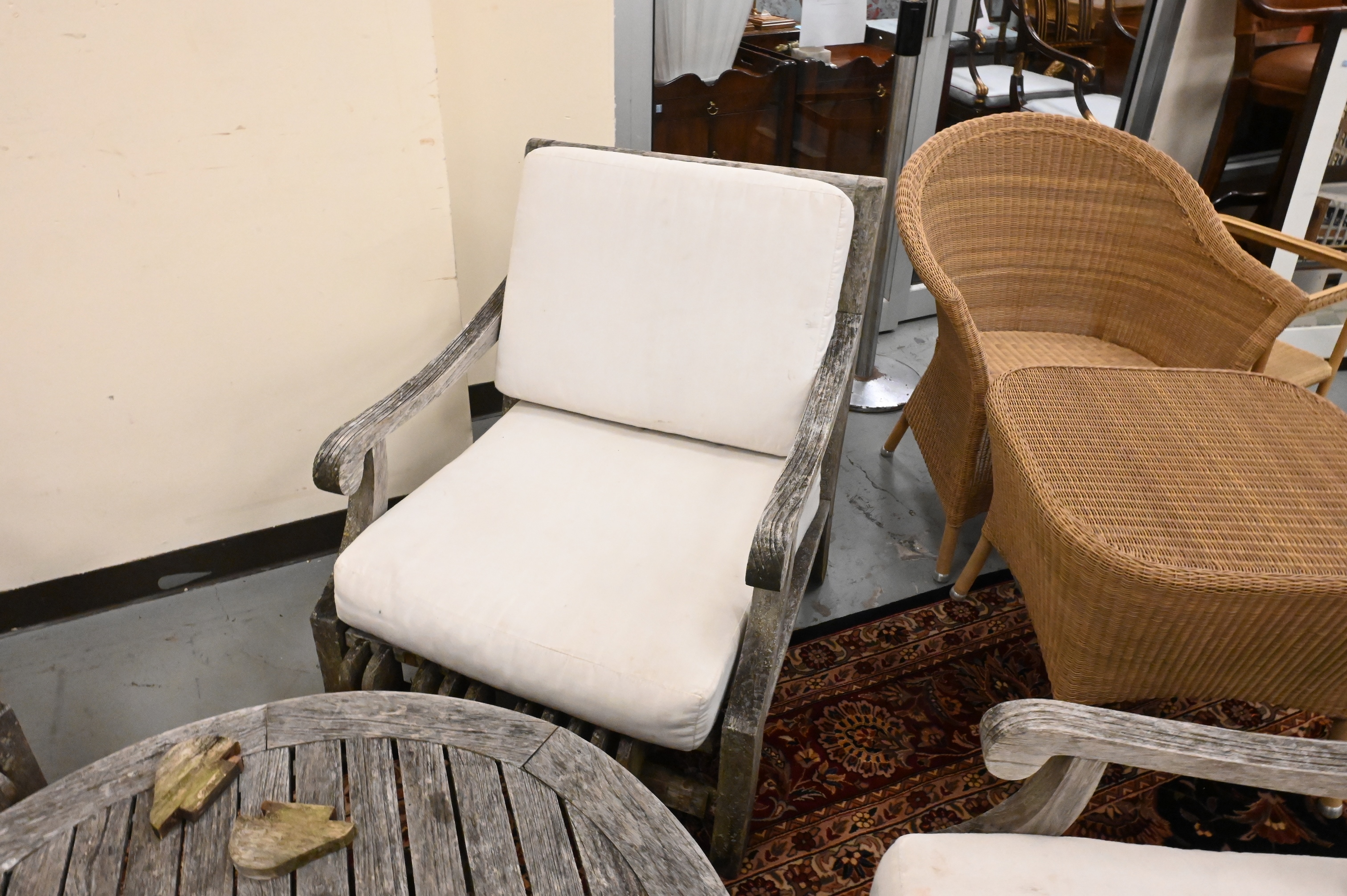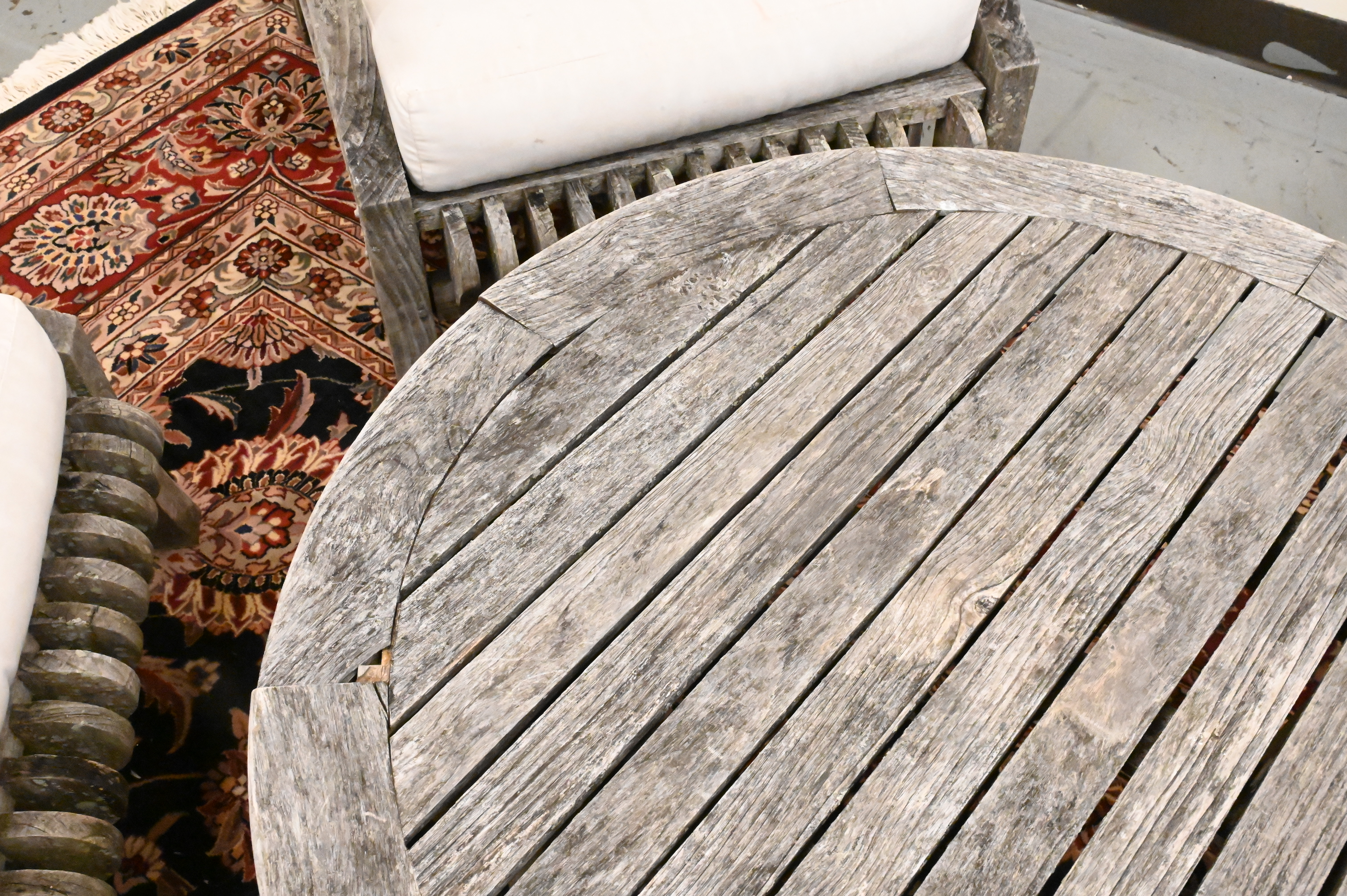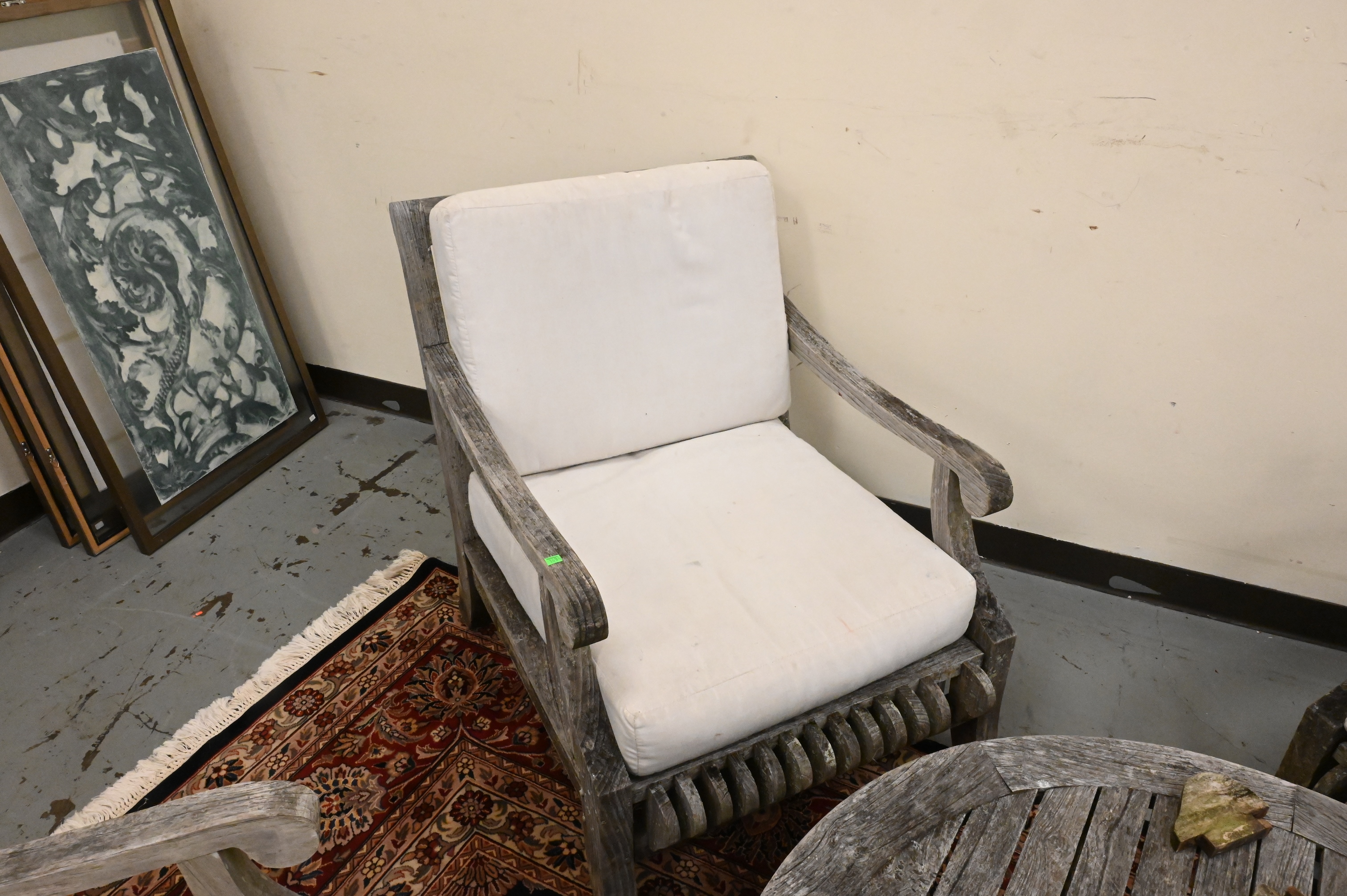 Five Piece Outdoor Teak Patio Set, to include set of four oversized armchairs, height 33 inches, width 27 1/2 inches.