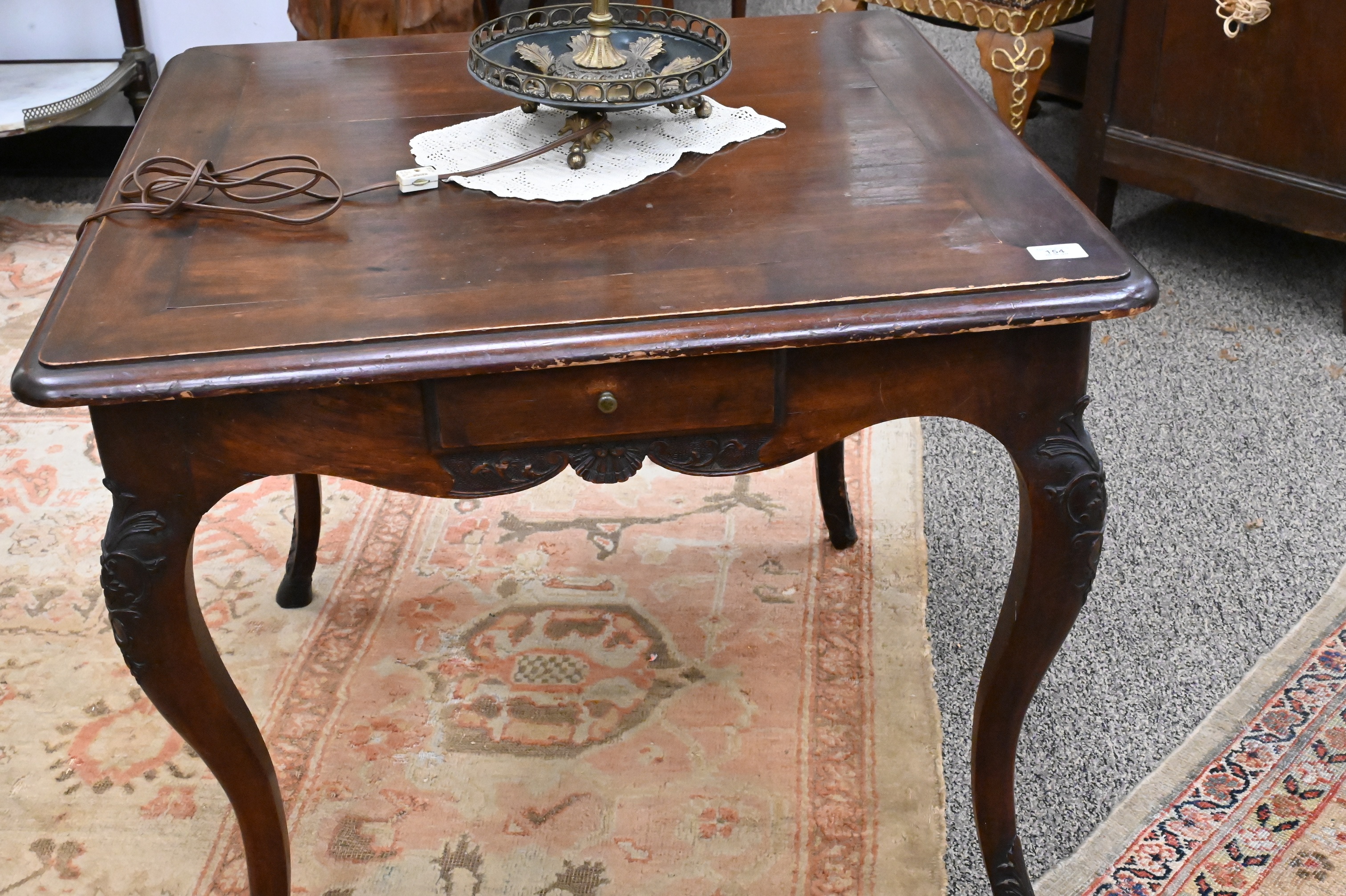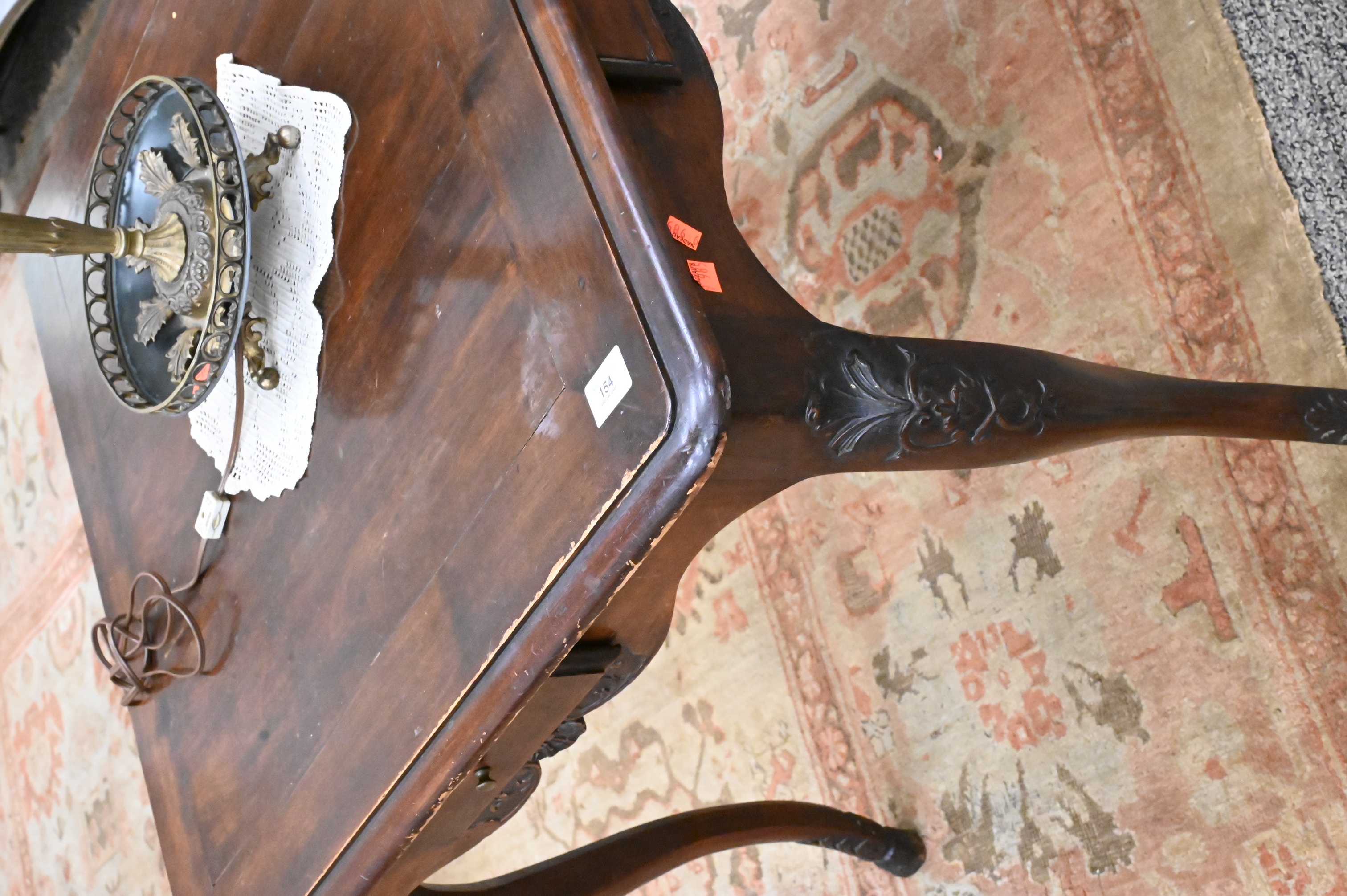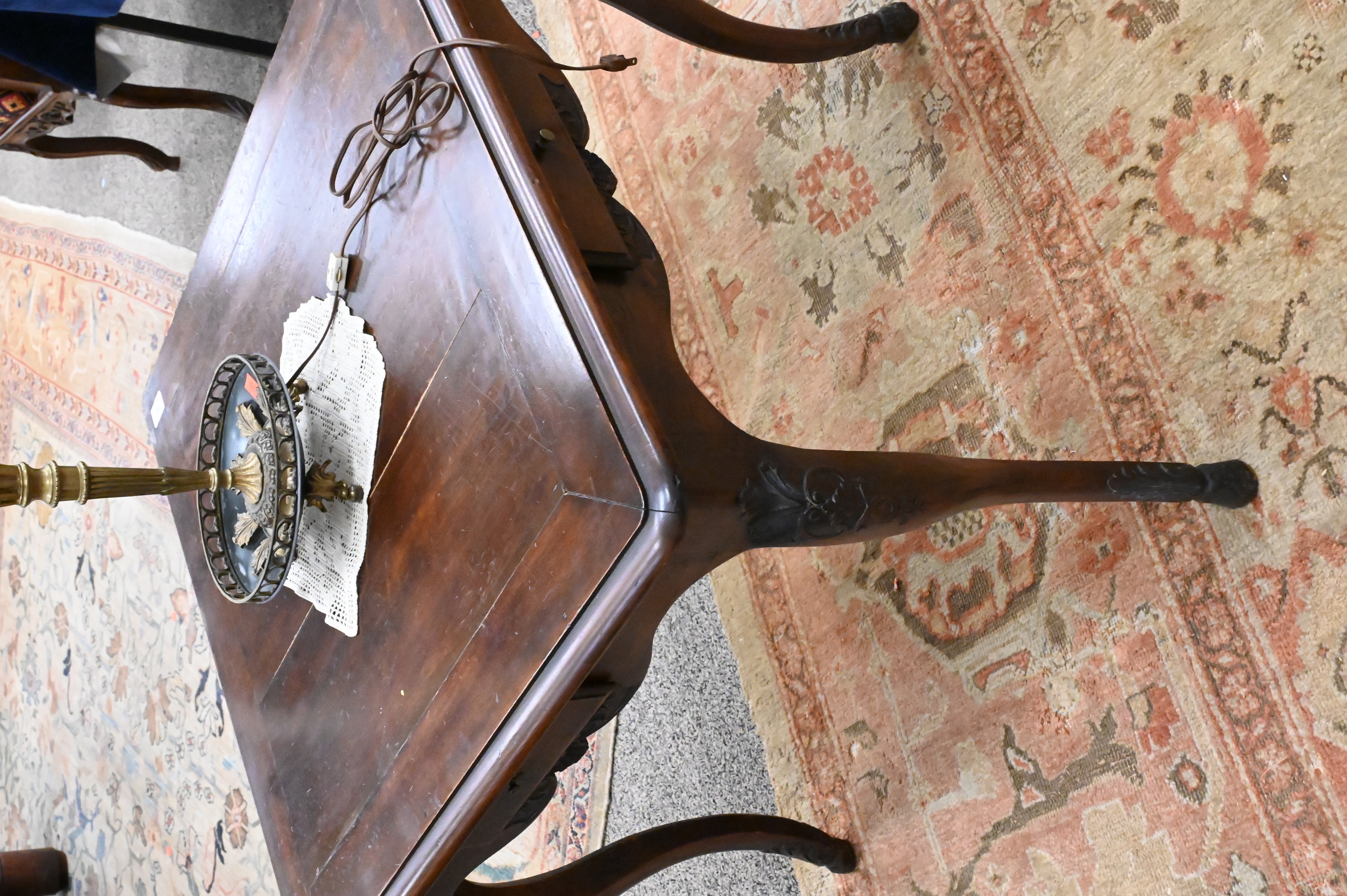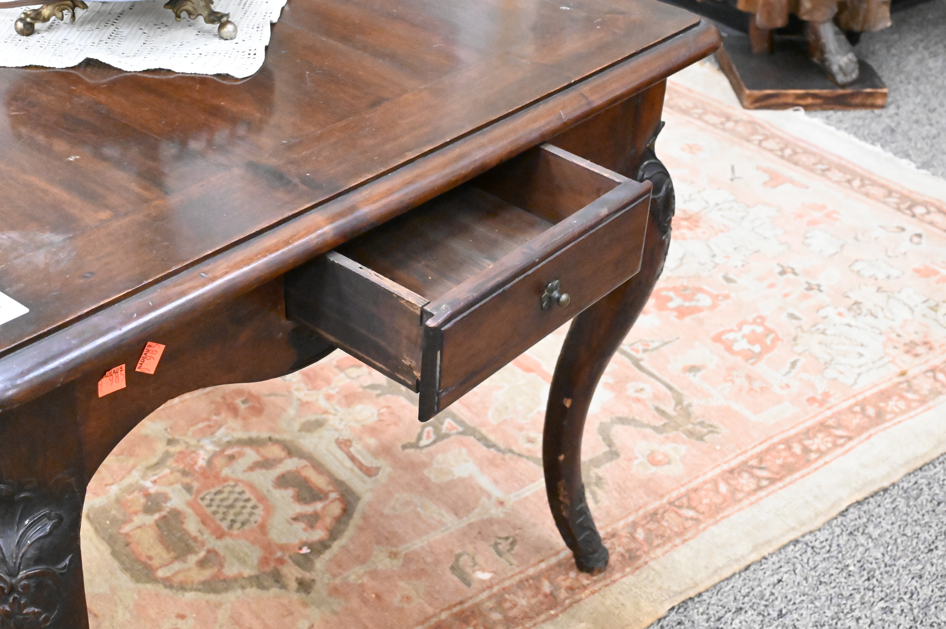 of rectangular form, fitted with four functional drawers—one on each side—beneath a molded edge top, each with carved shell and foliate ornament below, raised on cabriole legs finely carved at the knees and terminating in hoof feet, rich warm walnut patina throughout, 19th century