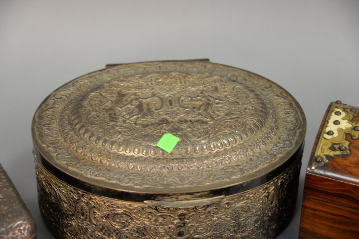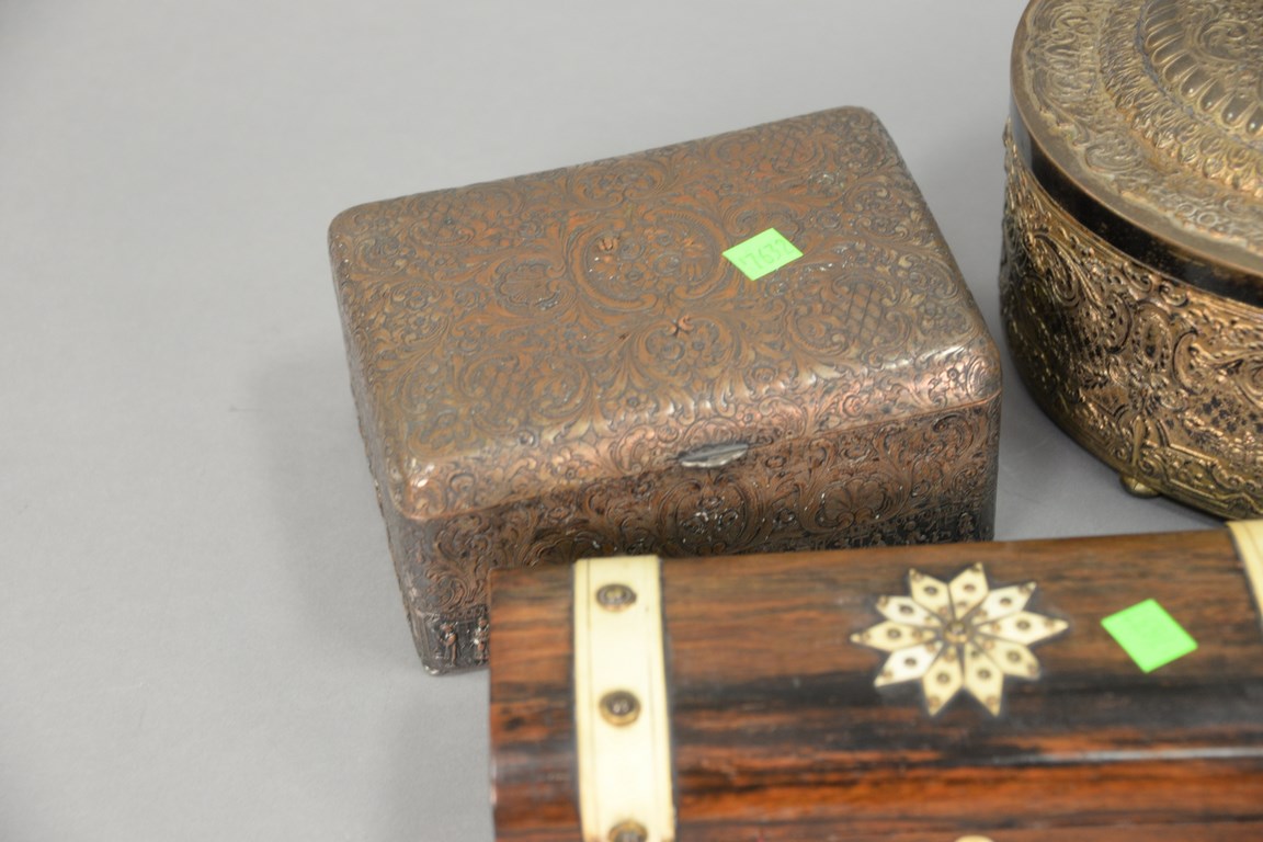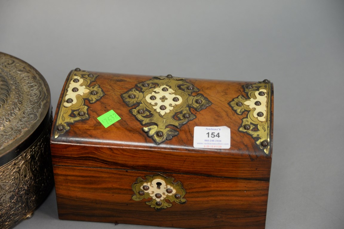 Group of five lift top boxes including rosewood cigar box, burlwood tea caddy mounted with brass and bone, rosewood dome top box and two silverplated boxes. smallest: ht. 3 1/2 in. wd. 7 1/2 in., largest: ht. 4 1/2 in. wd. 12 in.