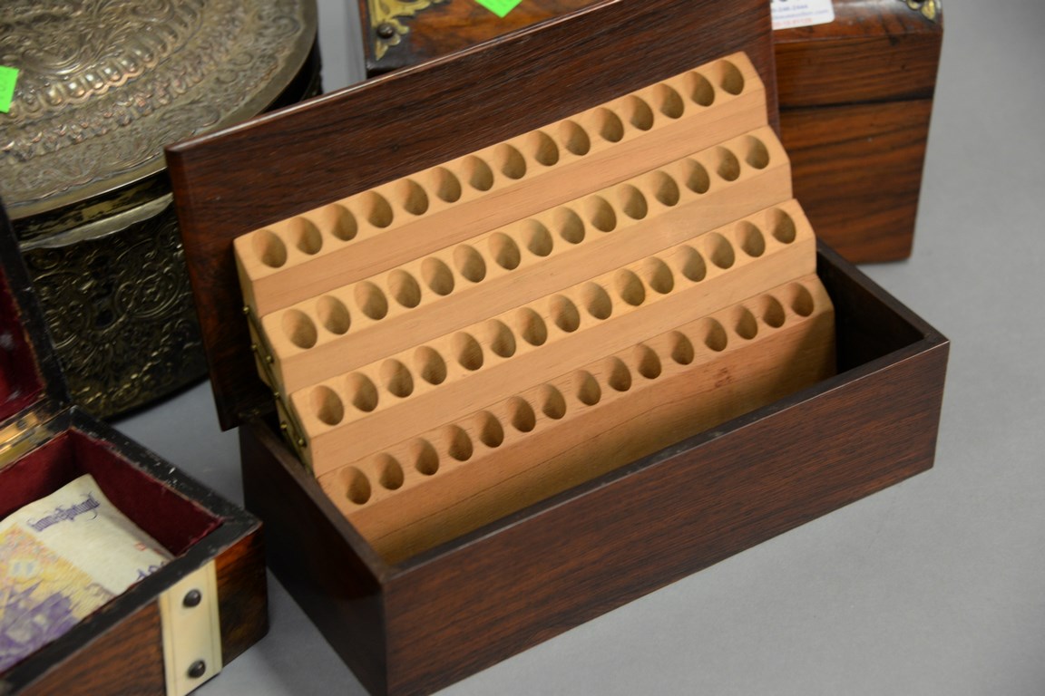 Lot 154: Group of five lift top boxes including rosewood cigar box, burlwood tea caddy mounted with brass and bone, rosewood dome top box and…