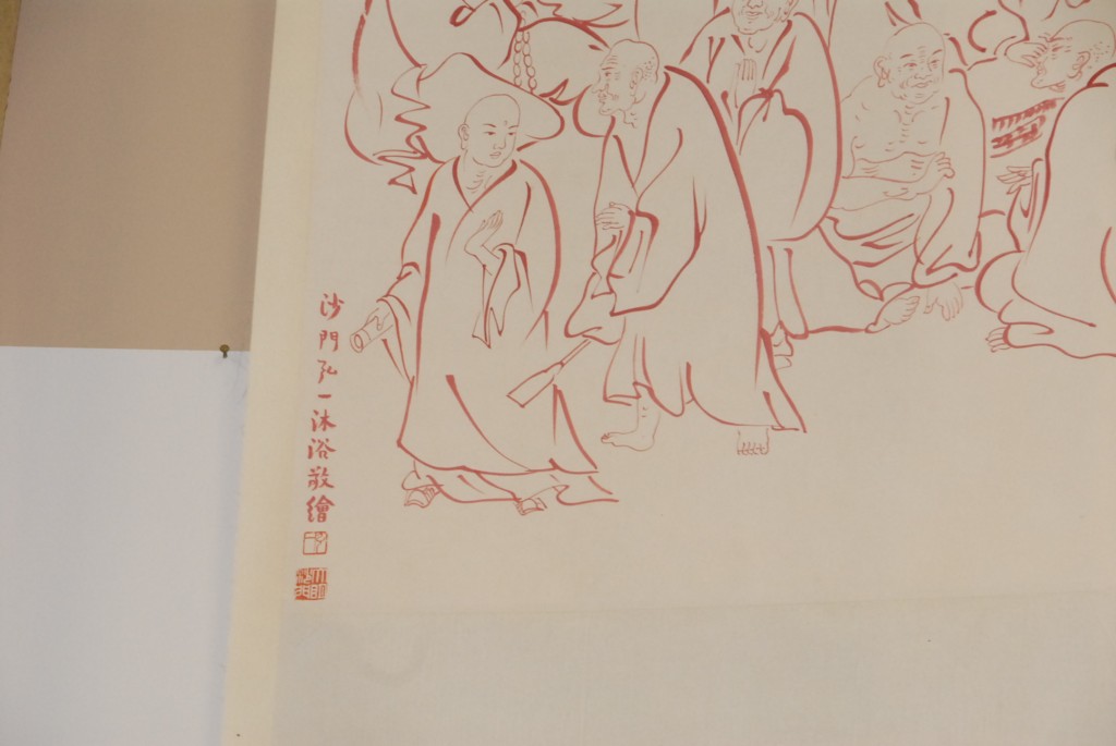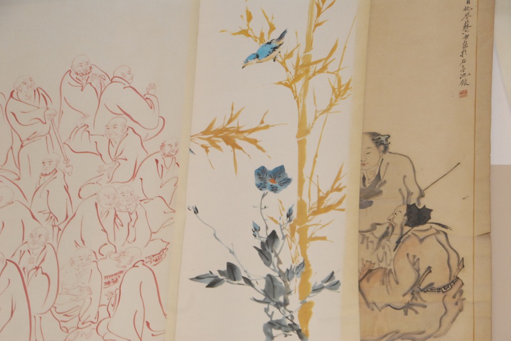 Group of three Oriental scrolls red and white watercolor of figures 37 x 22, watercolor of trees and birds 36 x 19, and watercolor of woman and scholar 47 x 16.