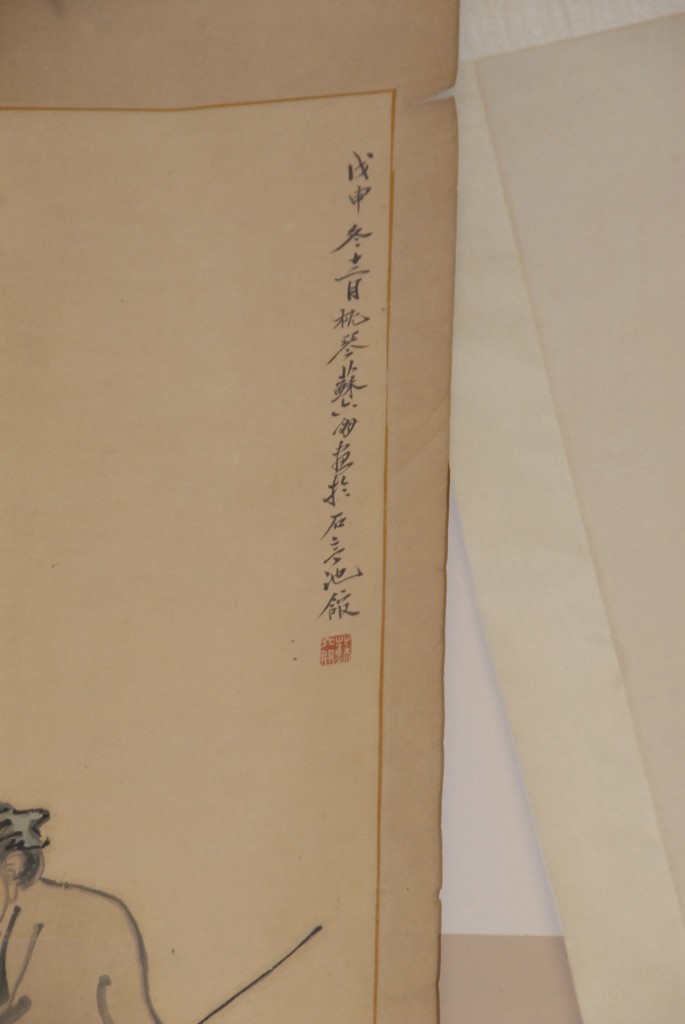 Lot 154: Group of three Oriental scrolls red and white watercolor of figures 37 x 22, watercolor of trees and birds 36 x 19, and waterco…