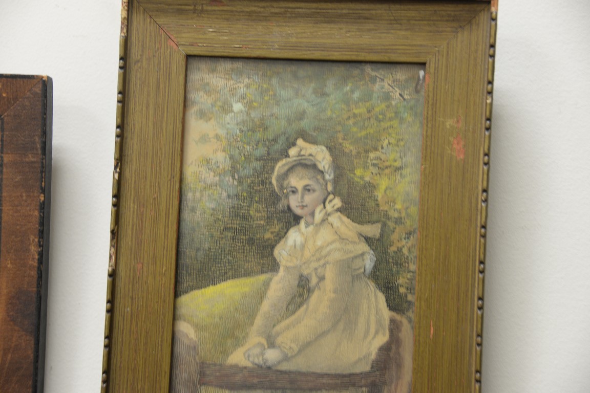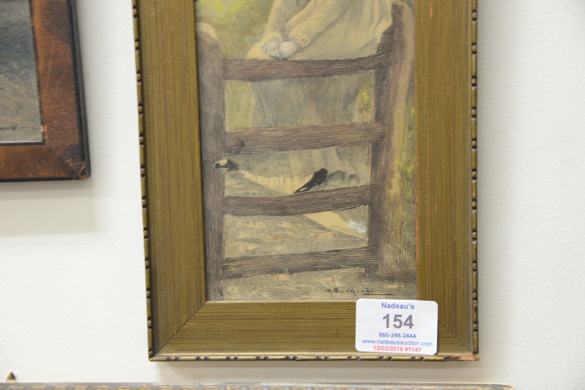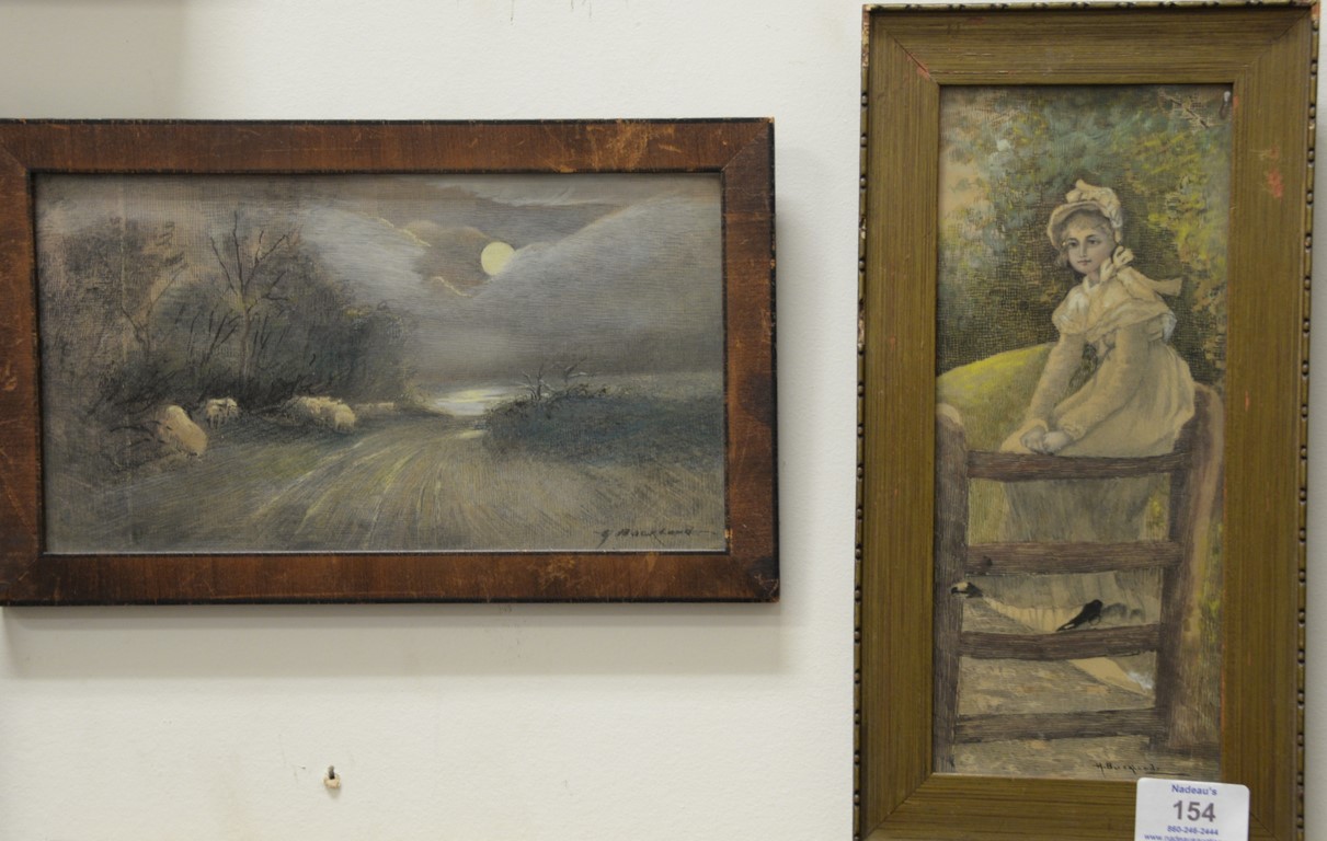 Harlan Paige Buckland two mixed media on paper Landscape with Moonlight Sky signed lower right: H. Buckland 5 3/4 x 10 Young Woman Sitting on a Fence signed lower right: H. Buckland 10 x 4 1/2