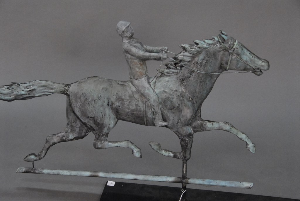 Lot 154: Horse and jockey weathervane, full bodied copper. ht. 18in. lg. of weathervane 26in. base wd. 28in.