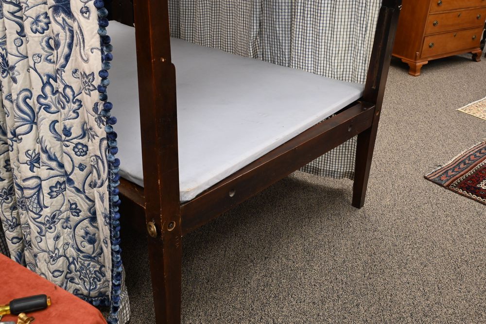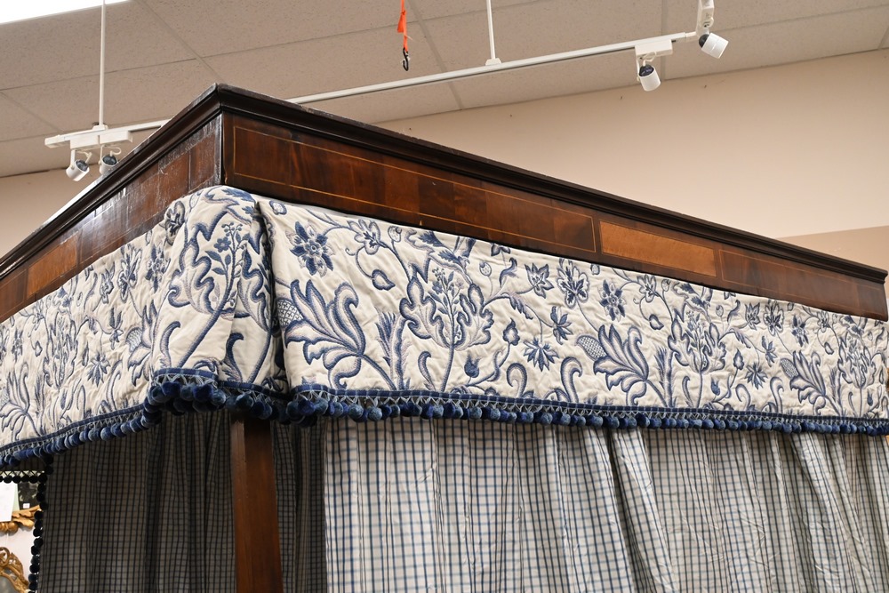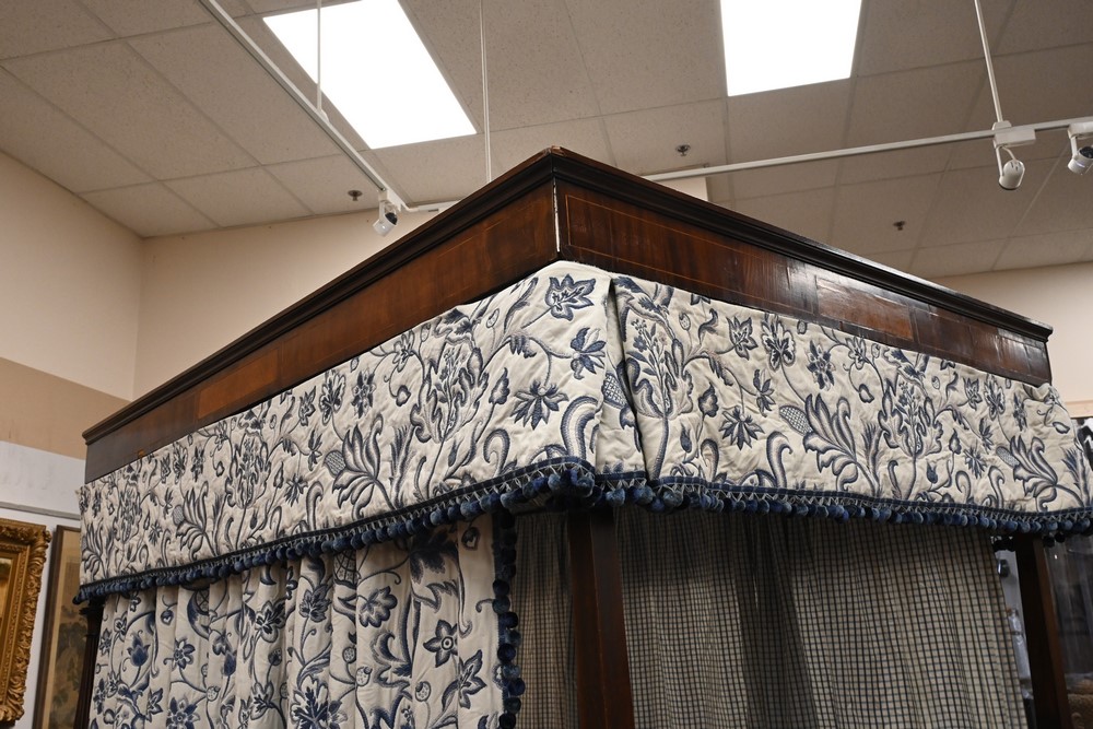 Lot 154: Sheraton Mahogany Four Post Canopy Bed having mahogany framed panel inlay canopy double size circa 1830 total height 93 inches interior width 48 inches