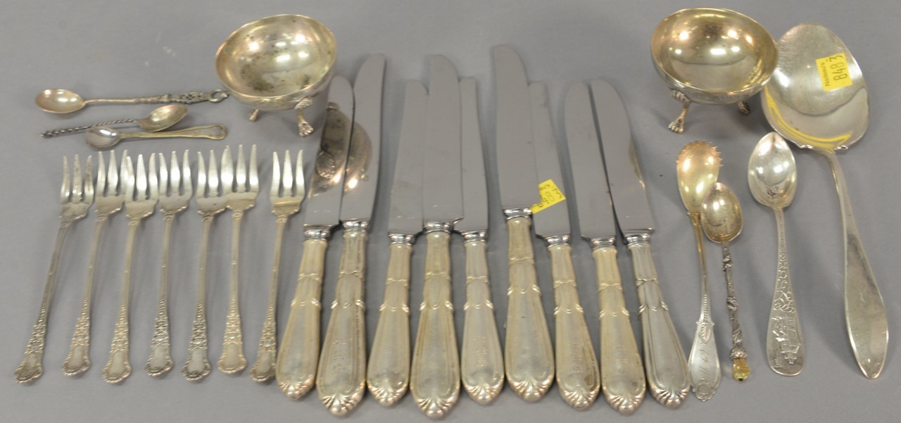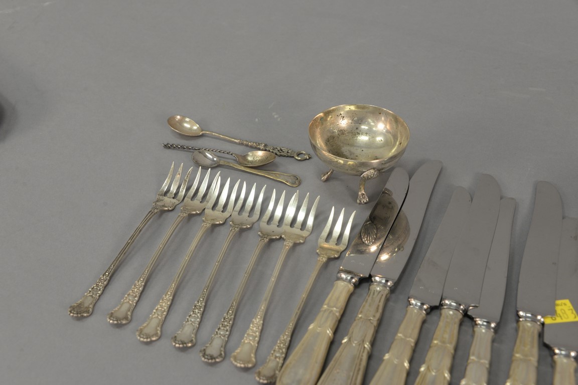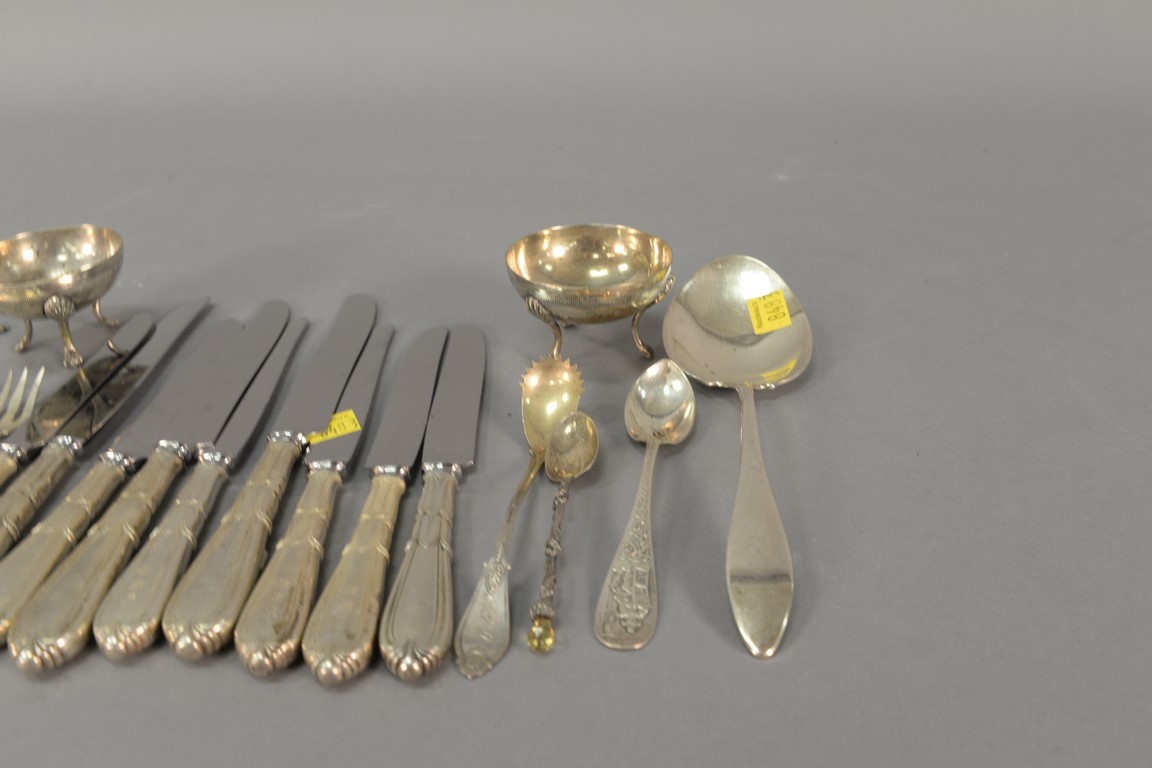 Silver lot with pair of salts, various spoons and forks. 14 troy ounces plus 9 handles