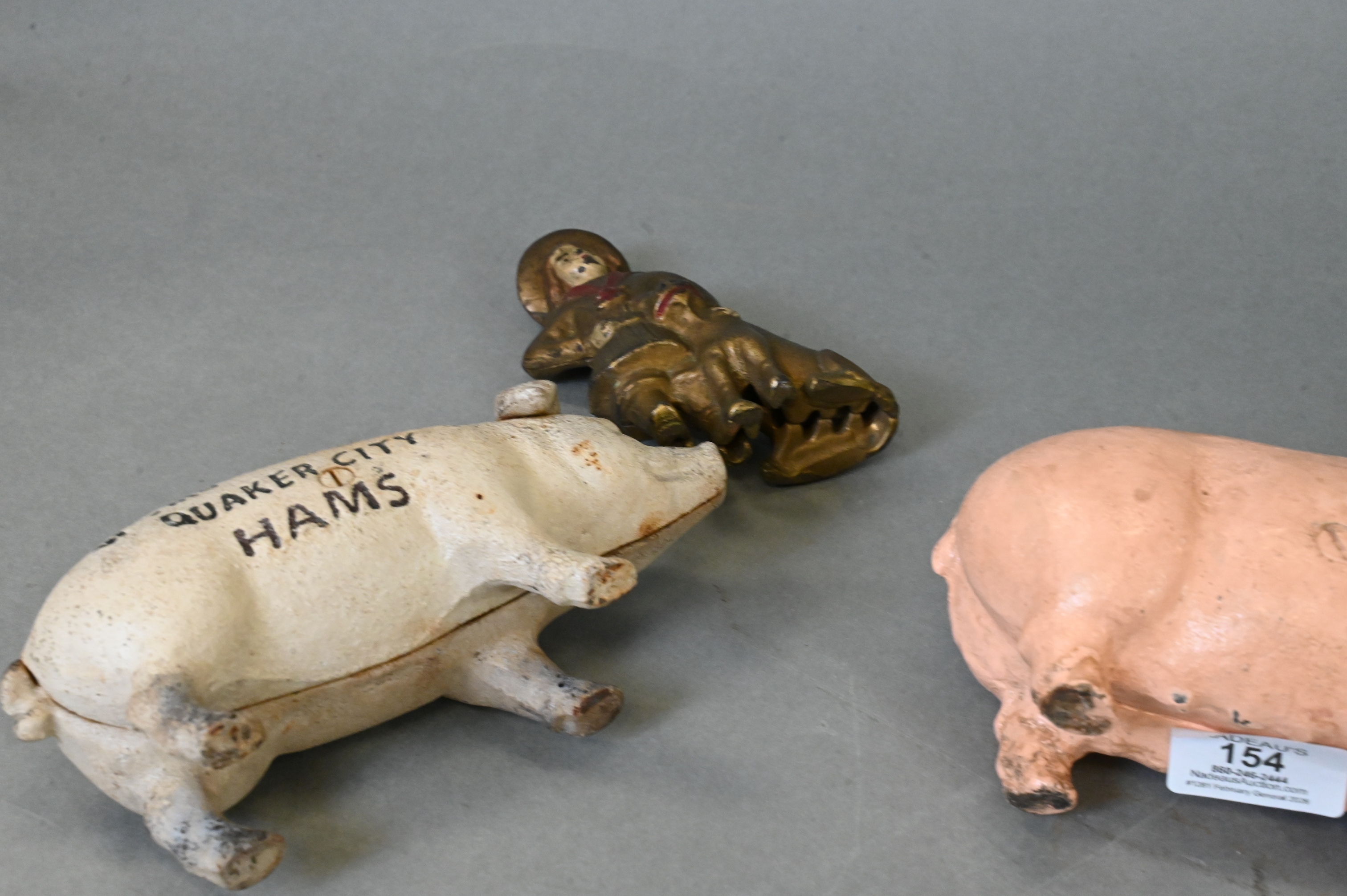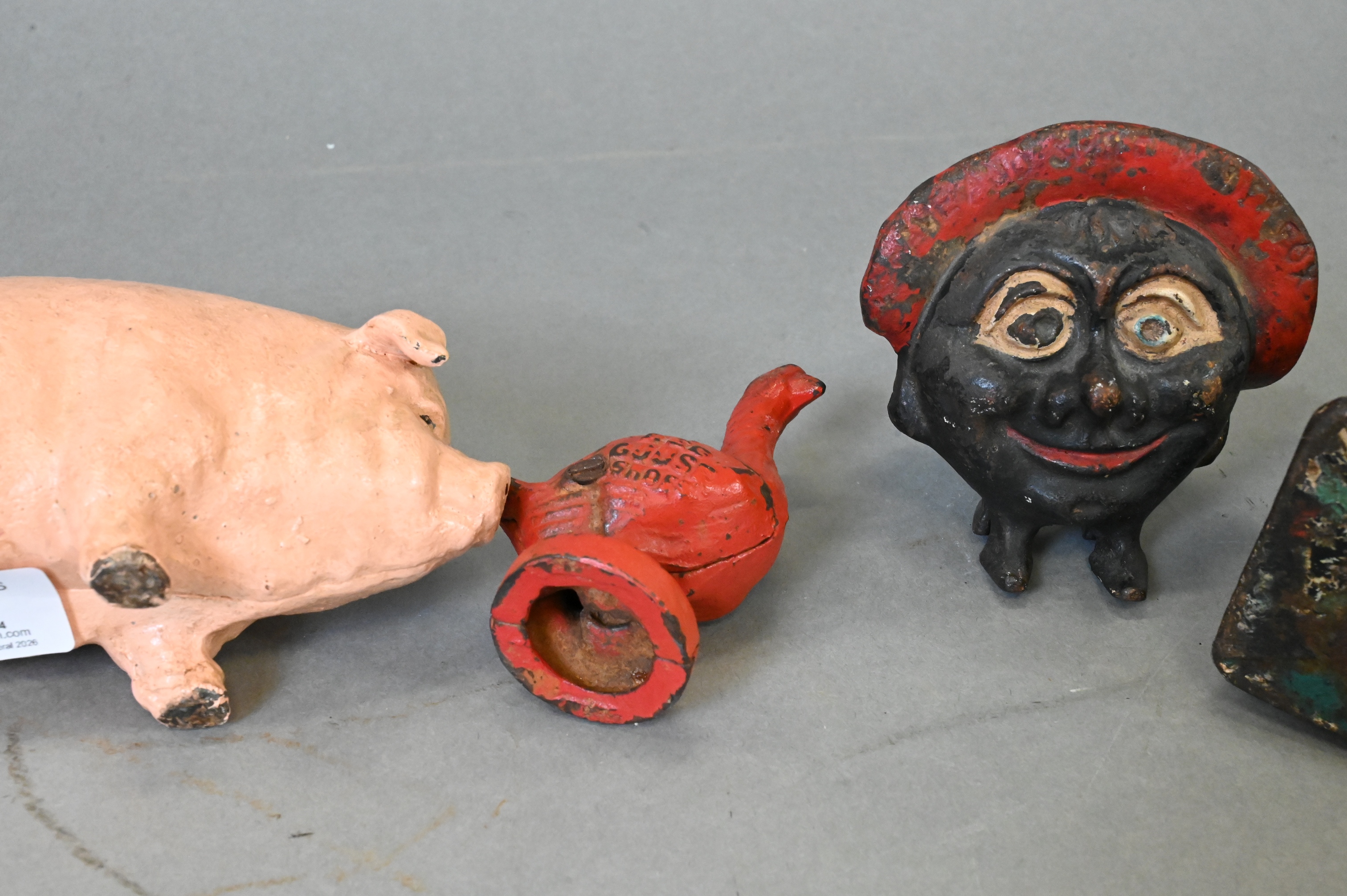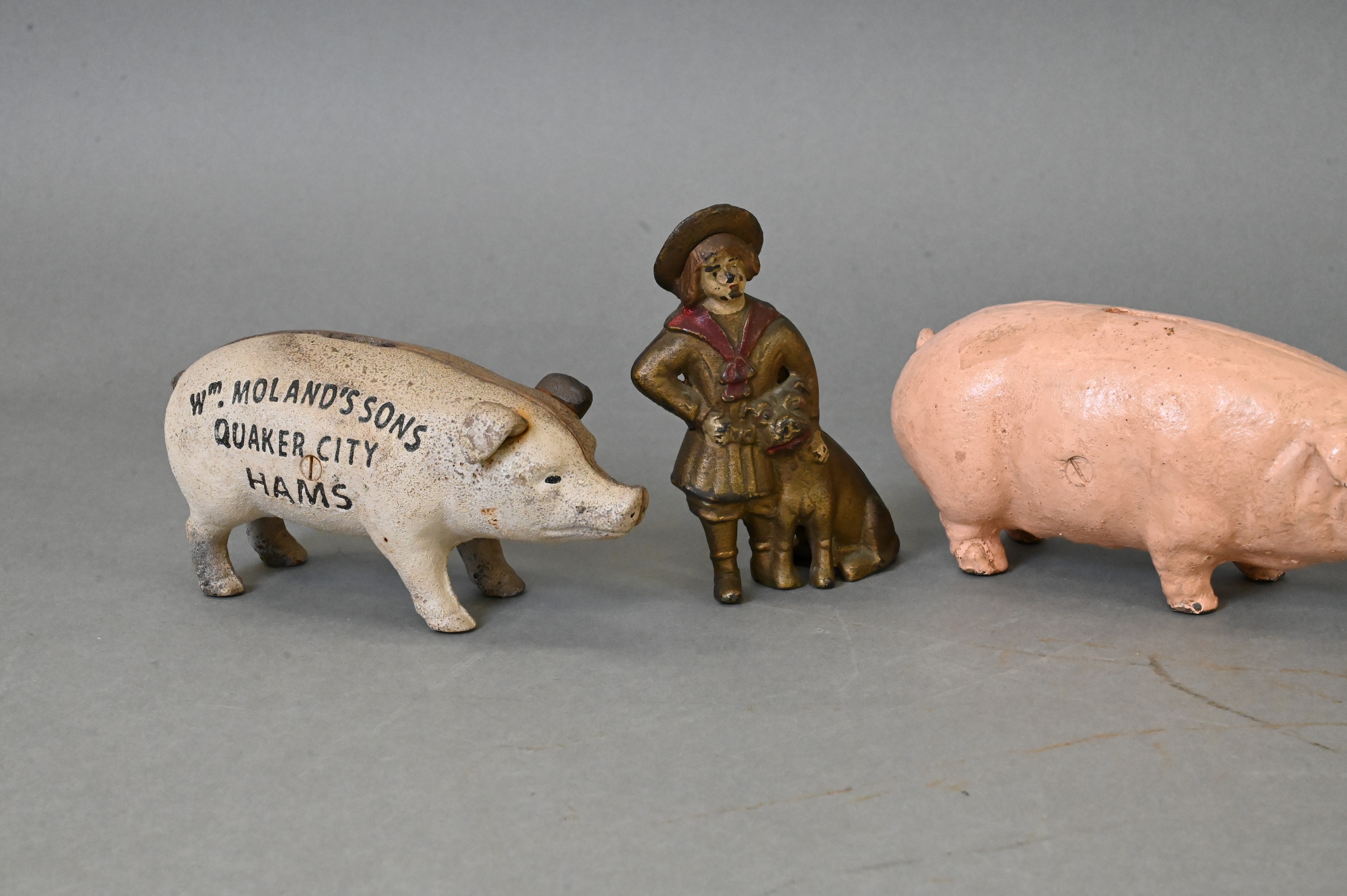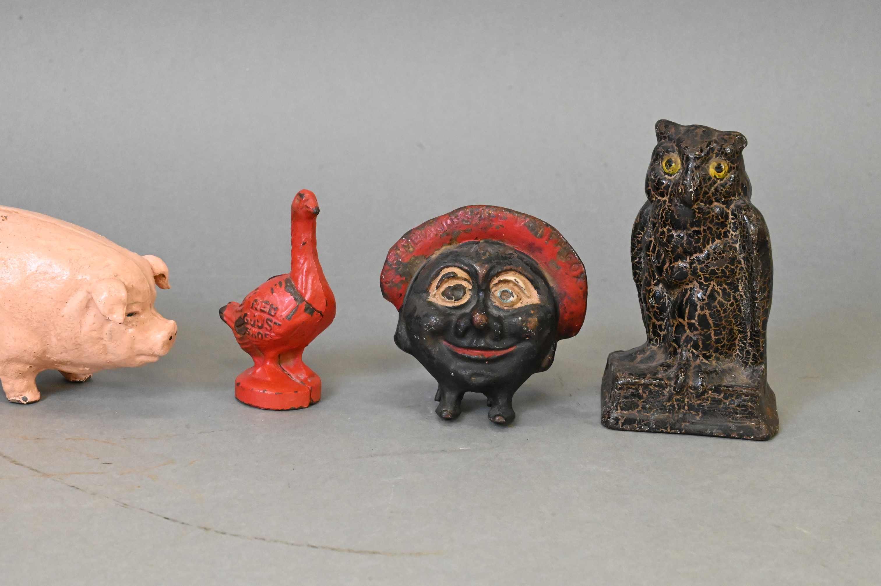 William Moland’s Sons, Quaker City, Hams Novelty Advertising Cast Iron Pig bank, Finck’s Overalls “Wear Like a Pig’s Nose” Bank, “Save and Smile” black memorabilia bank, “Red Goose Shoes” coin bank, Hubley Dutch Boy Bank along with cast iron owl doorstop with yellow eyes