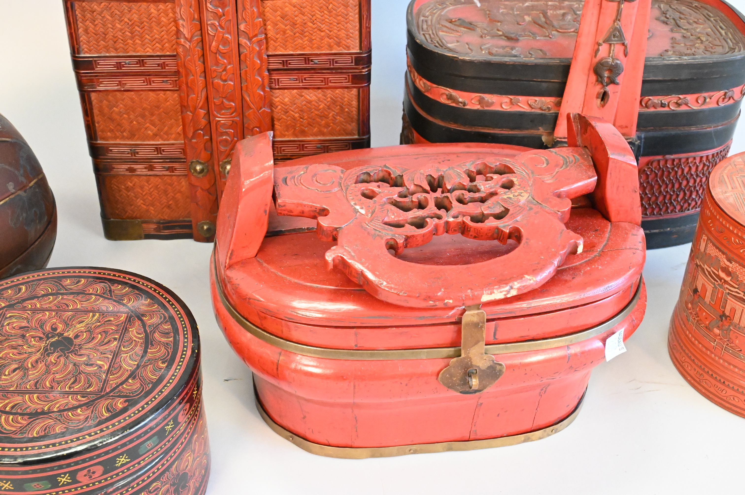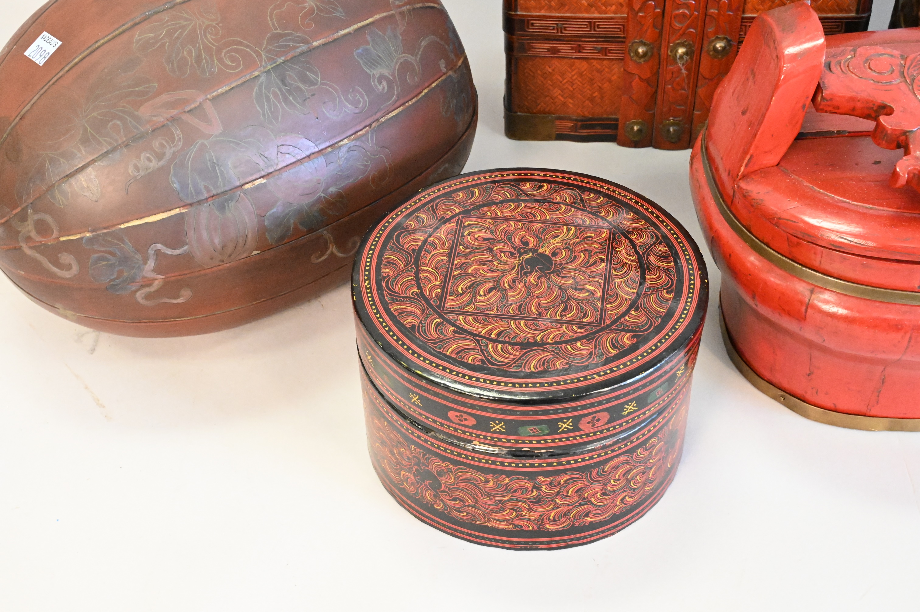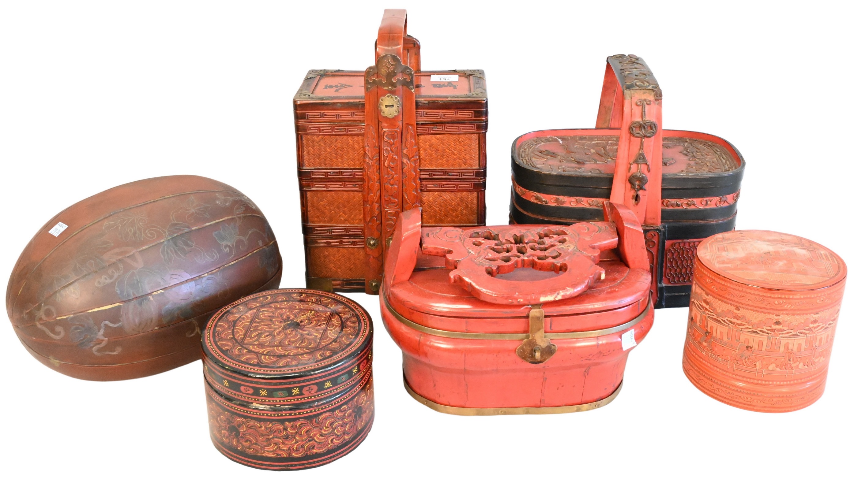 Six Piece Group, to include a red painted gourd box, wedding stacking box, two baskets with handles, two round boxes, etc.. tallest height 15 inches.