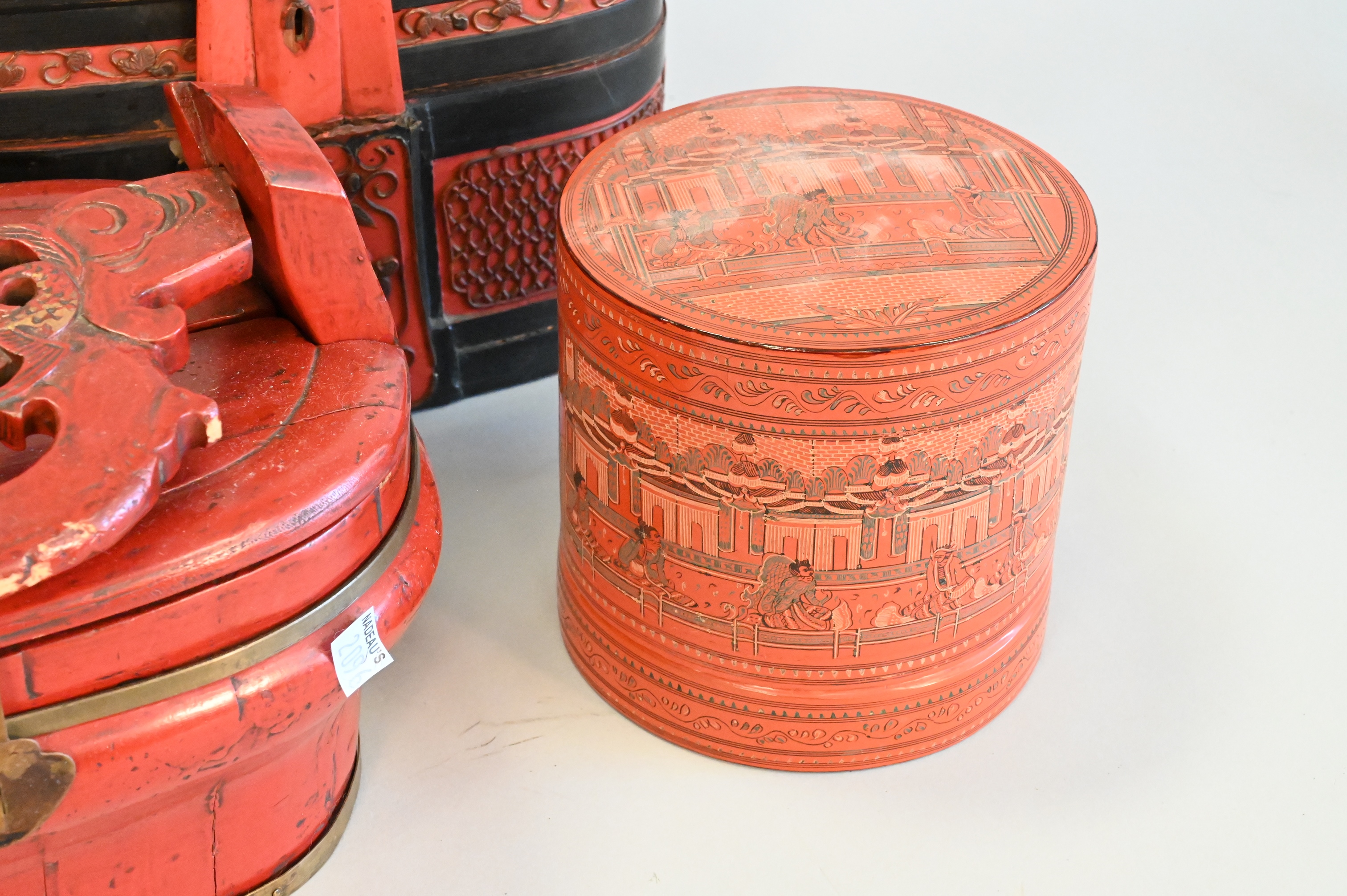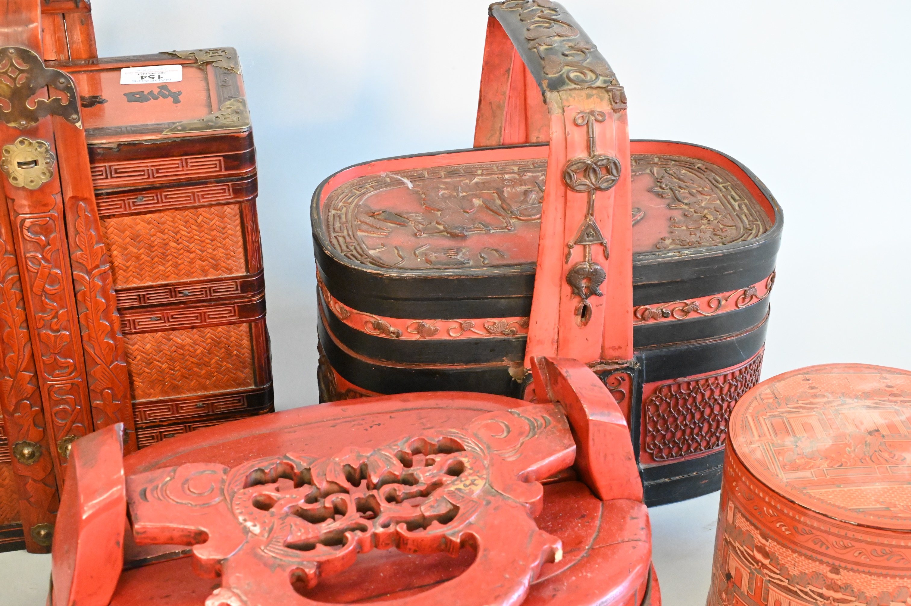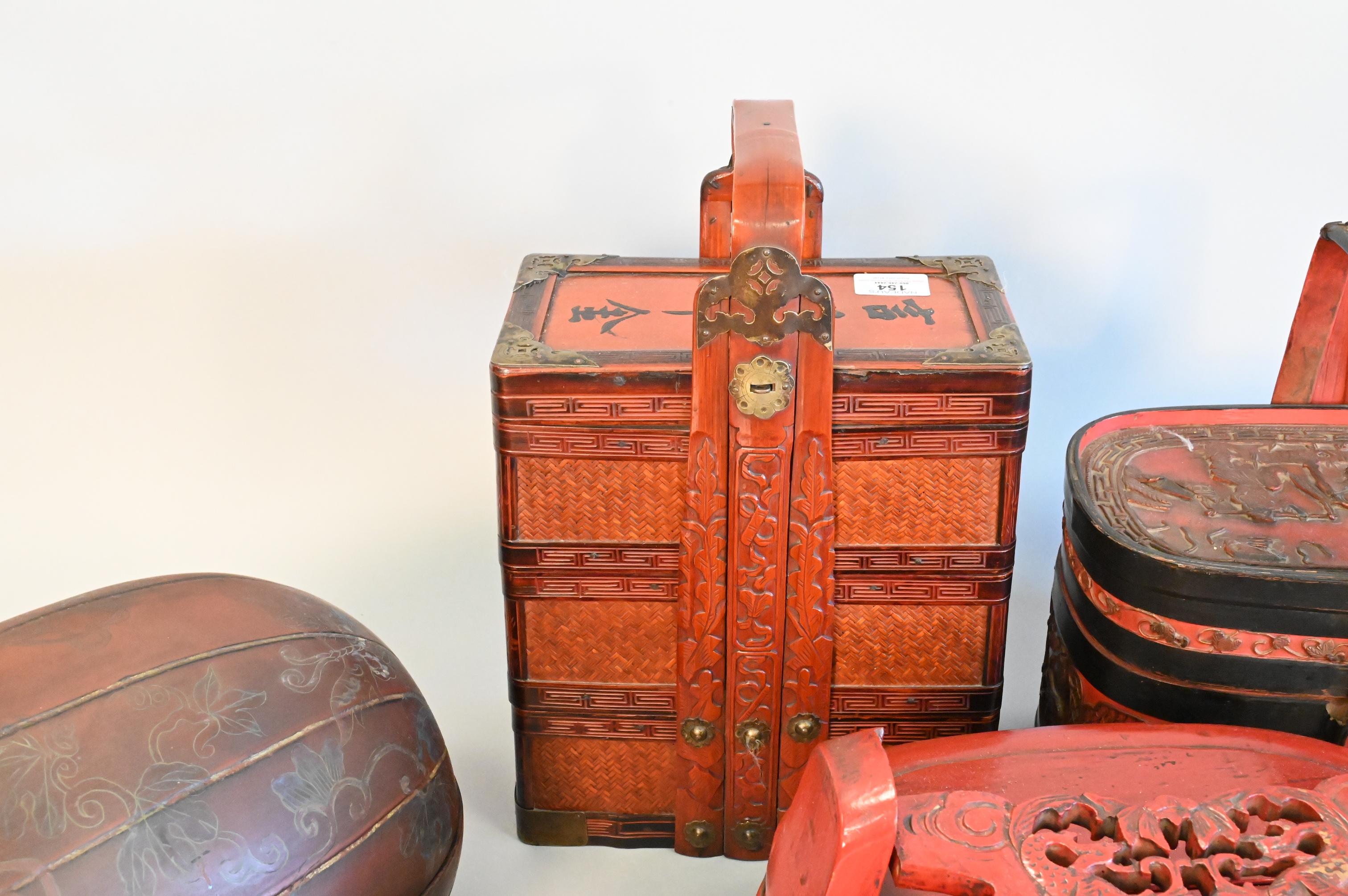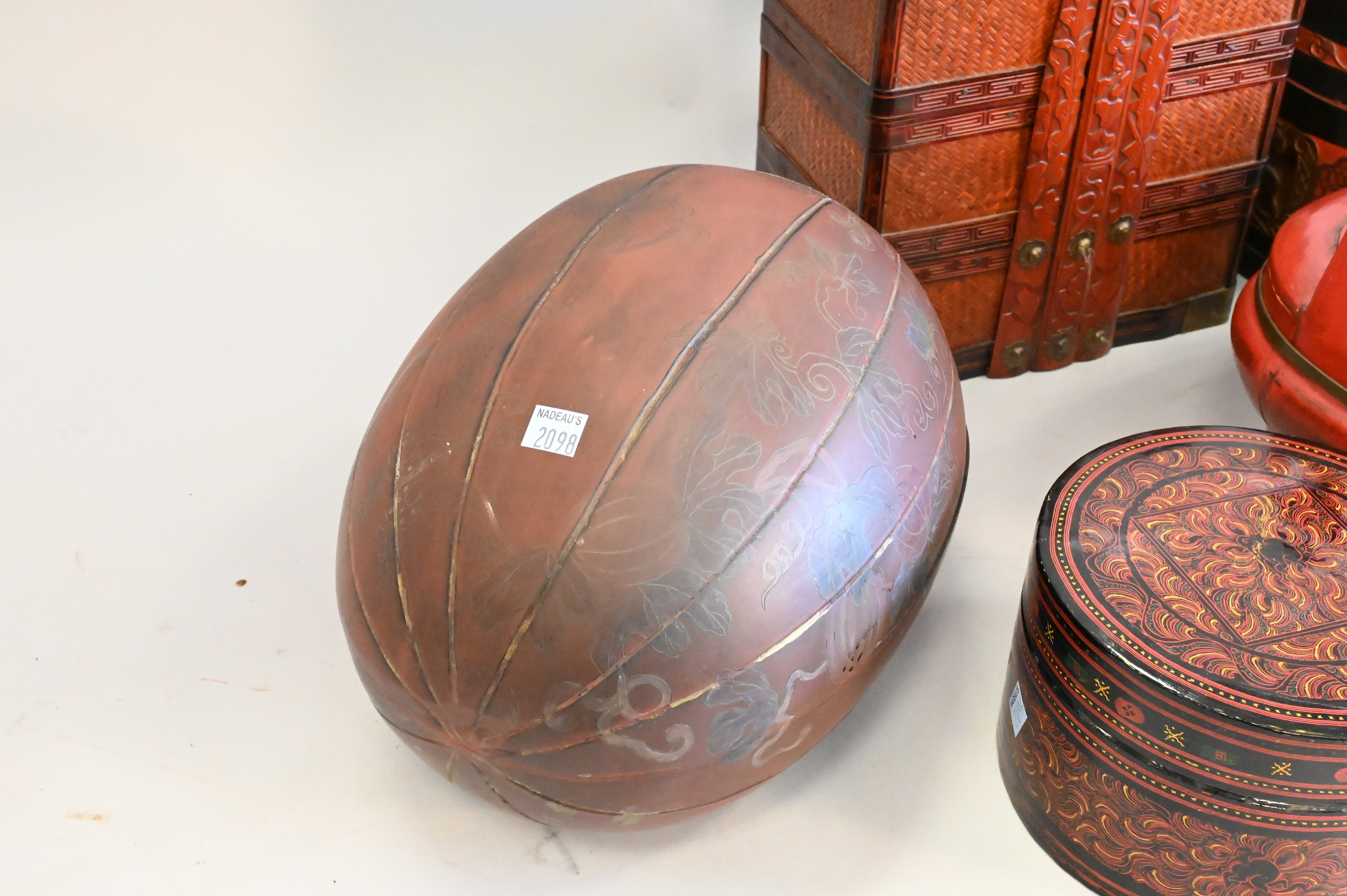 Six Piece Group, to include a red painted gourd box, wedding stacking box, two baskets with handles, two round boxes, etc.. tallest height 15 inches.