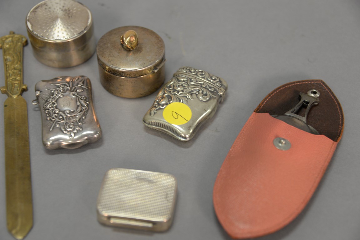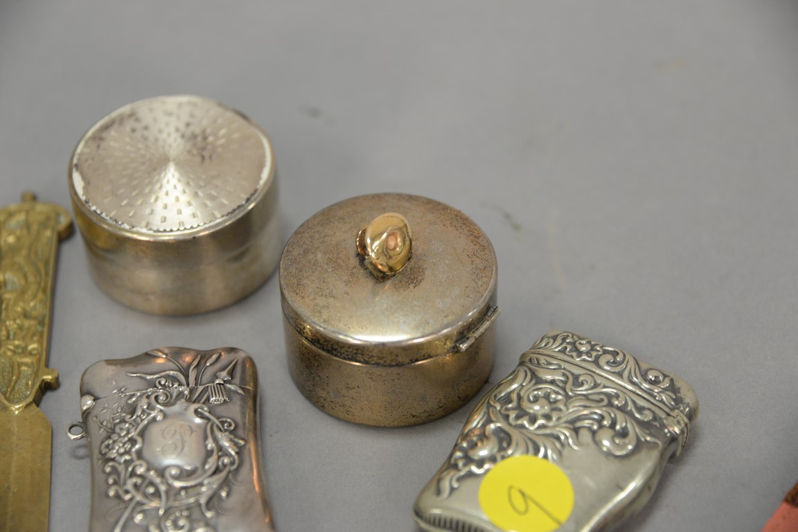 Lot 154: Six piece silver lot including match safes, cuff box with gold cuff top, double folding spoon, and folding German small scissors.
