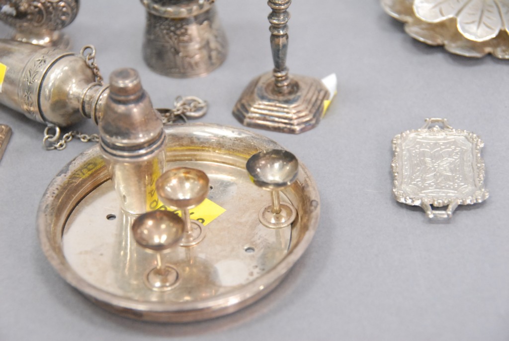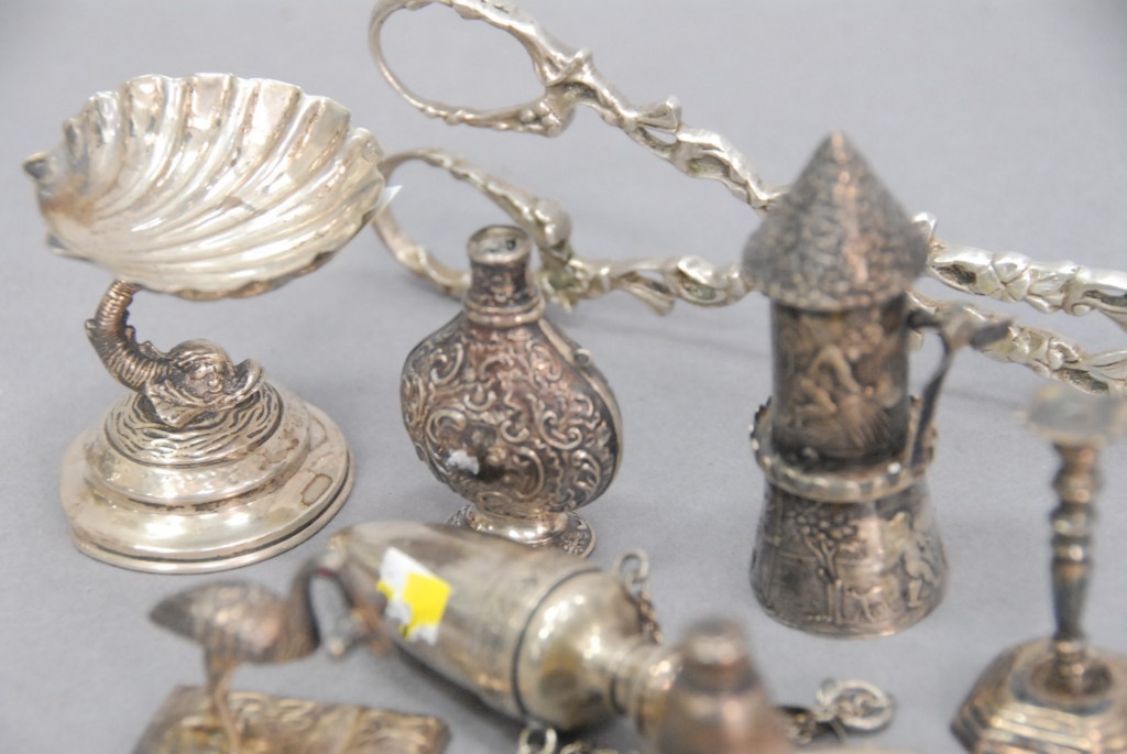 Lot 154: Sterling silver lot small windmill, cocktail shaker, candlestick, pair of tongs, perfume bottle, 12 t oz.