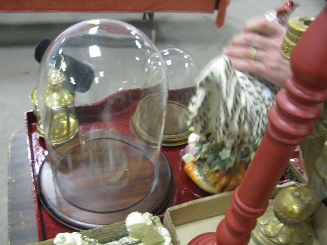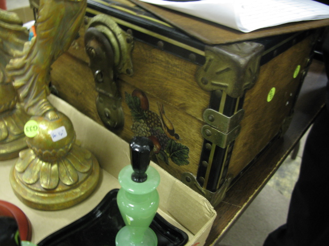 Three box lots and tray lot Fitz & Floyd rooster, painted lift top chest, 3 box lots with 2 domes, tea set, perfume bottles and small toys plus pair of figural candlesticks.