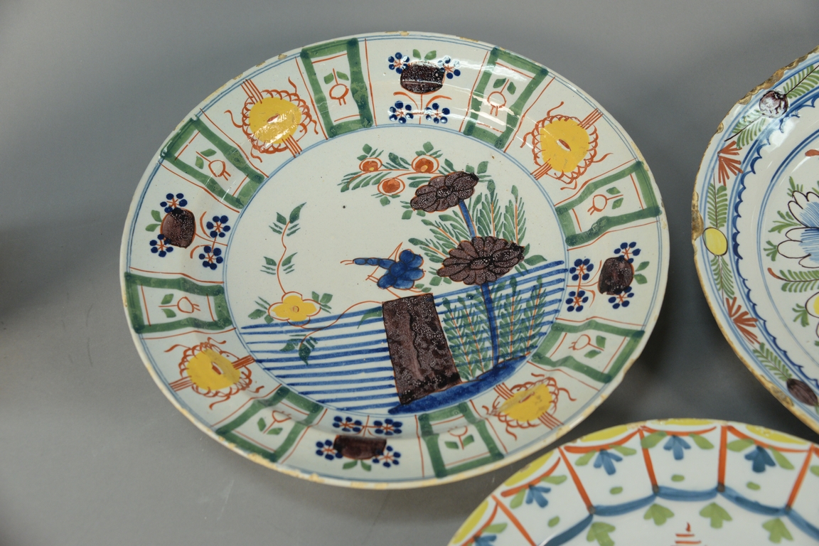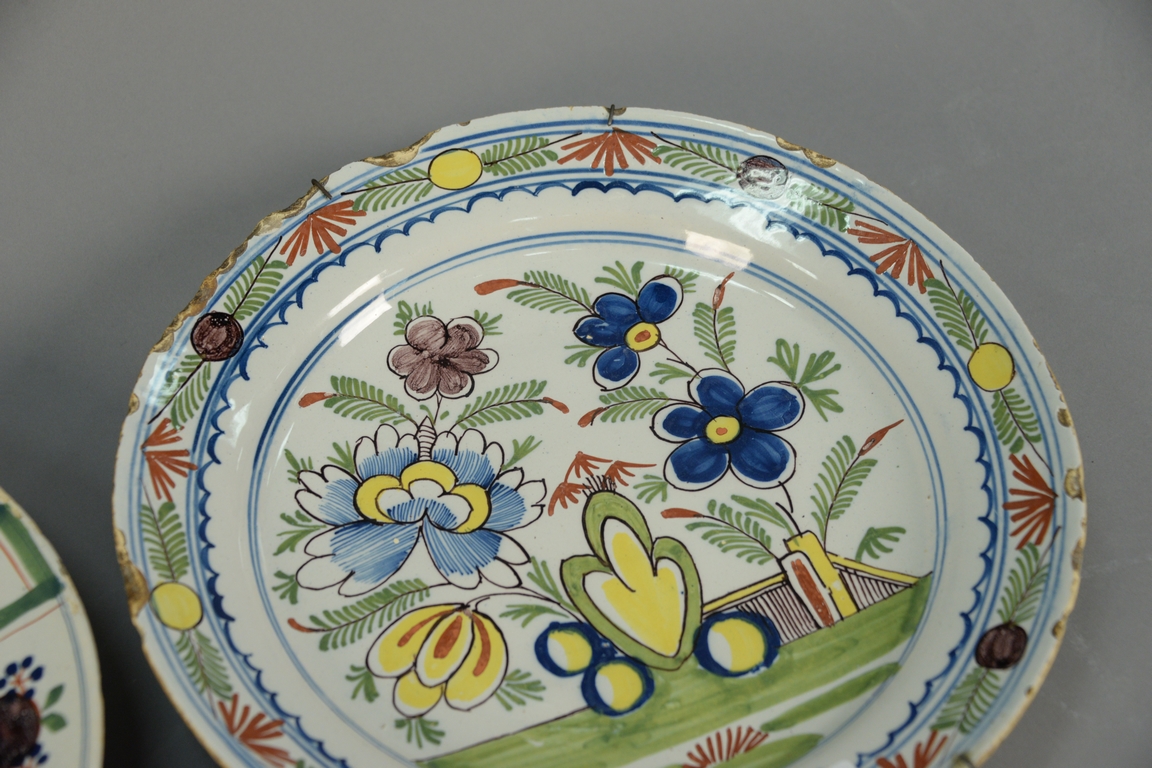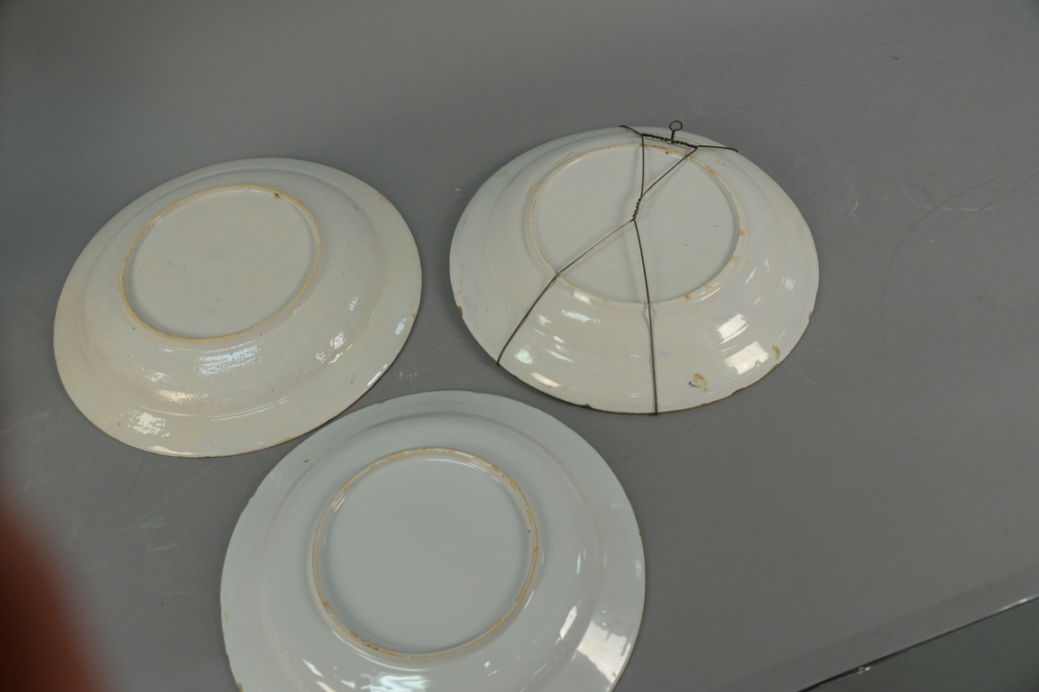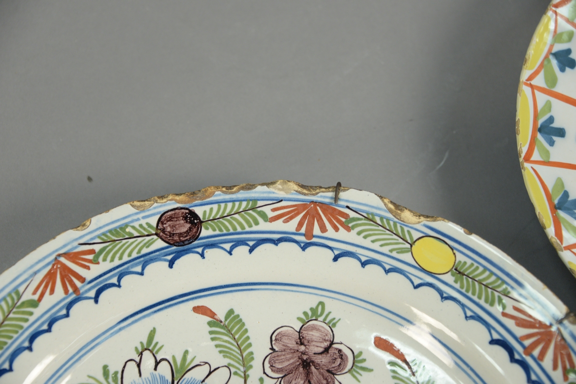 Three Delft Chargers with 4-5 colors 18th century rim chips 2 14in. 1 13in.