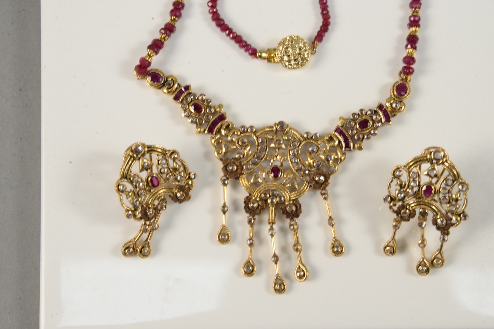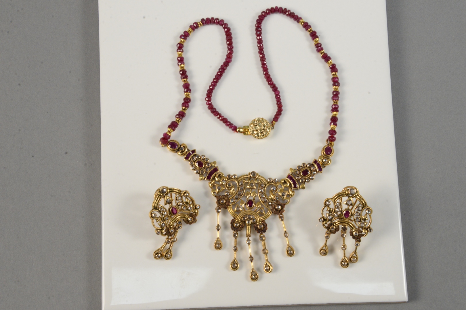 Lot 154: Three Piece 22 Karat Gold Necklace and Earrings set with rubies, and diamonds total weight 54.2 grams