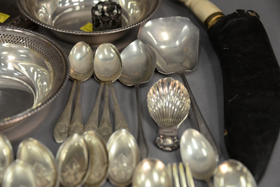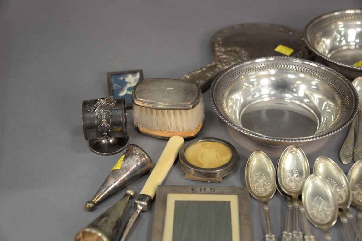 Lot 154: Tray lot of sterling and silverplate to include set of ten Victorian spoons, small picture frames, mirror, two small bowls, etc. 20….